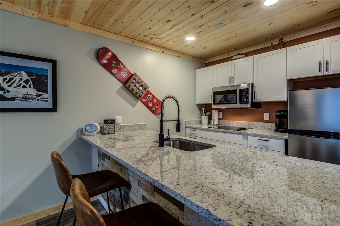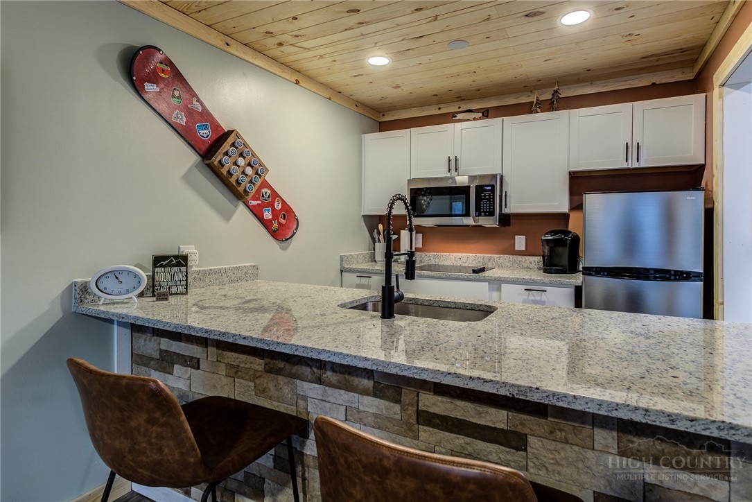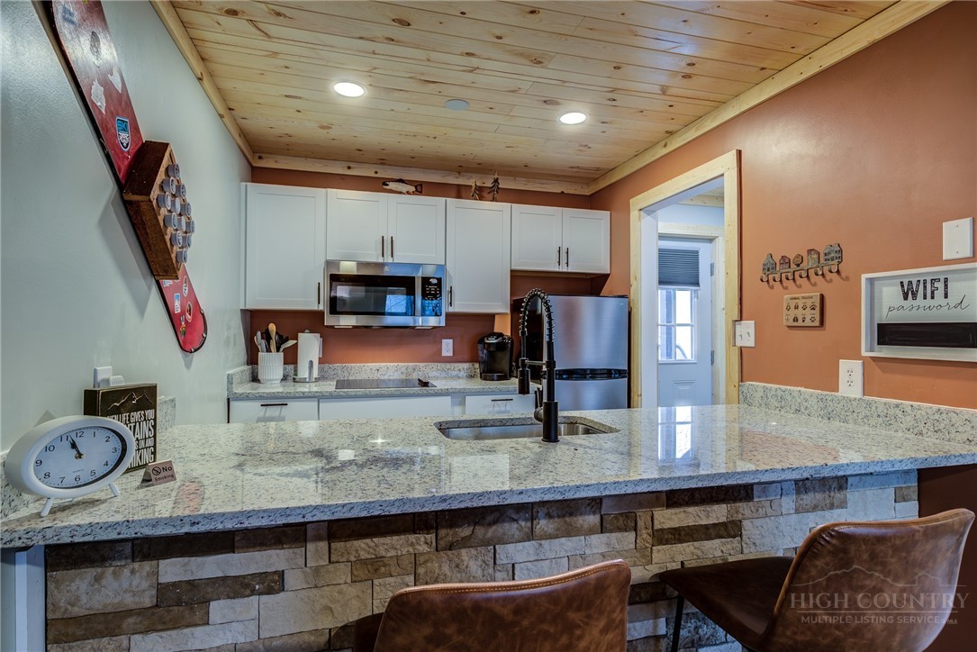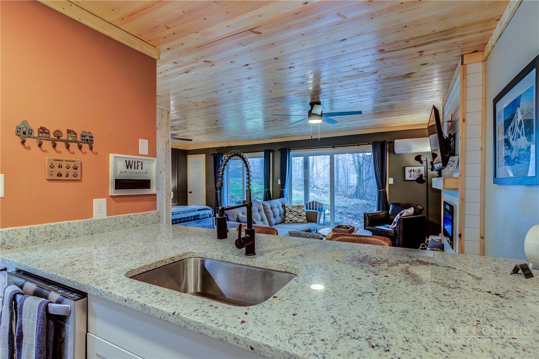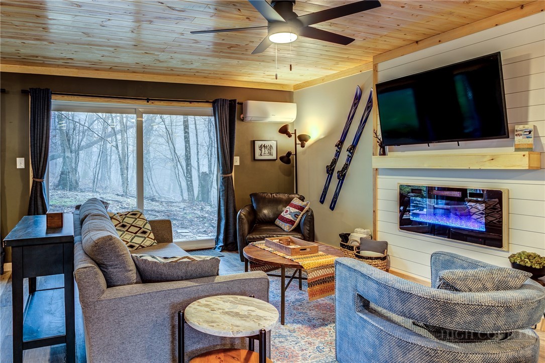 NEW NEW and more NEW! With a brand new interior that's beautifully designed, this studio-style unit offers a cozy and thoughtfully curated retreat for your perfect getaway. Every detail has been carefully updated to create a comfortable and inviting space with everything you need. Ideally located right next to Beech Mountain Ski Resort, you can walk straight to the slopes for an unforgettable Winter skiing experience. In the warmer months, bring your mountain bike and explore the scenic trails just steps away. The cozy living room is designed to feel just like home. Relax on comfortable seating in front of the stunning color-changing electric fireplace while watching your favorite shows on the new smart TV. Take in the peaceful surroundings as wildlife passes by through the new sliding glass doors, which open onto a small outdoor patio. The brand-new, fully equipped kitchen invites you to create something special during your stay. Featuring beautiful new countertops, modern cabinetry, and updated appliances, it offers everything you need to cook and dine with ease. After a day of mountain adventures, unwind in the tastefully furnished bedroom featuring a brand-new king-sized bed designed for ultimate comfort and relaxation. It’s the perfect retreat to rest and recharge for the next day’s activities. The newly updated bathroom connects directly to the bedroom and includes a walk-in shower, a beautiful vanity, fresh linens, and the added convenience of an in-unit washer and dryer—everything you need for a comfortable and stress-free stay. Looking to relax outdoors? Step onto your patio and take in the peaceful sounds of a babbling mountain stream in a lovely wooded setting. Surrounded by beautiful Beech trees and natural boulders, you may even catch a glimpse of local wildlife as you unwind in this tranquil escape. You’ll also enjoy convenient access to nearby favorites in this corner unit on the lower level, including a coffee shop, Fred’s, mini golf, and the Famous Brick Oven Pizzeria—making it easy to relax, dine, and explore during your stay. Beech offers hiking trails, you can join Beech Mountain Club and enjoy all of it's amenities, explore the Land of OZ, experience the Beech Mountain Summer Concert Series and so much more!