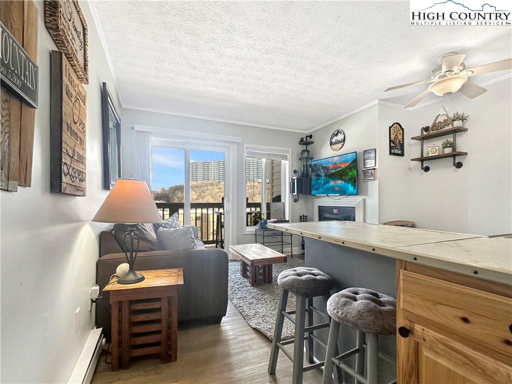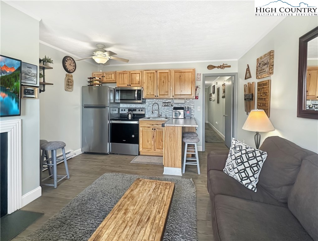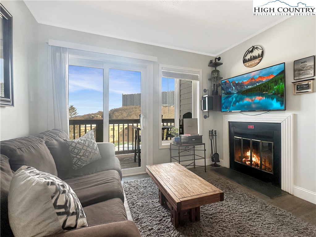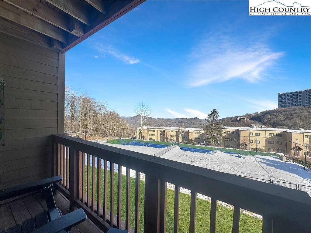 Welcome to Sugar Ski & Country Club Unit 114 — a turn-key, fully furnished 1-bedroom condo with bonus bunk sleeping area, perfectly positioned for cool summers and snowy winter getaways at 5,000’ elevation! This inviting mountain retreat offers an open kitchen and living area with bar seating, a cozy wood-burning fireplace, and a flat screen TV, all complemented by long-range mountain views overlooking the tennis court. Step outside to the covered porch and enjoy the fresh High Country air with views of the clubhouse, tennis/pickleball court, and distant ridgelines—a perfect spot for morning coffee or unwinding after a day on the slopes. The condo has seen recent updates and is being sold fully furnished, making it an easy choice for personal use, a vacation escape, or immediate rental potential. Sugar Ski & Country Club is a gated community with on-site management and offers an unbeatable ski-in/ski-out lifestyle with direct slope access. The Clubhouse (opened May 2021) features an indoor heated pool, sauna, hot tub, and fitness room, plus seasonal enjoyment of tennis and pickleball. Each building also includes outdoor grills and picnic tables for convenient mountain cookouts. Just minutes from everything the High Country is known for—golf, hiking, biking, the alpine coaster, Grandfather Mountain, the Blue Ridge Parkway, and more—Unit 114 delivers the ultimate blend of comfort, convenience, and year-round adventure.