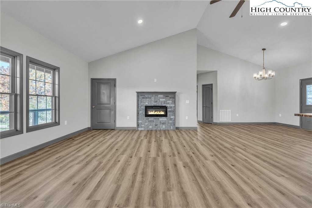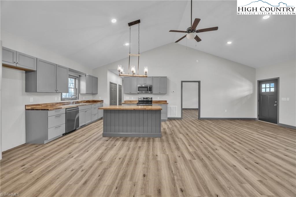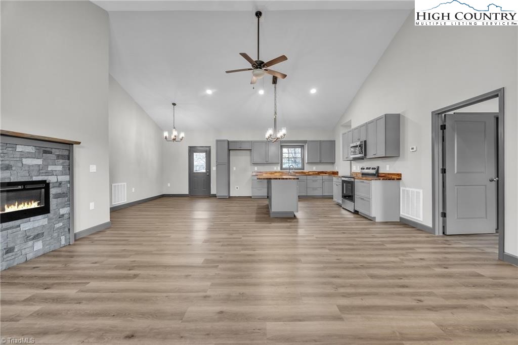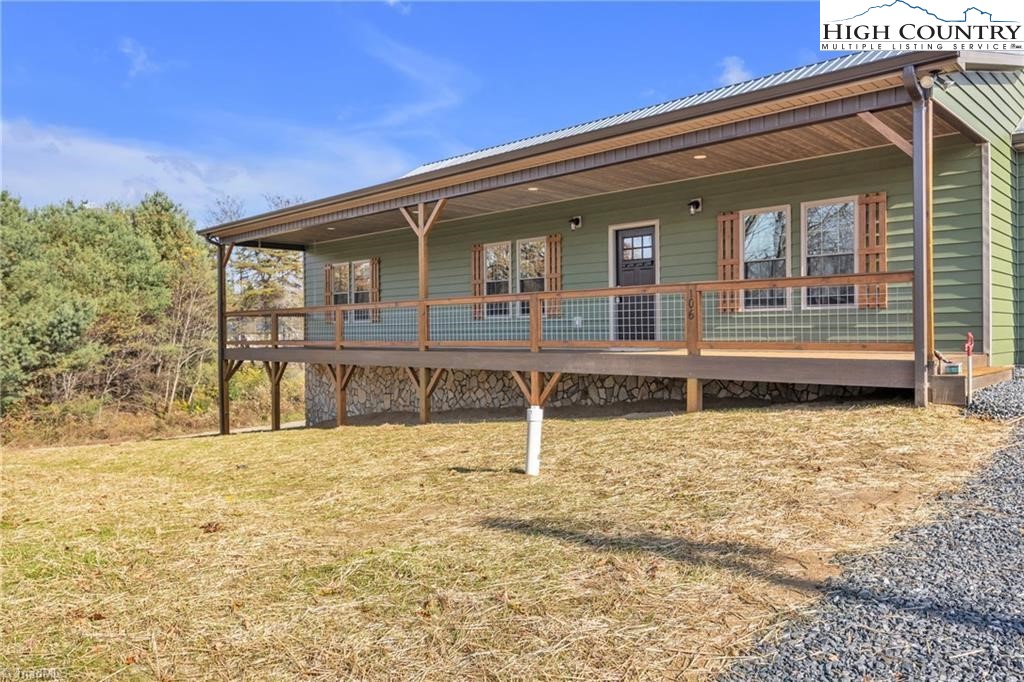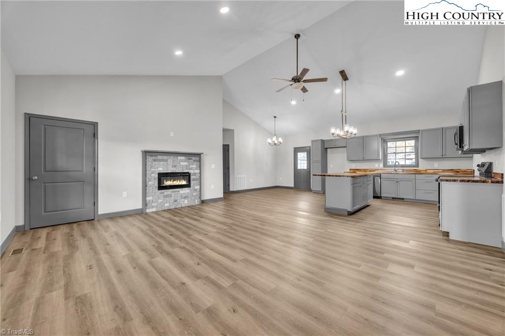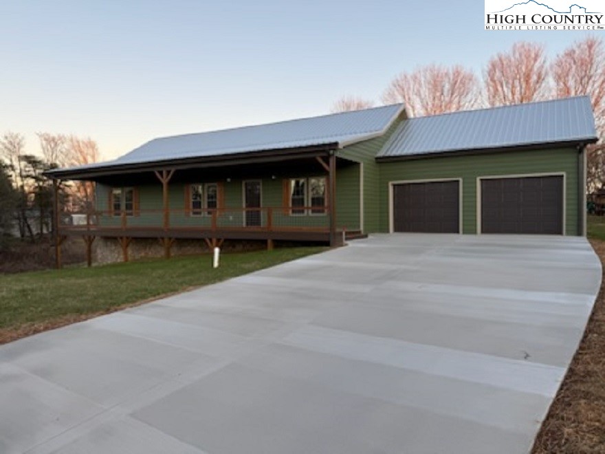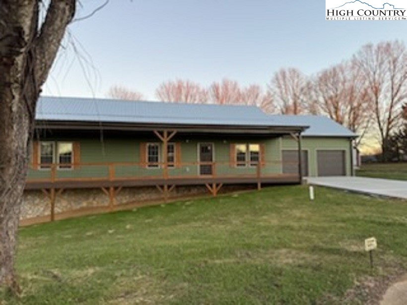 New construction wiith open floor plan with split bedrooms. Large primary bath with double sinks. Home exterior is insulated vinyl siding. Floors are LVT flooring throughout. Large front porch with wire railing. Butcher block island in kitchen and also on the kitchen. Stone foundation. Large 24X24 double garage. Electric fireplace on wall in living room with Faux stone. Metal Roof. Trex decking on back.