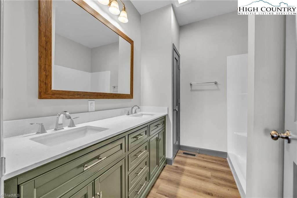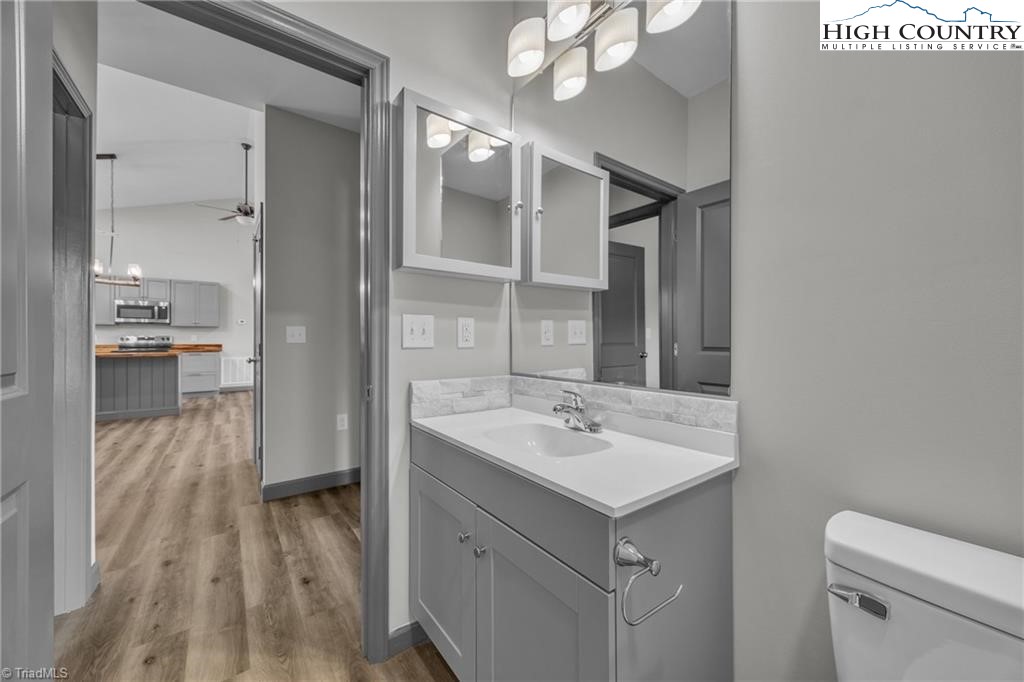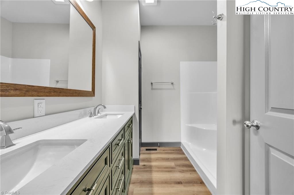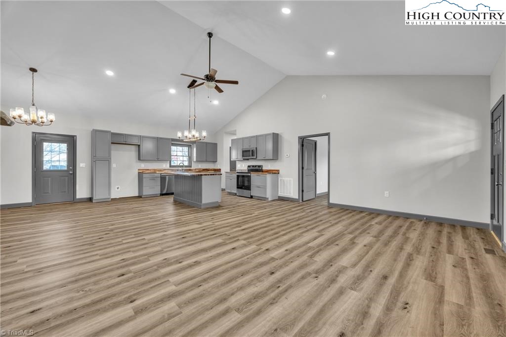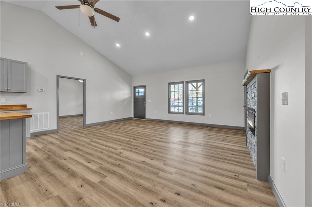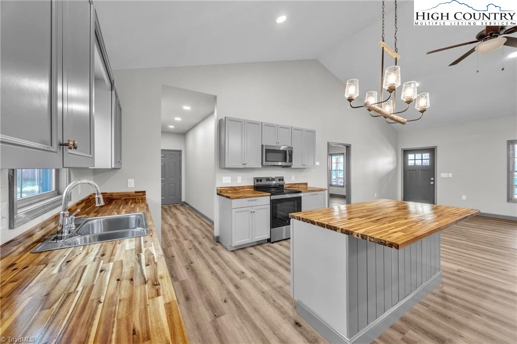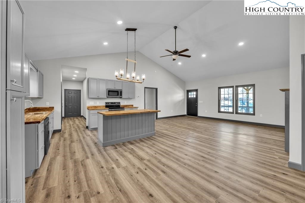New construction wiith open floor plan with split bedrooms. Large primary bath with double sinks. Home exterior is insulated vinyl siding. Floors are LVT flooring throughout. Large front porch with wire railing. Butcher block island in kitchen and also on the kitchen. Stone foundation. Large 24X24 double garage. Electric fireplace on wall in living room with Faux stone. Metal Roof. Trex decking on back.