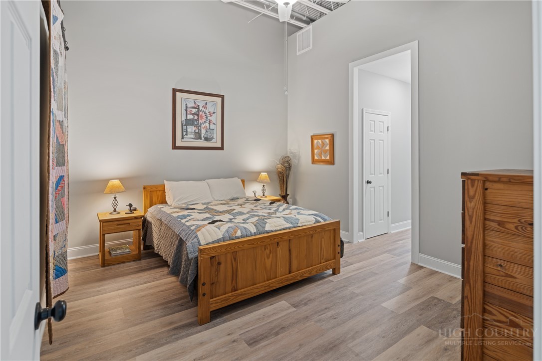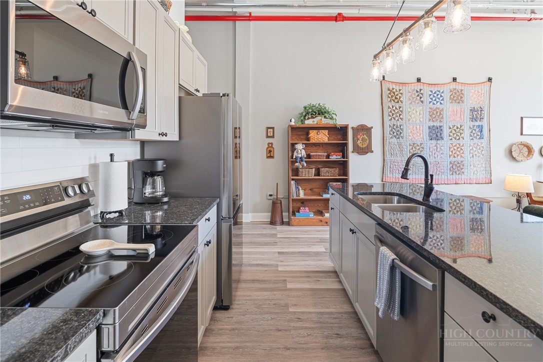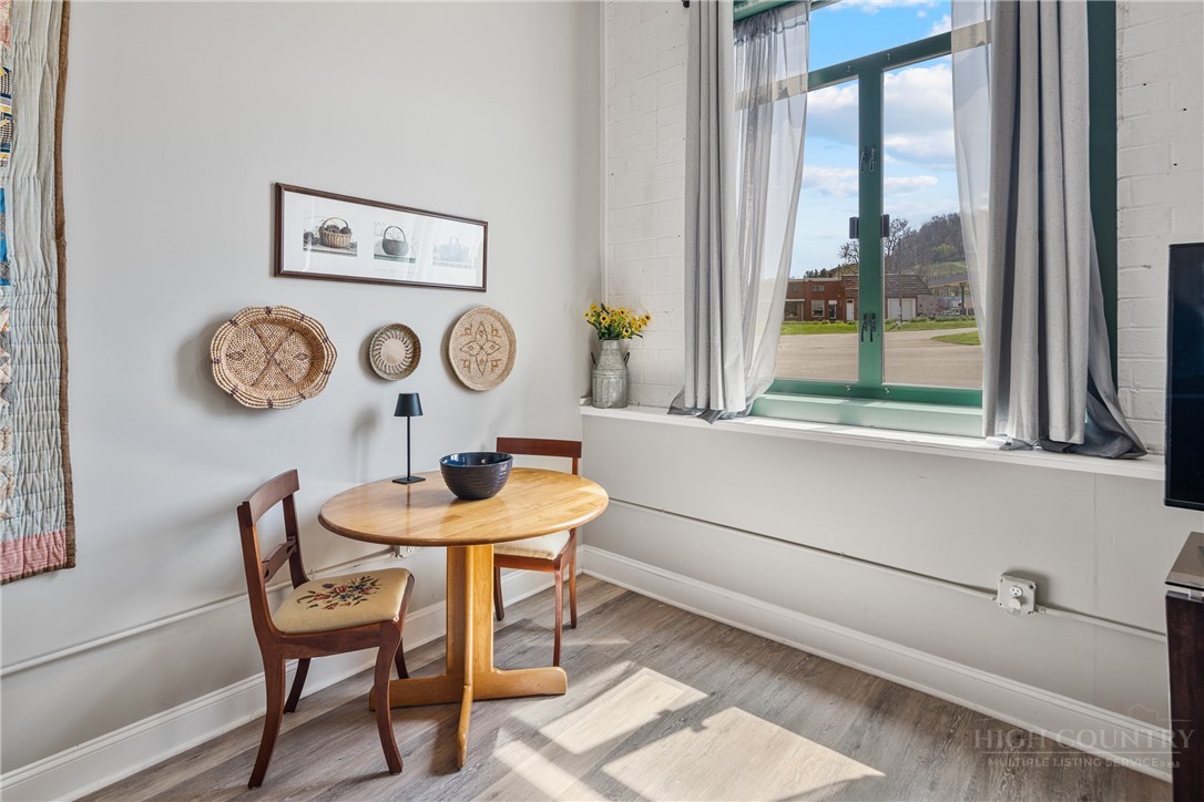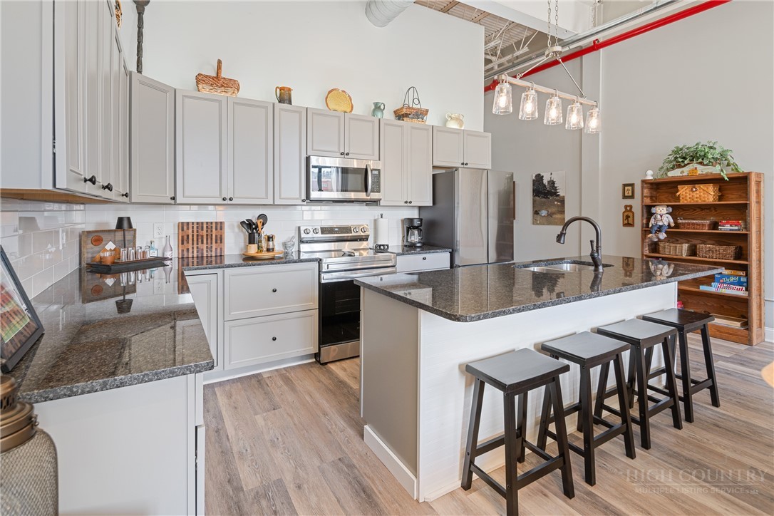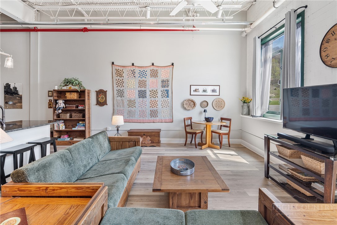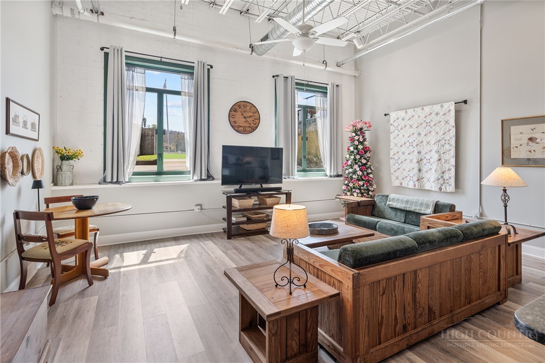 EXPERIENCE THE CONVENIENCE OF DOWNTON LIVING - Escape the heat this summer and enjoy the best of mountain living in the heart of Downtown West Jefferson. This easily accessible first floor condo is the perfect location for a primary residence or vacation home. Completed in 2023, this unit is in impeccable condition! ONE LEVEL LIVING - So spacious with soaring ceilings and an open floor plan. Everyone will feel right at home in this 3 bedroom, 2 bathroom condo. Kitchen features granite countertops, large center island with seating, lots of cabinet storage, and stainless appliances. The thoughtfully designed Primary Bedroom Suite features two walk-in closets and ensuite bathroom with soaking tub, walk-in shower and double vanity. Continuous Luxury Vinyl Plank Flooring throughout. Large laundry closet with additional storage. Loft storage as well. With no yard maintenance to worry about, spend all your leisure time exploring historic downtown West Jefferson with quaint local shops, art galleries, fine dining, coffee shops, breweries, winery, parks, farmer’s market, library, cheese factory, and movie theater. Outdoor enthusiast? Kayak/fish/float the New River, hike local trails, play disc golf at Ashe Park, then store your gear in the lockable storage unit just across the hall. Pet friendly w/fenced dog area. Grilling Area. Two assigned parking spaces + guest parking. Make this your weekend getaway! Conveniently located only 1.5 hours from Winston, 2 hours from Greensboro & Charlotte, and 3 hours from Raleigh.