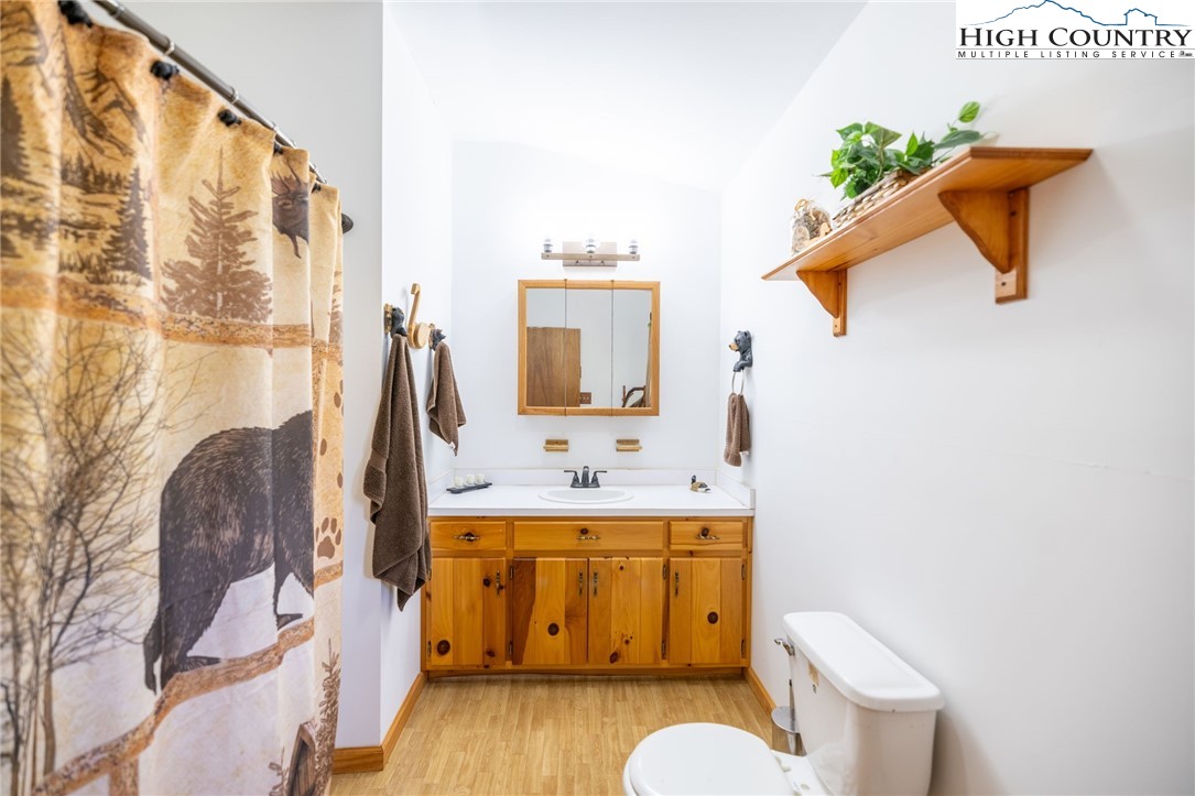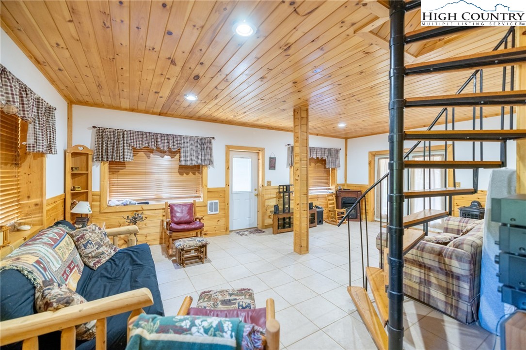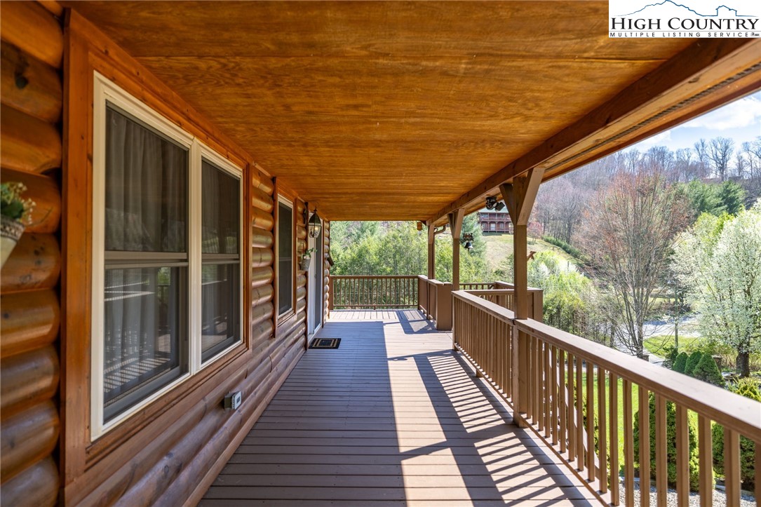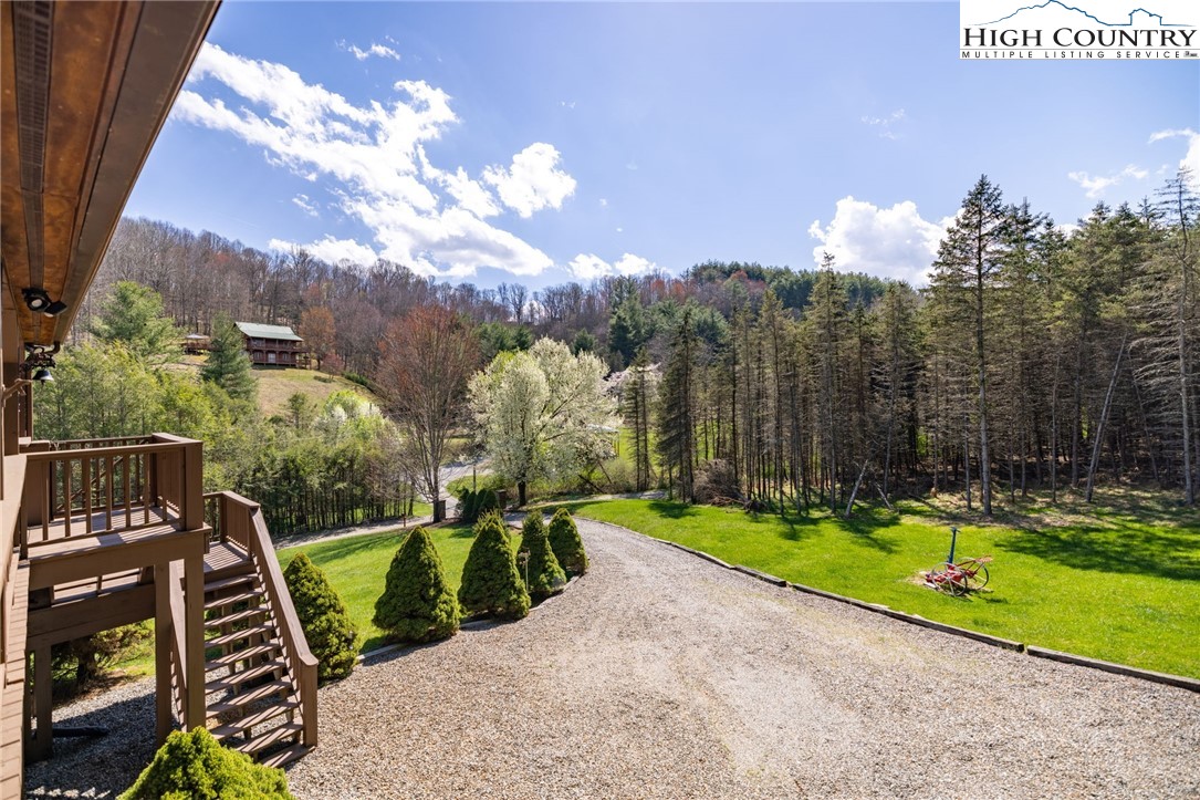 Perched on a scenic knoll, this inviting log-sided home offers peace, privacy, and nice views across nearly 3 acres. The property includes three additional building sites, all overlooking a serene community pond. Nestled in a quiet gated community in northern Alleghany County—just minutes from the New River and close to the Virginia state line—this home is a true mountain retreat.The gently rolling terrain is rich with wildlife and features access to four community ponds, perfect for nature lovers. Inside, the main level boasts tongue-and-groove interior finishes, and multiple windows that fills the space with natural light, and hardwood floors in the great room. A stunning stone fireplace creates a cozy centerpiece, while the kitchen offers newer stainless steel appliances—including a wine refrigerator. The main-level primary bedroom and bath provide convenient one-level living, while the open loft upstairs features a second bedroom and full bath. A unique spiral staircase leads to the lower-level den with more tongue-and-groove charm and its own private entrance—ideal for guests or a separate living space.The basement garage includes a washer and dryer, plus room for tools or equipment. Two separate driveways on either side of the house add to the home's functionality and flexibility. Enjoy outdoor living year-round with a mix of covered and open-air spaces. Located approximately 30 minutes from West Jefferson and Sparta, and less than 20 minutes to Independence, VA. Grayson Highlands State Park is just a short 15–20 minute drive away.