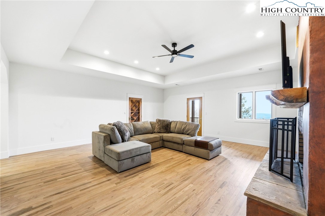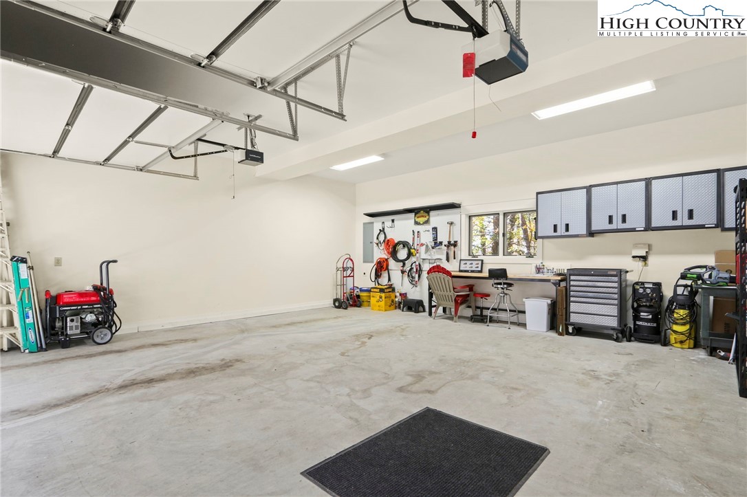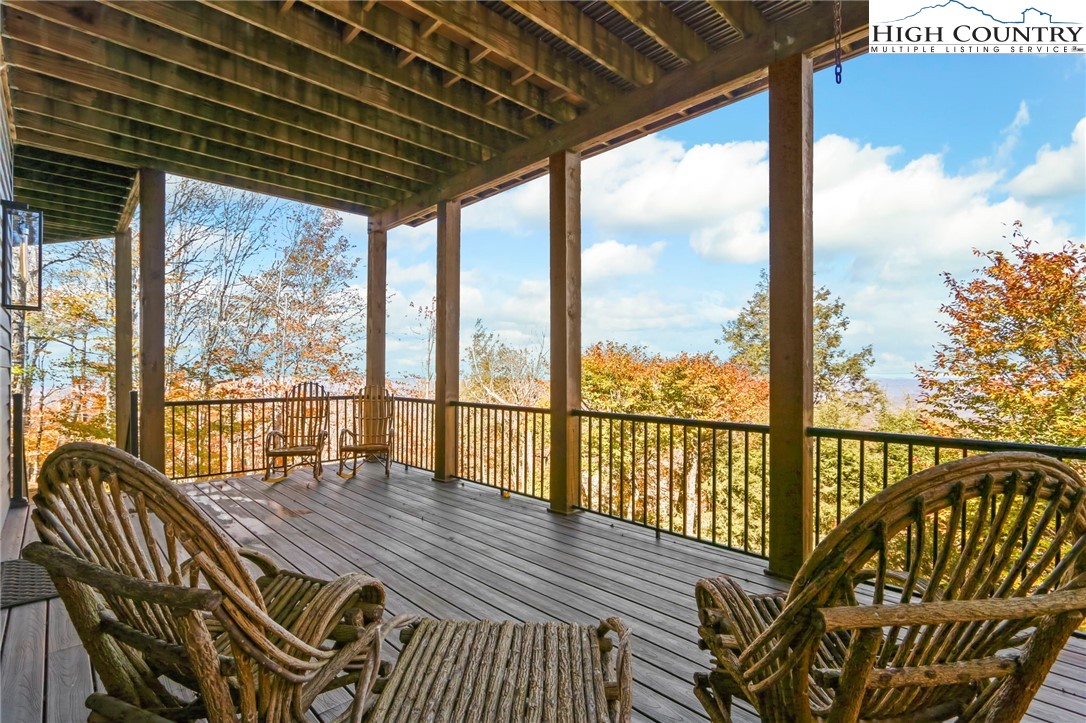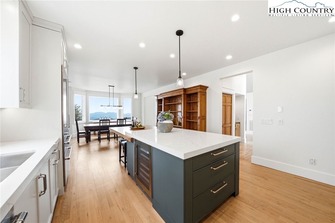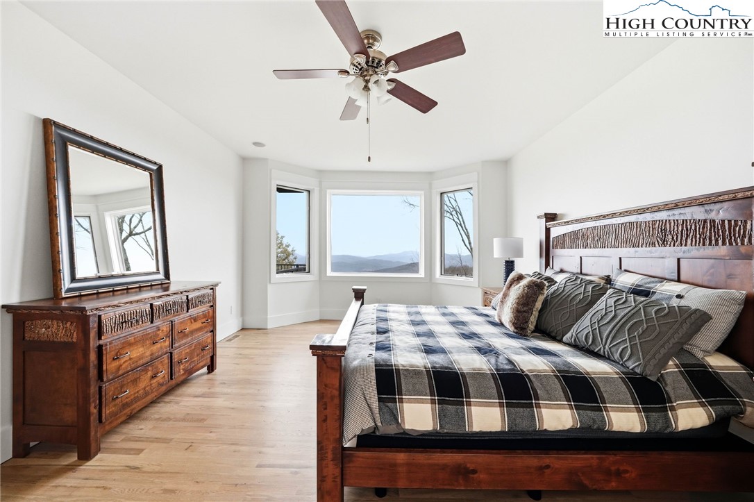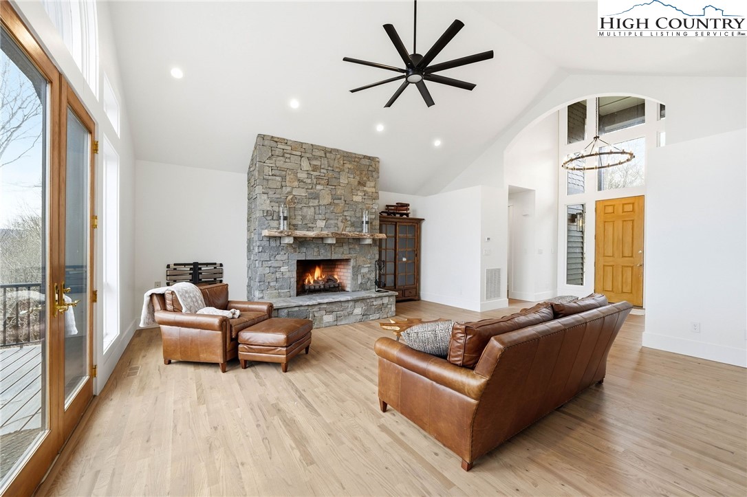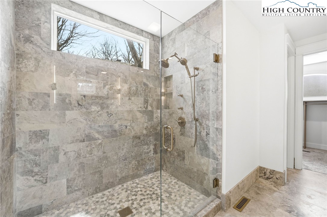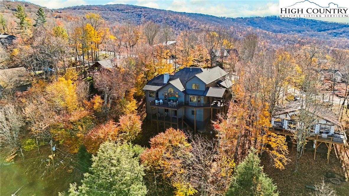 Experience mountain living in this beautifully renovated home on Beech Mountain, offering expansive 280° layered mountain views. Thoughtfully updated inside and out, this residence combines modern finishes with timeless comfort. The main level features large picture windows showcasing the sweeping views from the living room, kitchen, and primary suite. The brand-new kitchen includes custom cabinetry by Distinctive Cabinetry, quartz countertops, a coordinating quartz backsplash, and new appliances. The interior has been freshly painted throughout, and the primary bathroom has been completely redesigned with new tile flooring, heated floors, updated cabinetry, and quartz countertops. The living area centers around a new stone fireplace with a handcrafted Rustik mantle, complemented by additional stonework added to the exterior façade. The exterior has been fully refreshed with new paint, new lighting, and updated landscaping. The lower level provides a second stone fireplace, a custom wine cellar, a spacious workshop/flex room great for exercise or hobbies, and an additional en-suite bedroom. A generous two-car garage completes the property, offering ample storage and convenience.