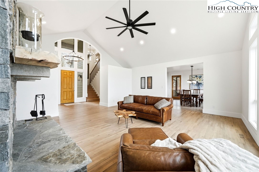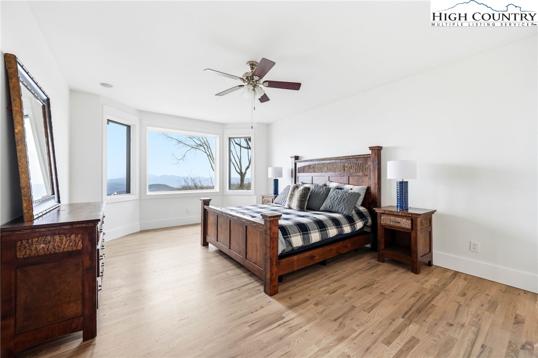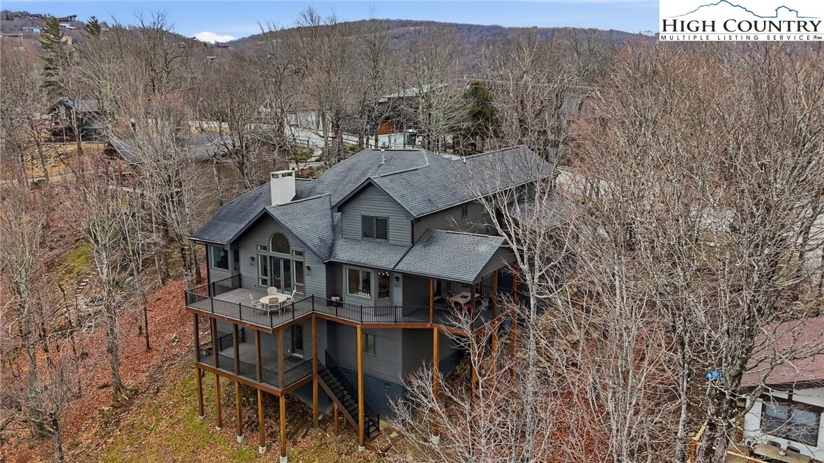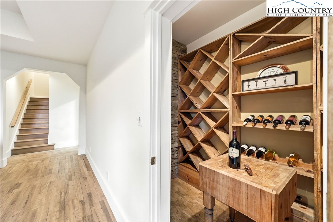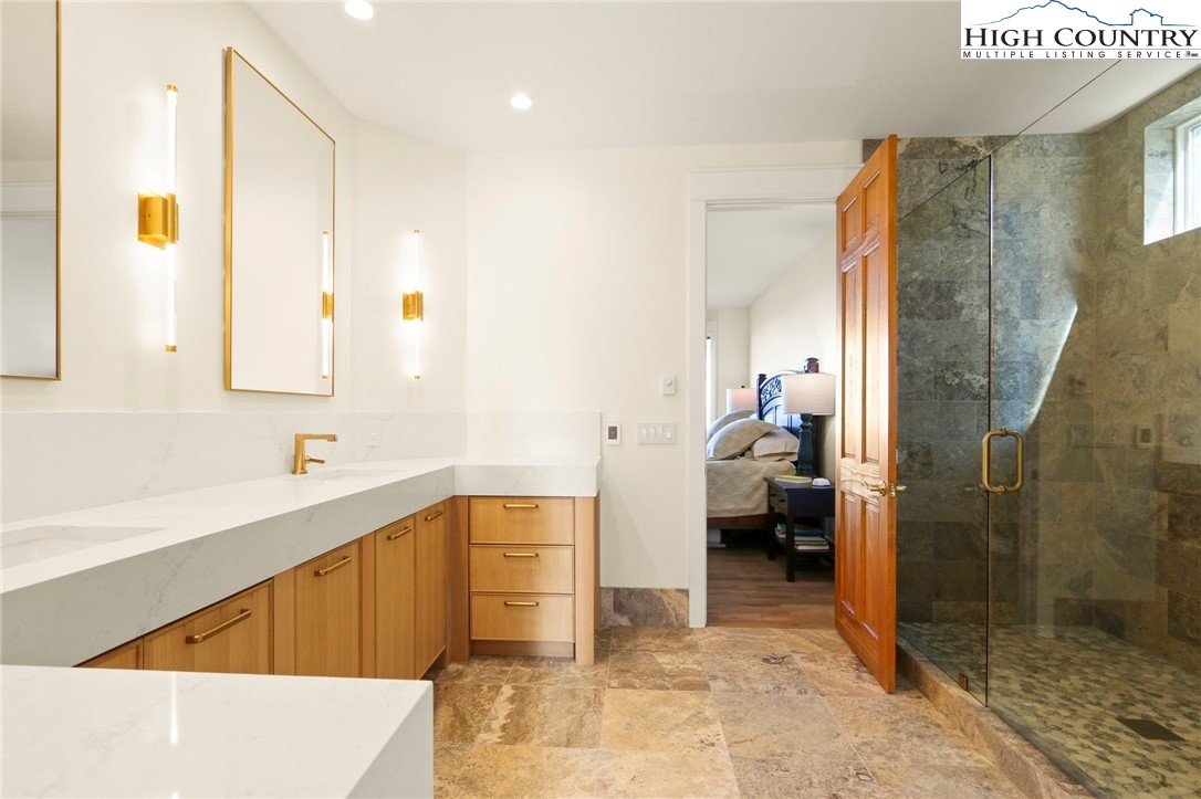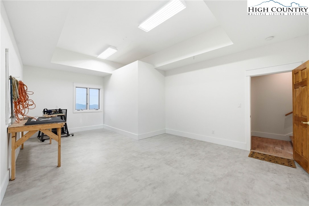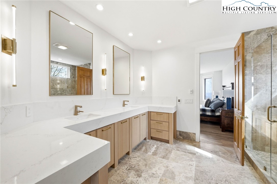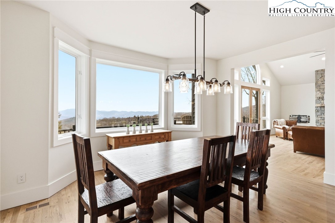Experience mountain living in this beautifully renovated home on Beech Mountain, offering expansive 280° layered mountain views. Thoughtfully updated inside and out, this residence combines modern finishes with timeless comfort. The main level features large picture windows showcasing the sweeping views from the living room, kitchen, and primary suite. The brand-new kitchen includes custom cabinetry by Distinctive Cabinetry, quartz countertops, a coordinating quartz backsplash, and new appliances. The interior has been freshly painted throughout, and the primary bathroom has been completely redesigned with new tile flooring, heated floors, updated cabinetry, and quartz countertops. The living area centers around a new stone fireplace with a handcrafted Rustik mantle, complemented by additional stonework added to the exterior façade. The exterior has been fully refreshed with new paint, new lighting, and updated landscaping. The lower level provides a second stone fireplace, a custom wine cellar, a spacious workshop/flex room great for exercise or hobbies, and an additional en-suite bedroom. A generous two-car garage completes the property, offering ample storage and convenience.