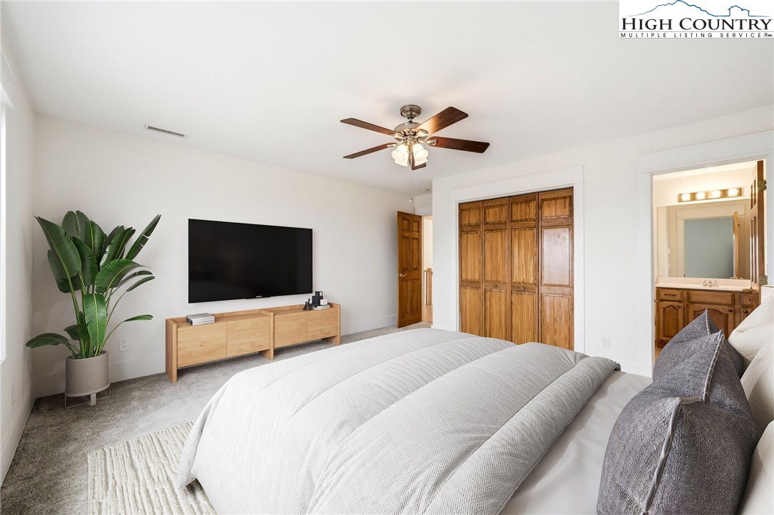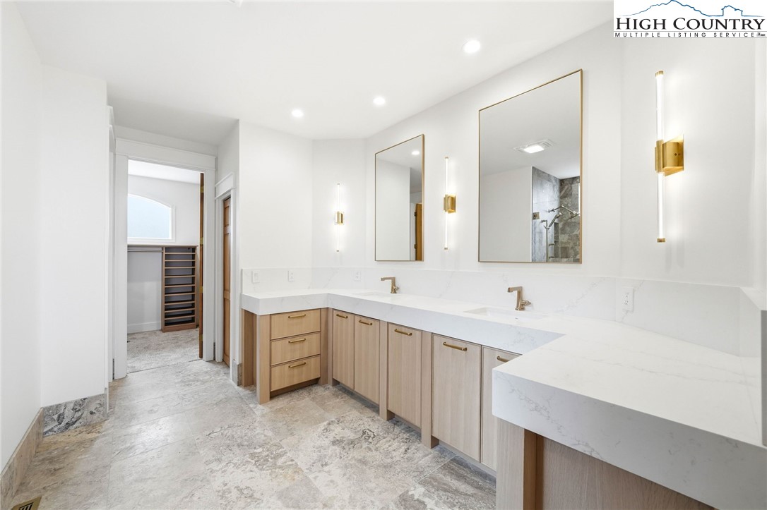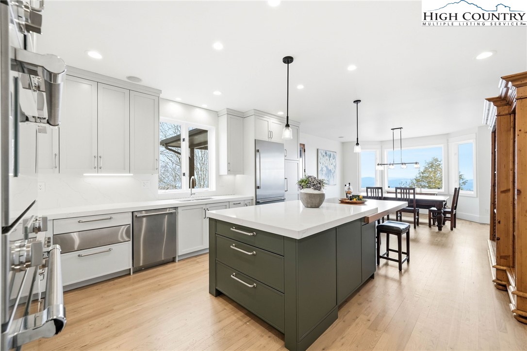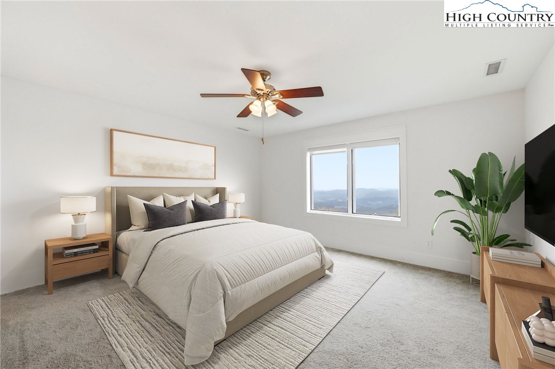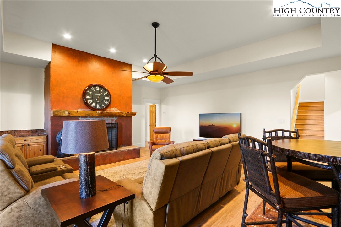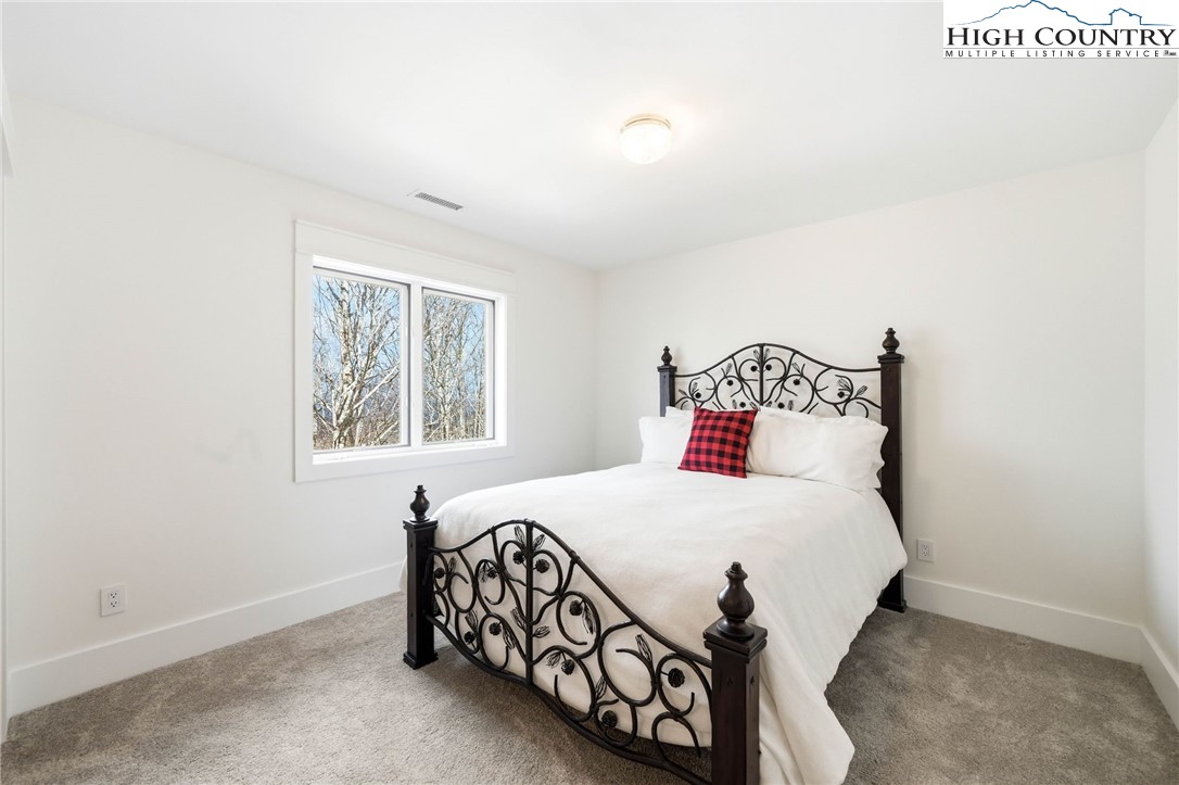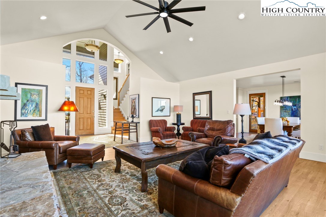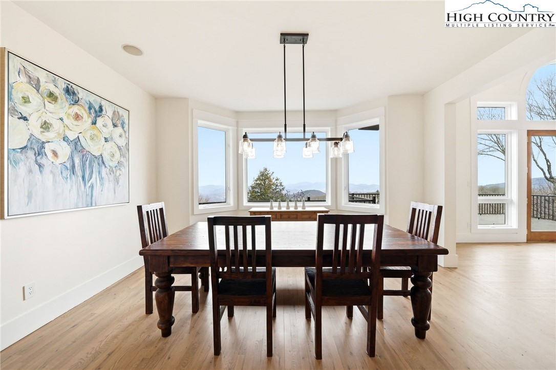 Experience mountain living in this beautifully renovated home on Beech Mountain, offering expansive 280° layered mountain views. Thoughtfully updated inside and out, this residence combines modern finishes with timeless comfort. The main level features large picture windows showcasing the sweeping views from the living room, kitchen, and primary suite. The brand-new kitchen includes custom cabinetry by Distinctive Cabinetry, quartz countertops, a coordinating quartz backsplash, and new appliances. The interior has been freshly painted throughout, and the primary bathroom has been completely redesigned with new tile flooring, heated floors, updated cabinetry, and quartz countertops. The living area centers around a new stone fireplace with a handcrafted Rustik mantle, complemented by additional stonework added to the exterior façade. The exterior has been fully refreshed with new paint, new lighting, and updated landscaping. The lower level provides a second stone fireplace, a custom wine cellar, a spacious workshop/flex room great for exercise or hobbies, and an additional en-suite bedroom. A generous two-car garage completes the property, offering ample storage and convenience.