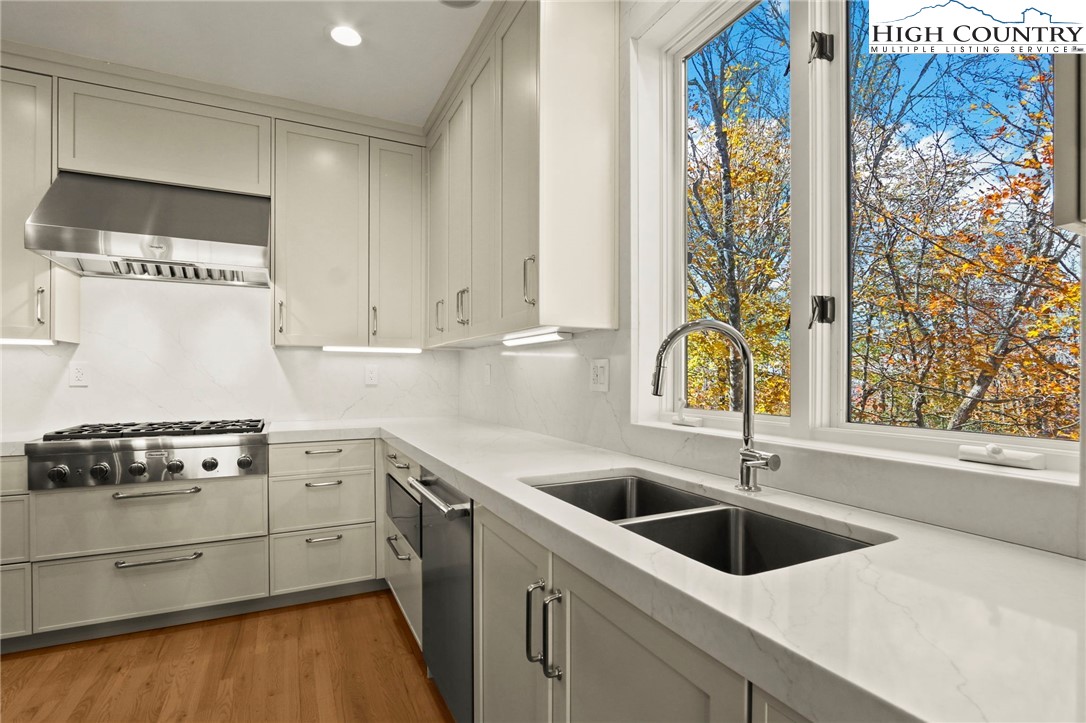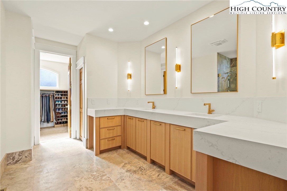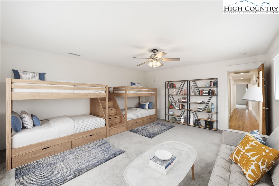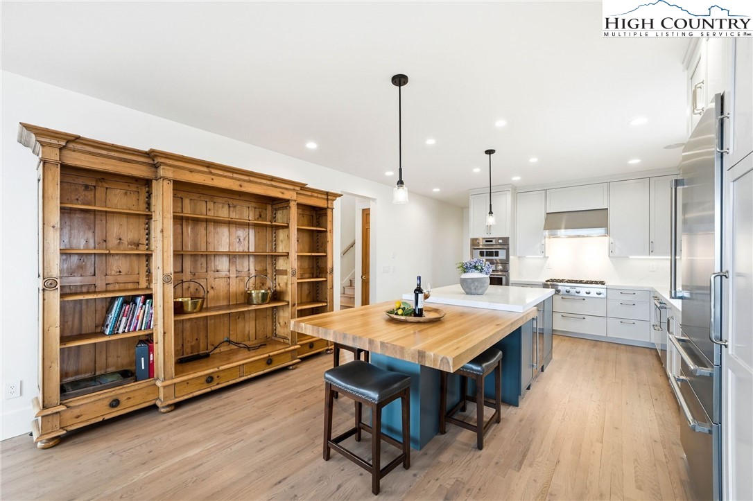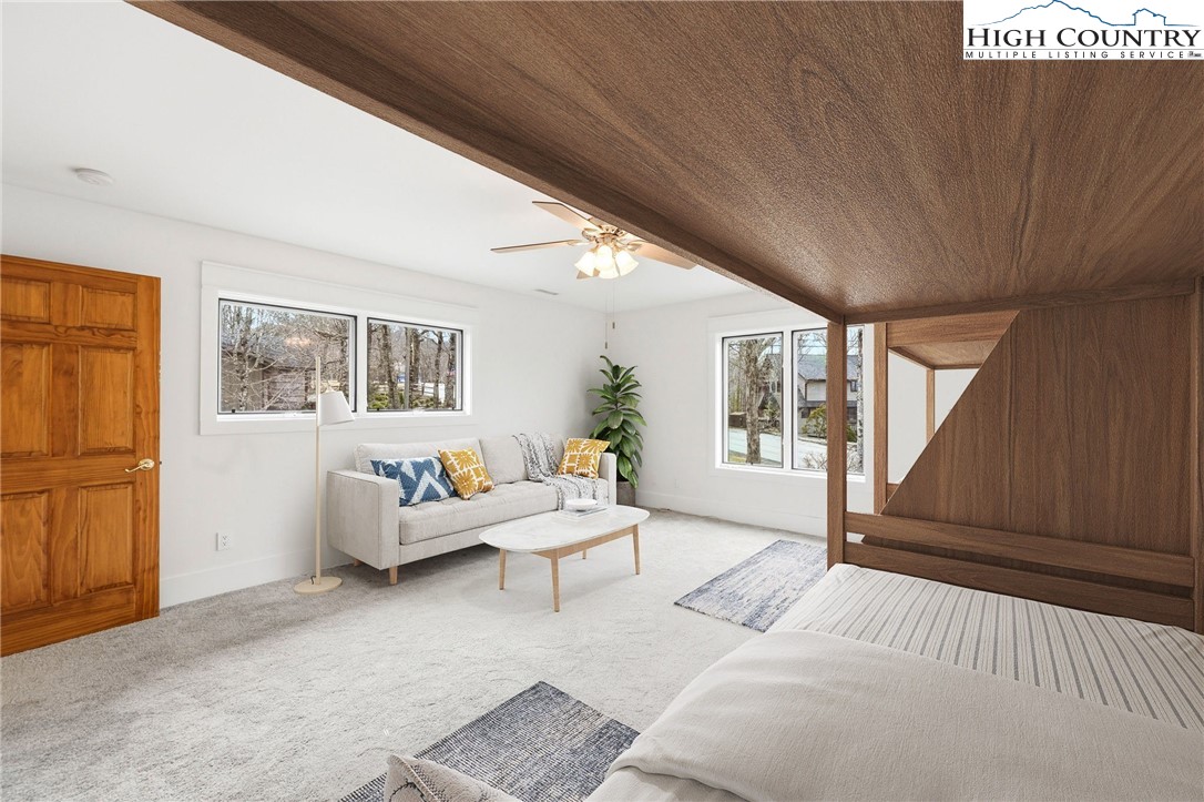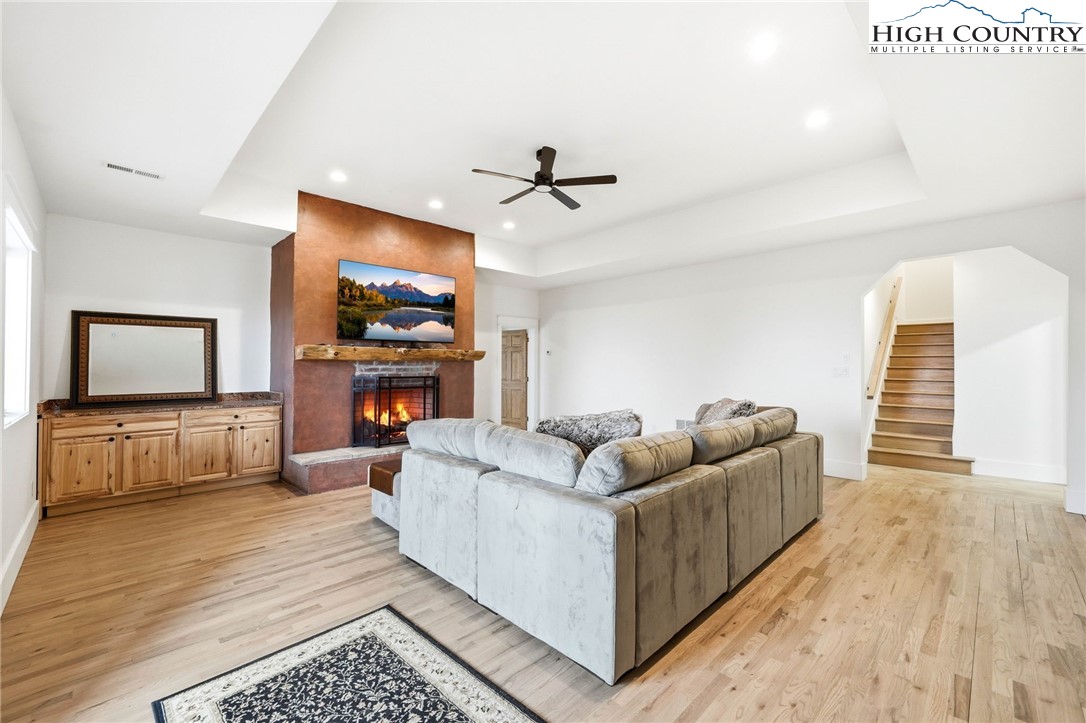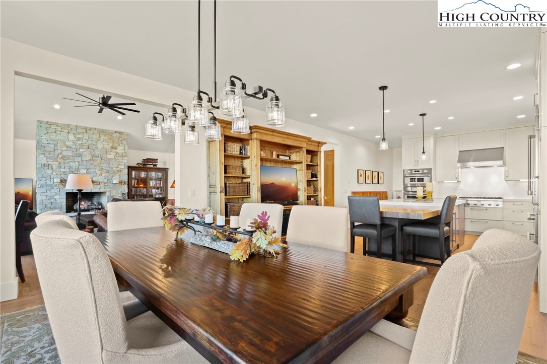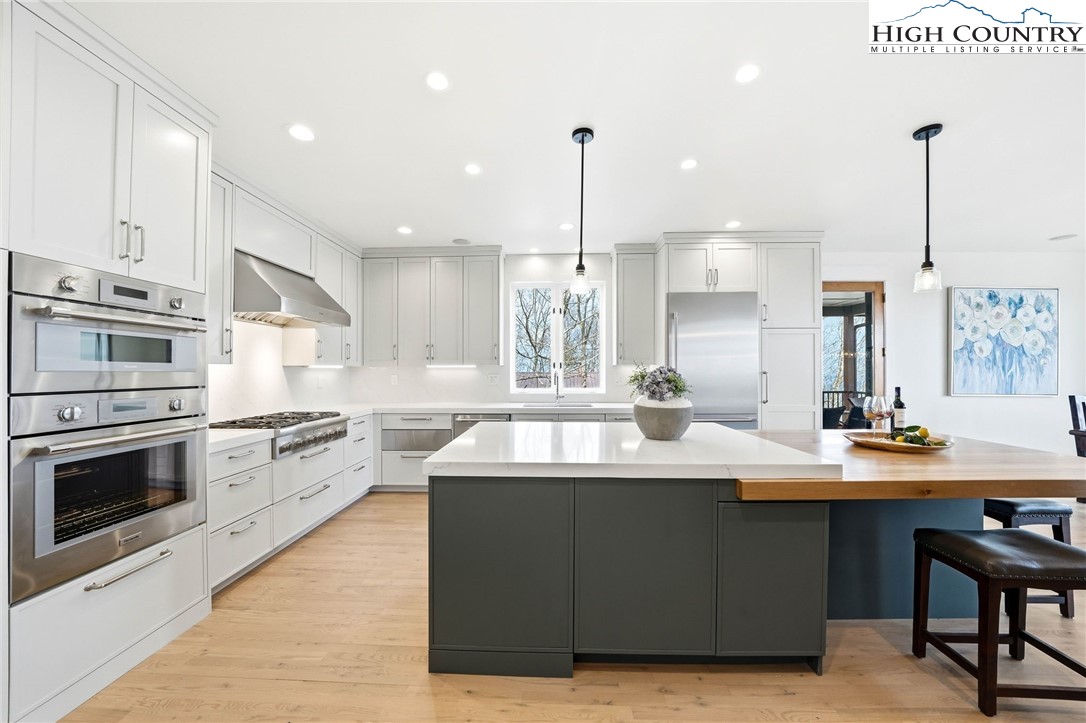 Experience mountain living in this beautifully renovated home on Beech Mountain, offering expansive 280° layered mountain views. Thoughtfully updated inside and out, this residence combines modern finishes with timeless comfort. The main level features large picture windows showcasing the sweeping views from the living room, kitchen, and primary suite. The brand-new kitchen includes custom cabinetry by Distinctive Cabinetry, quartz countertops, a coordinating quartz backsplash, and new appliances. The interior has been freshly painted throughout, and the primary bathroom has been completely redesigned with new tile flooring, heated floors, updated cabinetry, and quartz countertops. The living area centers around a new stone fireplace with a handcrafted Rustik mantle, complemented by additional stonework added to the exterior façade. The exterior has been fully refreshed with new paint, new lighting, and updated landscaping. The lower level provides a second stone fireplace, a custom wine cellar, a spacious workshop/flex room great for exercise or hobbies, and an additional en-suite bedroom. A generous two-car garage completes the property, offering ample storage and convenience.