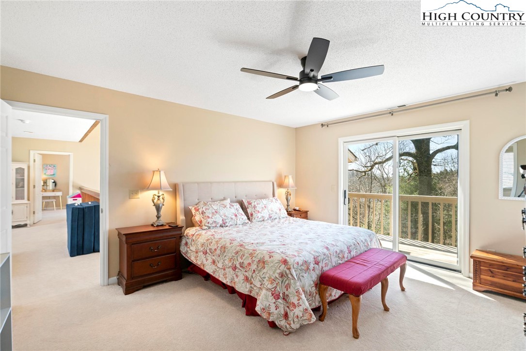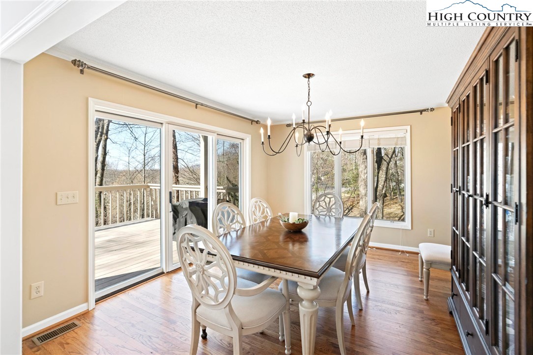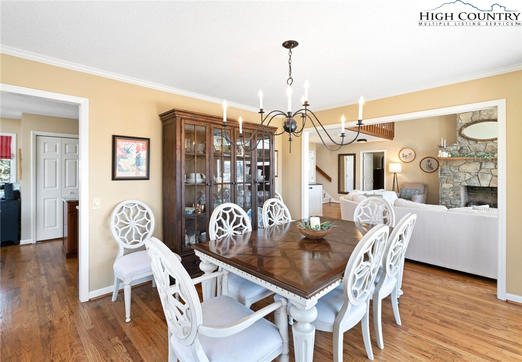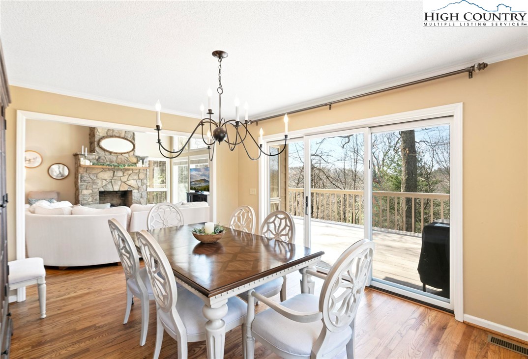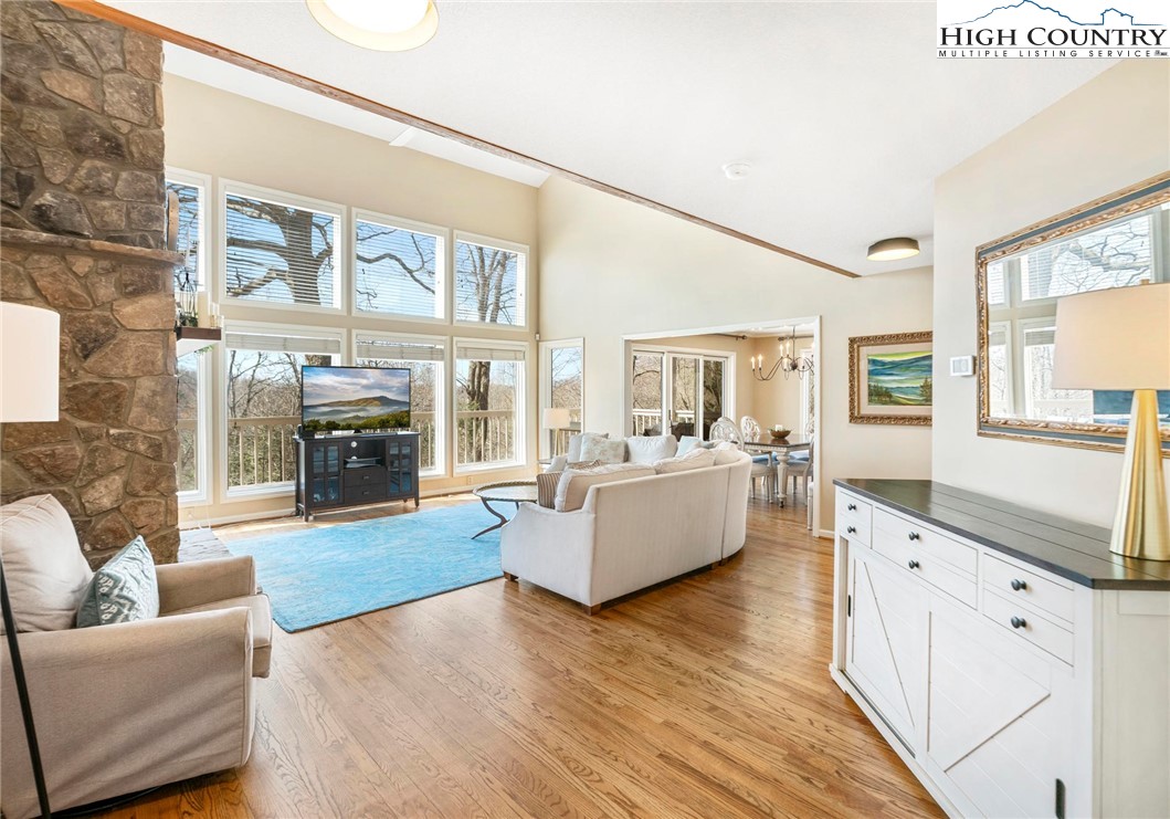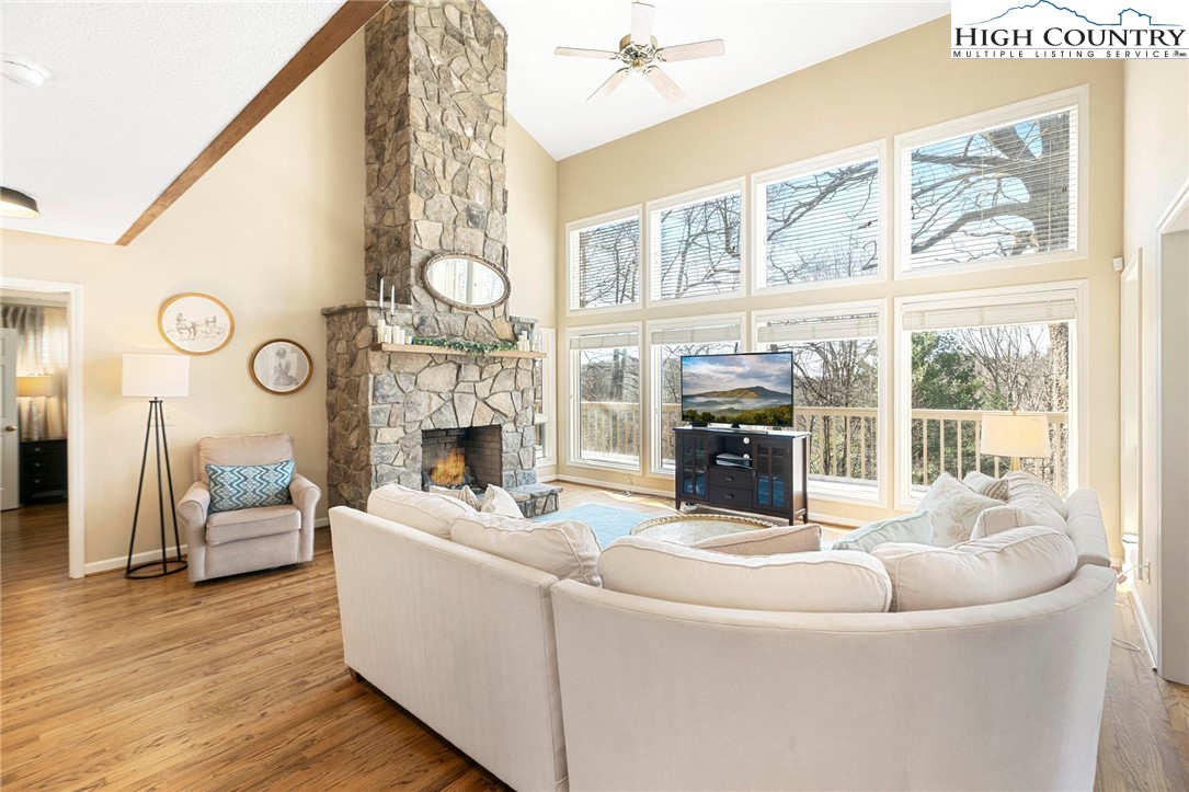 Nestled in the desirable Sorrento Forest neighborhood of Blowing Rock, this inviting three-bedroom, 3.5-bath mountain home offers warmth, natural light and comfortable living spaces throughout. Southern exposure fills the home with sunshine, while expansive windows frame the peaceful wooded setting with seasonal views of Grandfather Mountain in the distance. The main living area features vaulted ceilings and a striking floor-to-ceiling stone fireplace, creating a warm and inviting focal point in the great room. The layout flows comfortably between the living room, dining area and kitchen, offering an ideal setting for both everyday living and entertaining. The dining area opens onto the deck through large sliding glass doors, bringing in natural light and making it easy to enjoy outdoor dining and mountain air. The kitchen is well-equipped with modern appliances, ample counter space and a cozy breakfast nook for casual meals. The main-level primary suite provides privacy and convenience, complete with a large closet and a well-appointed bathroom featuring dual vanities, a soaking tub and a separate shower. Upstairs, an open loft with built-in bookshelves creates a cozy reading nook and leads to two spacious guest suites, each with its own private balcony. The full basement adds valuable flexibility with several bonus rooms that can serve as a home office, fitness area, hobby room or additional sleeping quarters. There is also ample storage space for outdoor equipment and seasonal items. A gently sloping driveway leads to the attached two-car garage for easy year-round access. Ideally located just minutes from the shops, restaurants and charm of downtown Blowing Rock, as well as the outdoor beauty of the Blue Ridge Parkway, this home offers the perfect combination of convenience and mountain serenity. Whether you're looking for a full-time residence, weekend escape or High Country retreat, this inviting home offers the space, setting and comfort to truly enjoy mountain living.