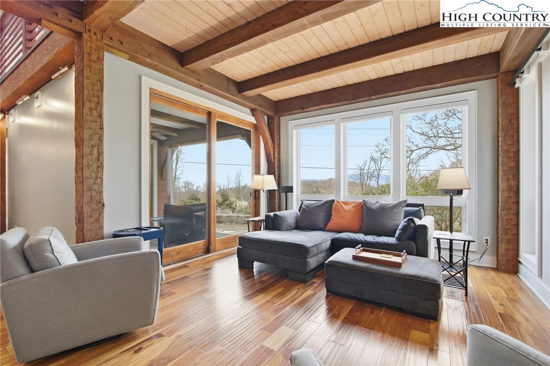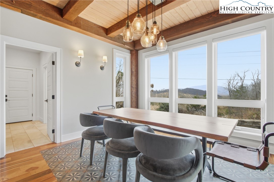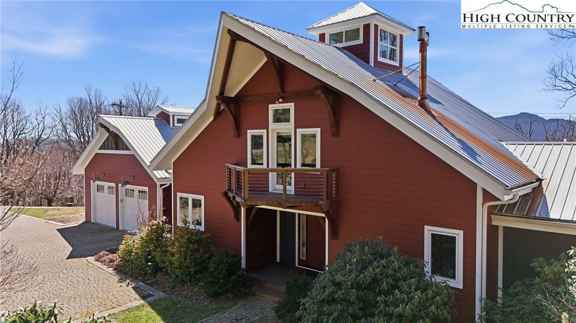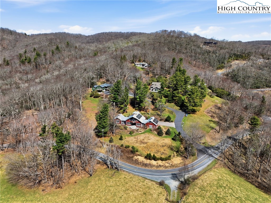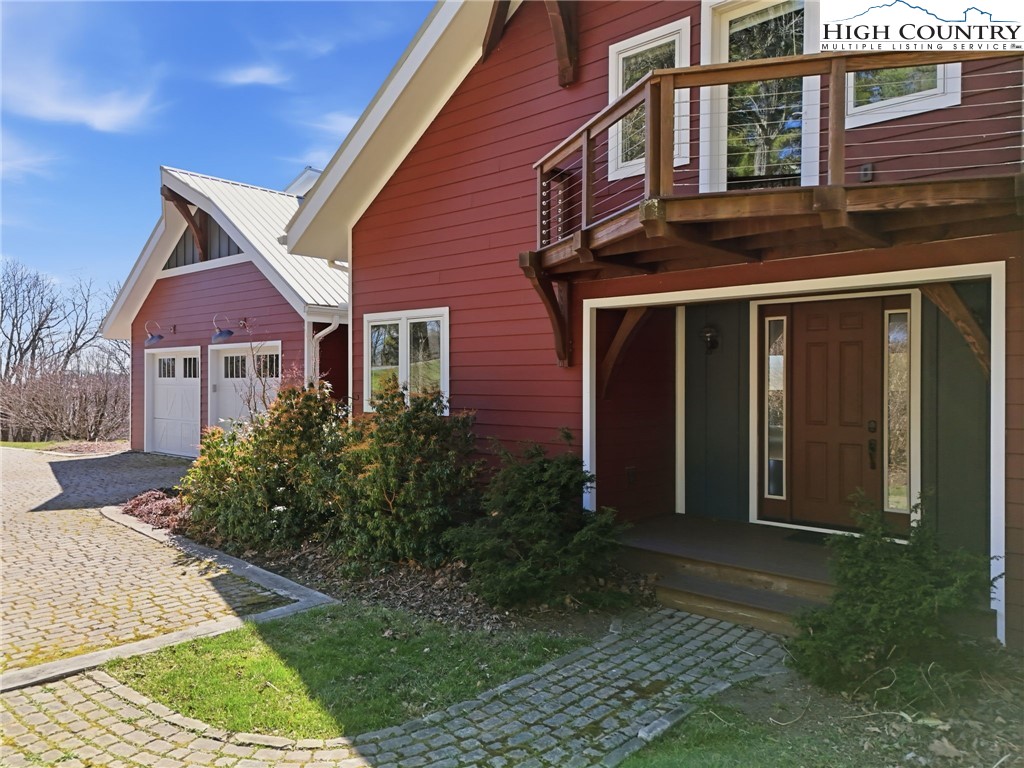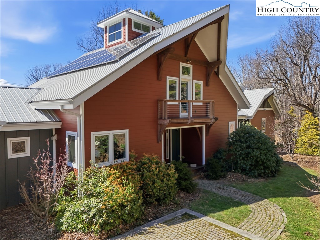 Exceptional timber frame home offering stunning Grandfather Mountain views in a premier location just off the Blue Ridge Parkway! Directly adjacent to Moses Cone Manor property with a trailhead directly across the street to hike on public land all the way to Profile Trail on Grandfather Mountain. Filled with natural light from expansive west-facing windows, the home features a spacious kitchen with built-in cooktop, wall oven, and microwave, custom cabinetry, upgraded appliances, and a large island with prep sink and seating. The adjoining dining area is perfectly positioned to take in the mountain views, with direct access to the deck for outdoor enjoyment. The main-level primary suite offers vaulted ceilings, a generous walk-in closet tucked behind a custom brick accent wall, and a beautifully appointed ensuite bath with tile throughout, glass shower, and separate soaking tub. Laundry is conveniently located on the main level, allowing for easy one-level living. In the living room, the wood stove is surrounded by soapstone, making it more efficient at radiating heat, and features a baking oven. Upstairs, a versatile loft with bedroom and full bath provides flexible space for additional sleeping, office, or recreation. Situated on two lots totaling over one acre, the property offers a level yard and ample flat parking along a cobblestone driveway, along with an attached two-car garage with an EV charging station. Other notable upgrades include metal roofs, owned solar panels on both the home and garage with a new battery storage system, and geothermal heating and cooling supported by two wells. The installed septic system is for a three-bedroom home; if someone wanted to add the upstairs doorway, it would become the third bedroom. Located just five minutes from downtown Blowing Rock and moments from the Blue Ridge Parkway, this property combines privacy, efficiency, and convenience in one remarkable High Country offering.