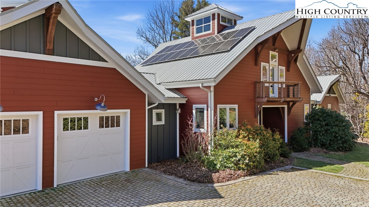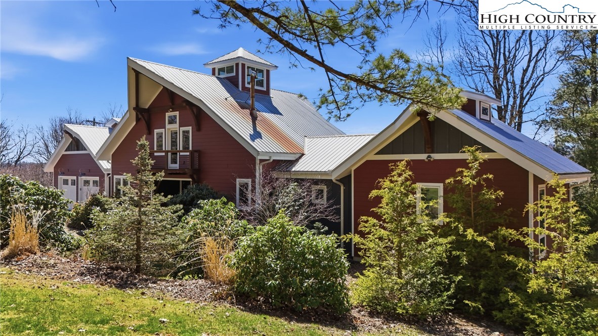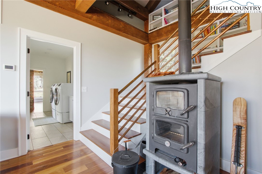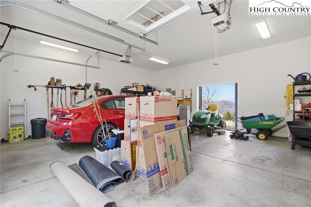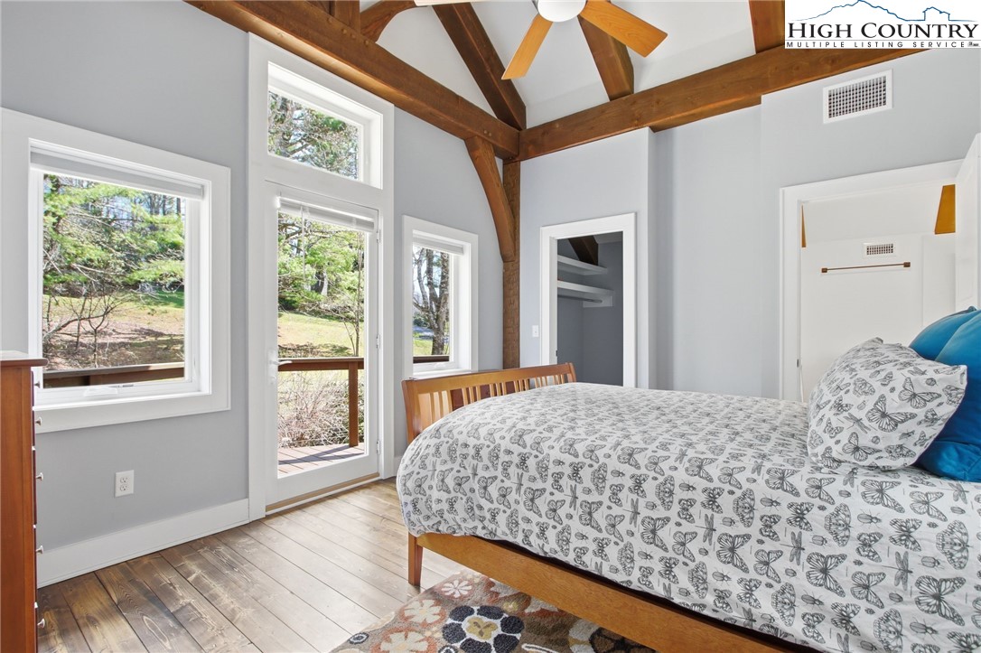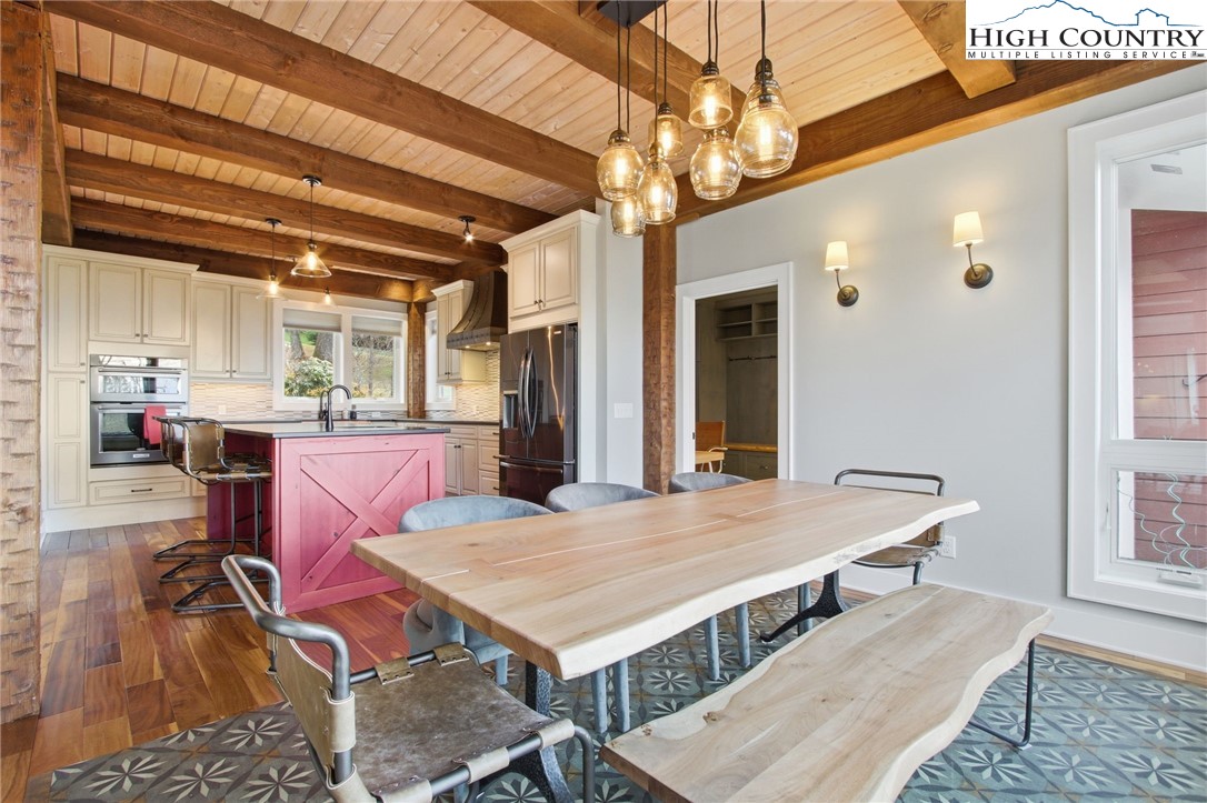 Exceptional timber frame home offering stunning Grandfather Mountain views in a premier location just off the Blue Ridge Parkway! Directly adjacent to Moses Cone Manor property with a trailhead directly across the street to hike on public land all the way to Profile Trail on Grandfather Mountain. Filled with natural light from expansive west-facing windows, the home features a spacious kitchen with built-in cooktop, wall oven, and microwave, custom cabinetry, upgraded appliances, and a large island with prep sink and seating. The adjoining dining area is perfectly positioned to take in the mountain views, with direct access to the deck for outdoor enjoyment. The main-level primary suite offers vaulted ceilings, a generous walk-in closet tucked behind a custom brick accent wall, and a beautifully appointed ensuite bath with tile throughout, glass shower, and separate soaking tub. Laundry is conveniently located on the main level, allowing for easy one-level living. In the living room, the wood stove is surrounded by soapstone, making it more efficient at radiating heat, and features a baking oven. Upstairs, a versatile loft with bedroom and full bath provides flexible space for additional sleeping, office, or recreation. Situated on two lots totaling over one acre, the property offers a level yard and ample flat parking along a cobblestone driveway, along with an attached two-car garage with an EV charging station. Other notable upgrades include metal roofs, owned solar panels on both the home and garage with a new battery storage system, and geothermal heating and cooling supported by two wells. The installed septic system is for a three-bedroom home; if someone wanted to add the upstairs doorway, it would become the third bedroom. Located just five minutes from downtown Blowing Rock and moments from the Blue Ridge Parkway, this property combines privacy, efficiency, and convenience in one remarkable High Country offering.