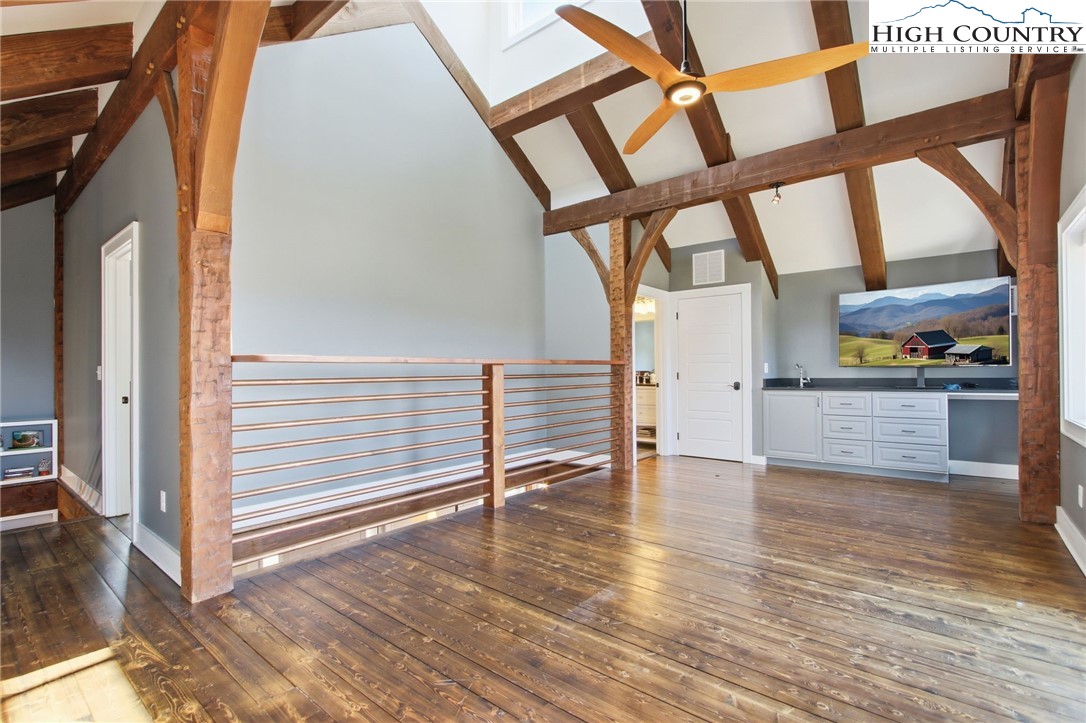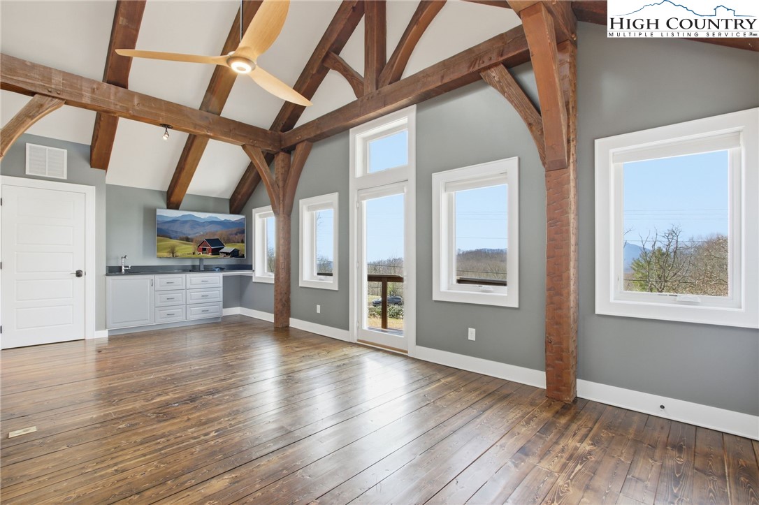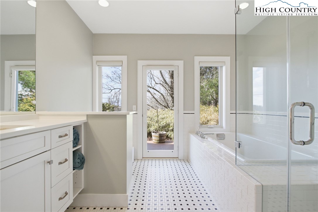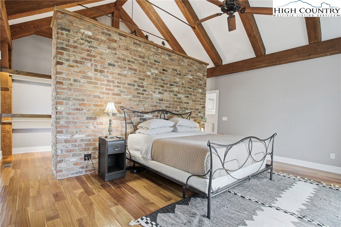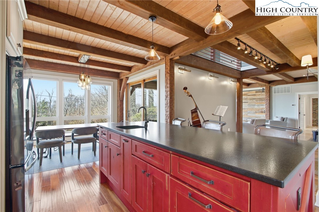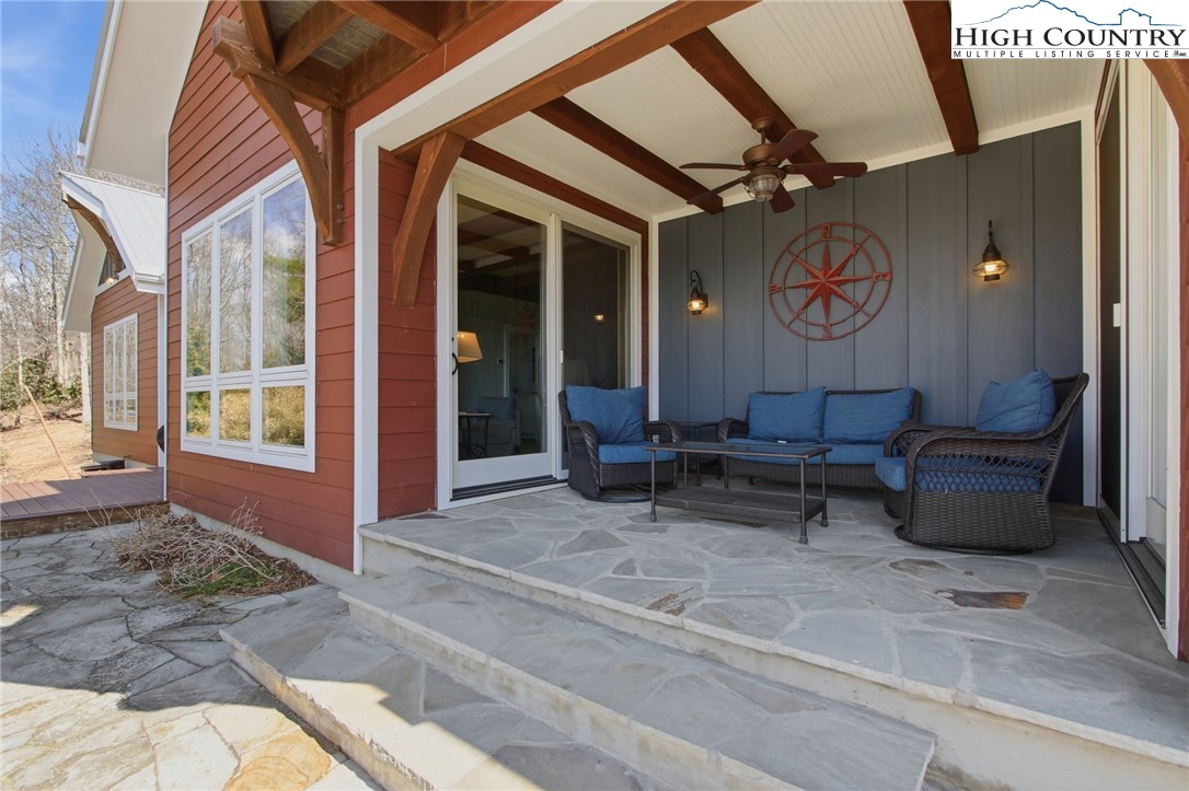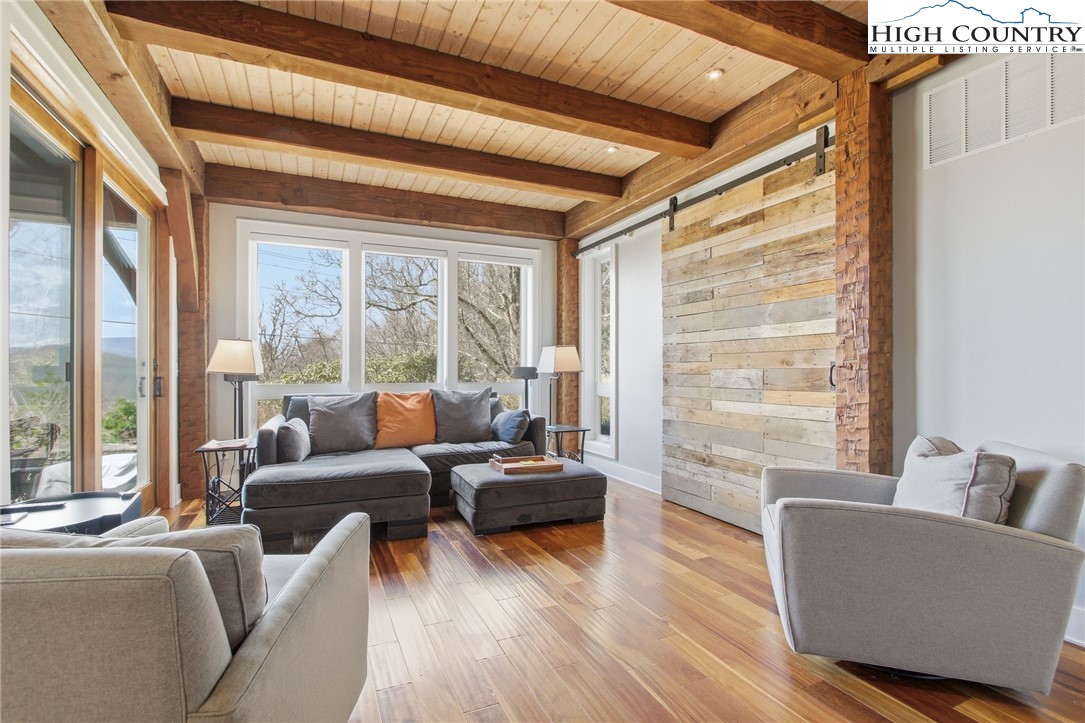 Exceptional timber frame home offering stunning Grandfather Mountain views in a premier location just off the Blue Ridge Parkway! Directly adjacent to Moses Cone Manor property with a trailhead directly across the street to hike on public land all the way to Profile Trail on Grandfather Mountain. Filled with natural light from expansive west-facing windows, the home features a spacious kitchen with built-in cooktop, wall oven, and microwave, custom cabinetry, upgraded appliances, and a large island with prep sink and seating. The adjoining dining area is perfectly positioned to take in the mountain views, with direct access to the deck for outdoor enjoyment. The main-level primary suite offers vaulted ceilings, a generous walk-in closet tucked behind a custom brick accent wall, and a beautifully appointed ensuite bath with tile throughout, glass shower, and separate soaking tub. Laundry is conveniently located on the main level, allowing for easy one-level living. In the living room, the wood stove is surrounded by soapstone, making it more efficient at radiating heat, and features a baking oven. Upstairs, a versatile loft with bedroom and full bath provides flexible space for additional sleeping, office, or recreation. Situated on two lots totaling over one acre, the property offers a level yard and ample flat parking along a cobblestone driveway, along with an attached two-car garage with an EV charging station. Other notable upgrades include metal roofs, owned solar panels on both the home and garage with a new battery storage system, and geothermal heating and cooling supported by two wells. The installed septic system is for a three-bedroom home; if someone wanted to add the upstairs doorway, it would become the third bedroom. Located just five minutes from downtown Blowing Rock and moments from the Blue Ridge Parkway, this property combines privacy, efficiency, and convenience in one remarkable High Country offering.