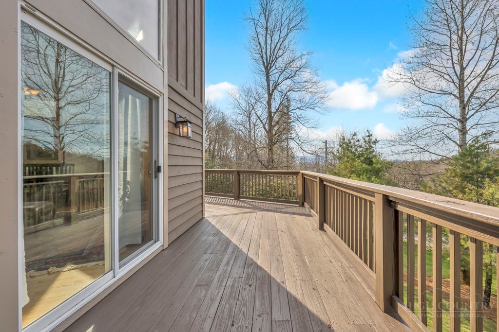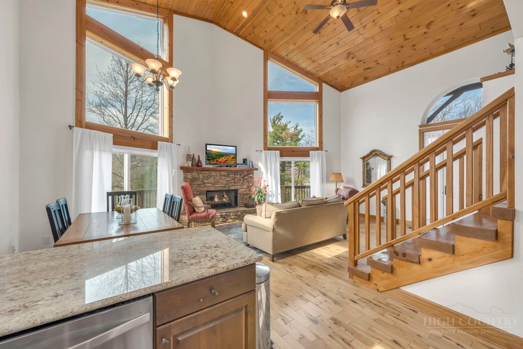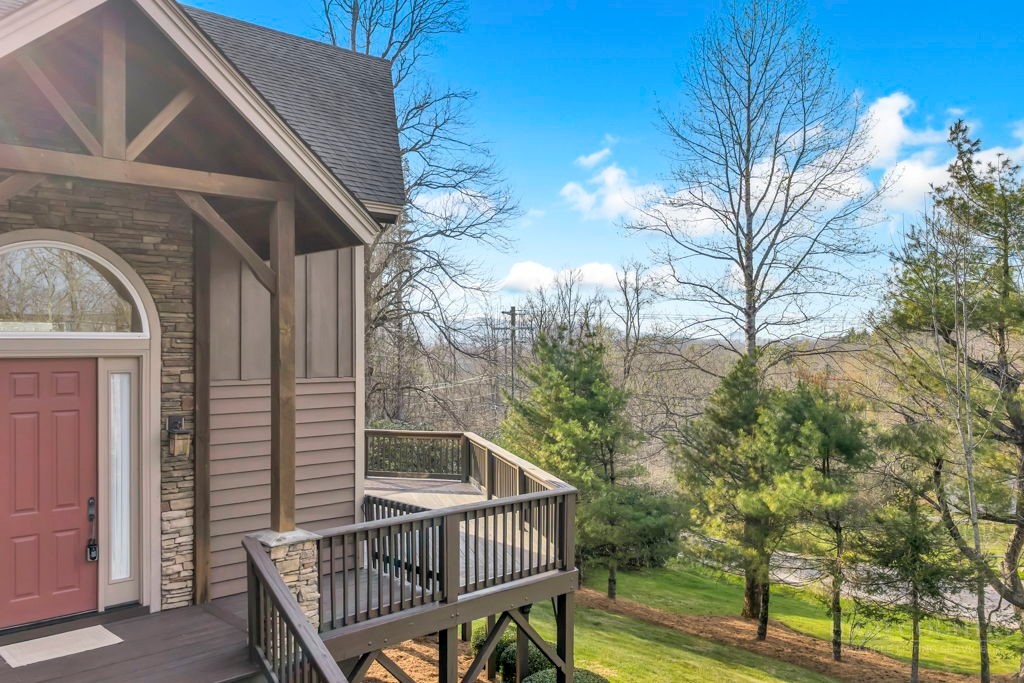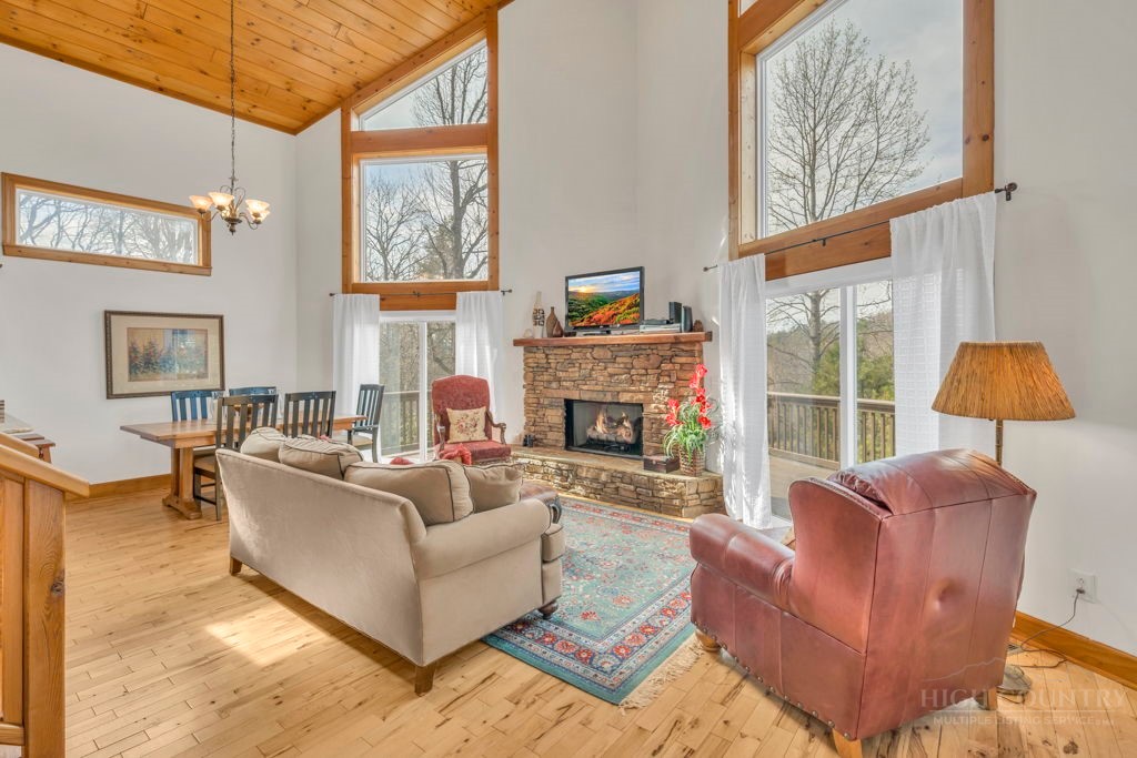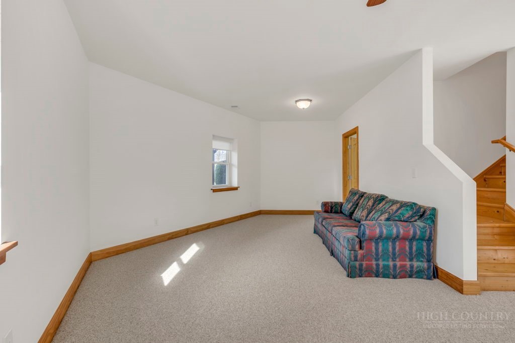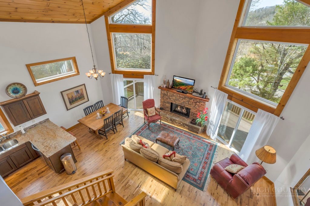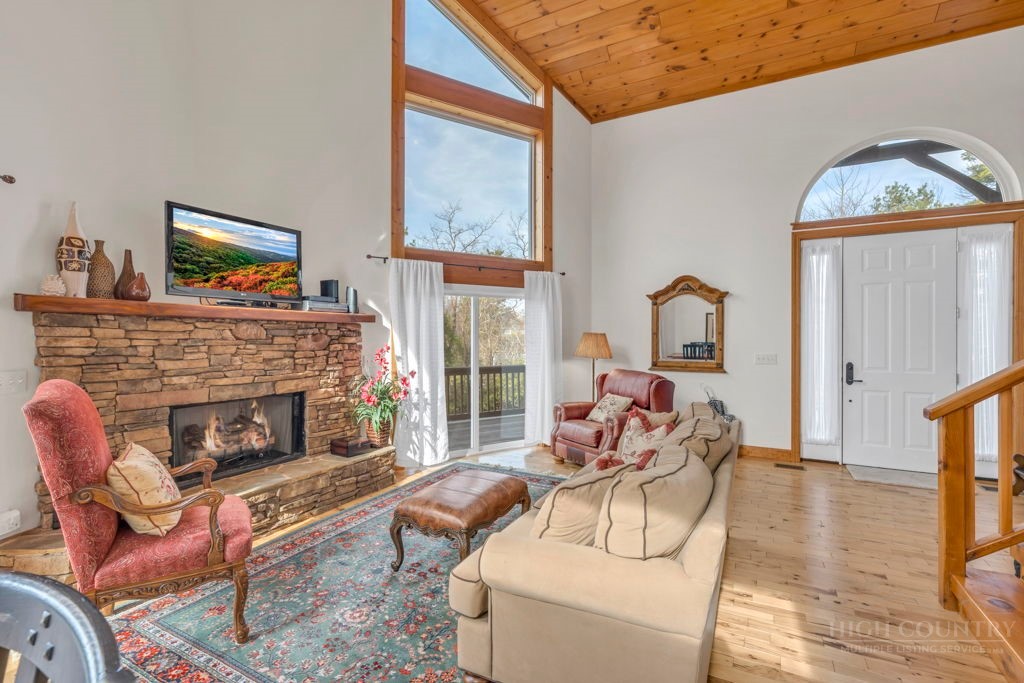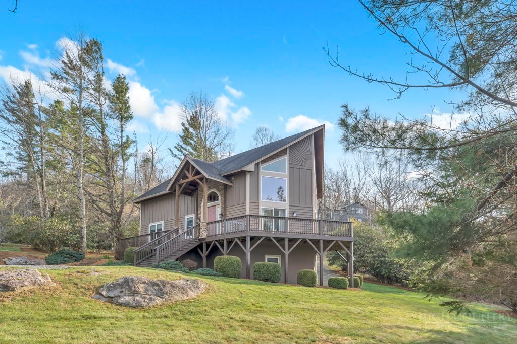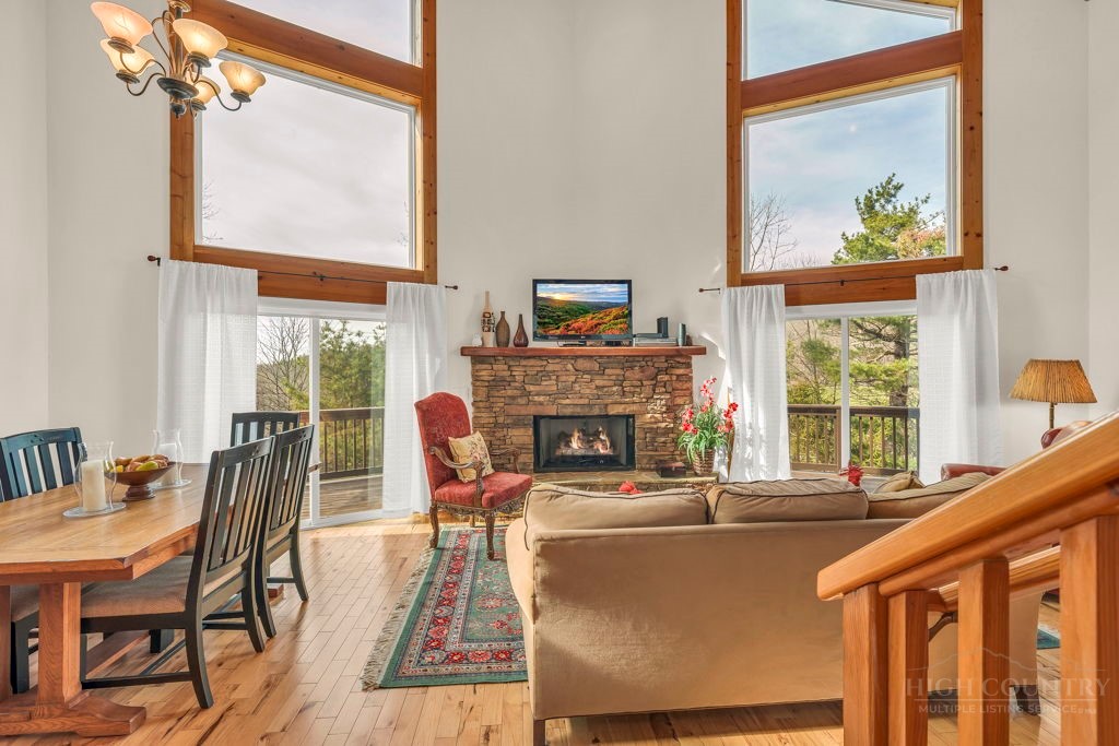 126 Knob Road - the perfect getaway, investment property, or full-time residence with seasonal mountain views, just minutes to Blowing Rock and all the High Country has to offer! Just off the Blue Ridge Parkway, enjoy seasonal mountain views, high elevation (3,600+ feet!), and easy access year-round on paved roads. Offered fully furnished and turnkey with no exceptions; short-term rentals permitted! This charming home offers three bedrooms and two and a half baths with bonus rooms and spaces, a spacious deck, and usable yards. On the walk-in level, enter from the covered front entry to the two-story Great Room with a vaulted ceiling and stone fireplace, adjacent to a dining area and kitchen with updated appliances and granite counters. The main level also includes a primary suite with a large walk-in closet and a full bath with a jetted soaking tub, as well as an office or bonus room and a half bath. Upstairs, find a lofted sitting area overlooking the Great Room, two bedrooms, and a full bath. Downstairs, a second living room grants walkout access to the yard, and is adjacent to a large storage or bonus room, laundry room, and access to the oversized one-car garage. Additional features: tongue-and-groove ceilings throughout, high-speed internet, dual driveways at front and back, ample storage space.