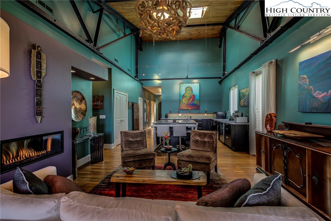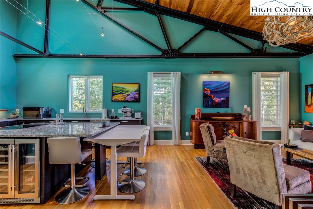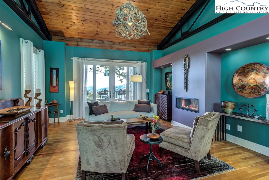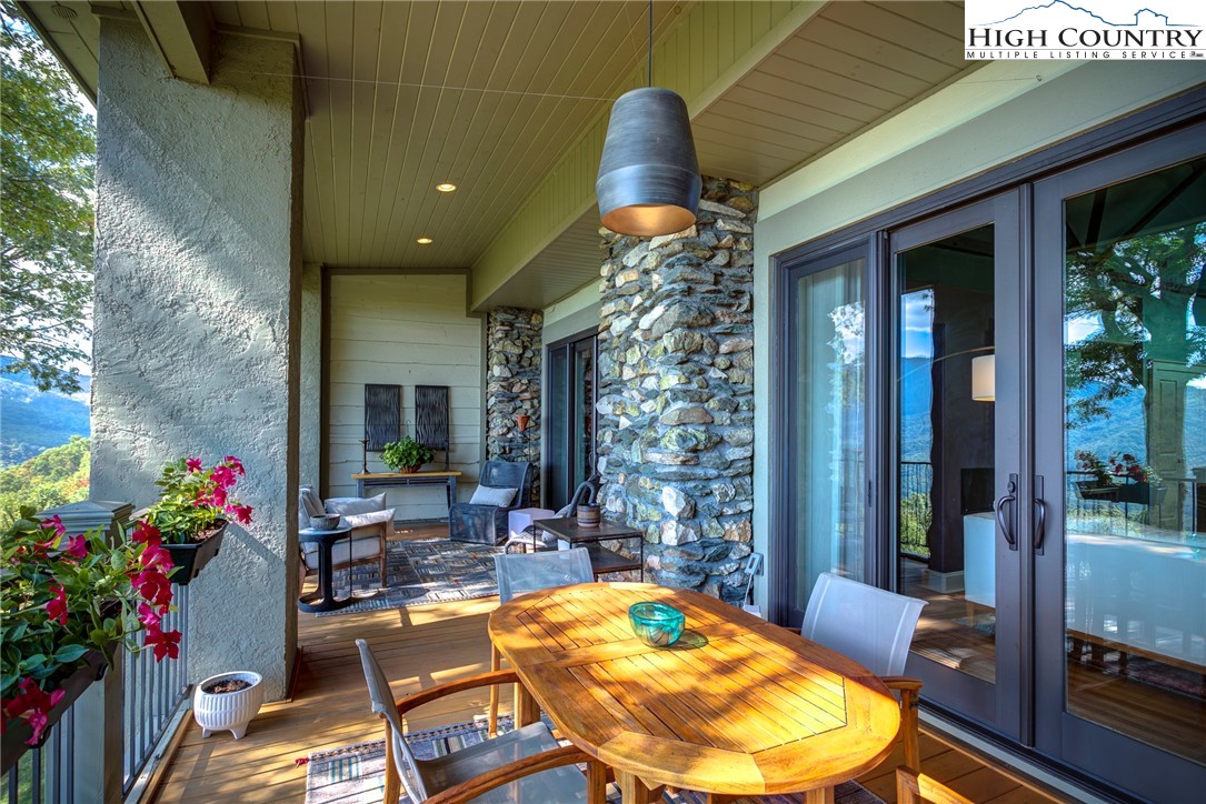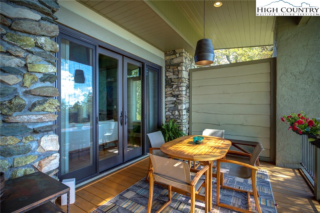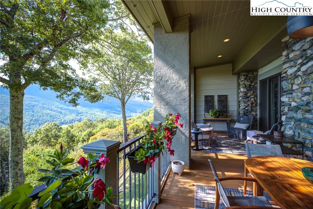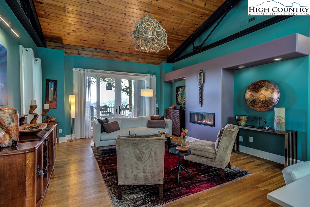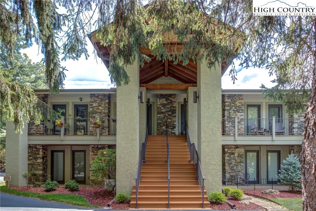 Experience a truly one-of-a-kind, grand mountain retreat. This condo features a visionary renovation that replaces the expected look with the utterly stunning. The transformation has created an absolute architectural masterpiece, resulting in an intentionally created sanctuary. Forget rustic; step inside a dynamic space defined by softly sculpted, adobe-inspired walls and a vibrant color palette. Soaring heart of pine tongue and groove cathedral ceilings create a dramatic and lofty feel. As an end unit, the condo is drenched in natural light thanks to expansive windows on three sides. The remodeled kitchen is out of this world, designed for both style and function, featuring quartz counters, an induction cooktop, and abundant storage including a large pantry, all while maintaining a feeling of openness by eliminating all upper cabinetry. This is a fantastic space for entertaining, complete with two wine fridges, and flows seamlessly into the open-concept living area and out to a fabulous covered deck with long-range layered views of the majestic Blue Ridge Mountains, including Grandfather Mountain! This property will truly take your breath away! The stunning primary suite boasts a completely remodeled gorgeous bathroom with artistic custom touches. The two guest bedrooms are currently set up as an office and a media room; one features a separate exterior door, creating an lovely guest suite option with its own private entrance. Great for seasonal or full-time residents, this location offers an ideal tranquil lifestyle. Renting is not permitted, ensuring homeowners will not be disturbed by short-term renters. Interestingly, the building itself has an incredible history! Originally a hotel and restaurant, some locals still refer to it fondly as The Inn at Seven Devils.” Then it became a dance hall with Scottish Clans congregating for their Tartan Ball! Be sure to check out the articles in the attached documents. The fantastic location in Seven Devils is centrally located between Boone, Banner Elk, and Blowing Rock, a short drive to world-class hiking, ski slopes, snow tubing, ziplining, and iconic Grandfather Mountain. Along with excellent year-round access right off the main road, the property sits conveniently diagonally across the street from the Seven Devils Community Center offering an exercise room, fitness & art classes, seasonal events, and more; and a property owner can join the Seven Devils Resort Club for an annual membership. This condominium is a doorway to a lifestyle of leisure and enjoyment. This isn't just a condo; it's a curated, artistic living experience unlike any other in the mountains—get ready for something completely different and absolutely fabulous!