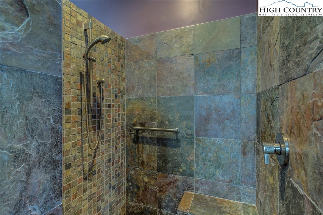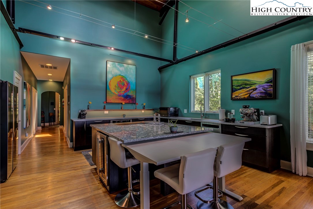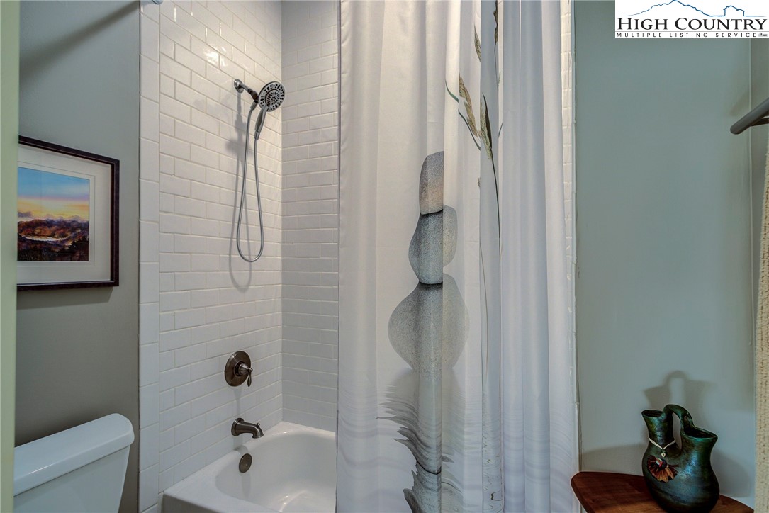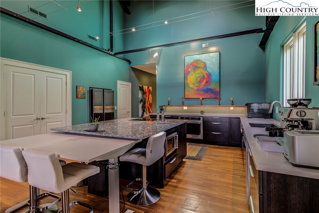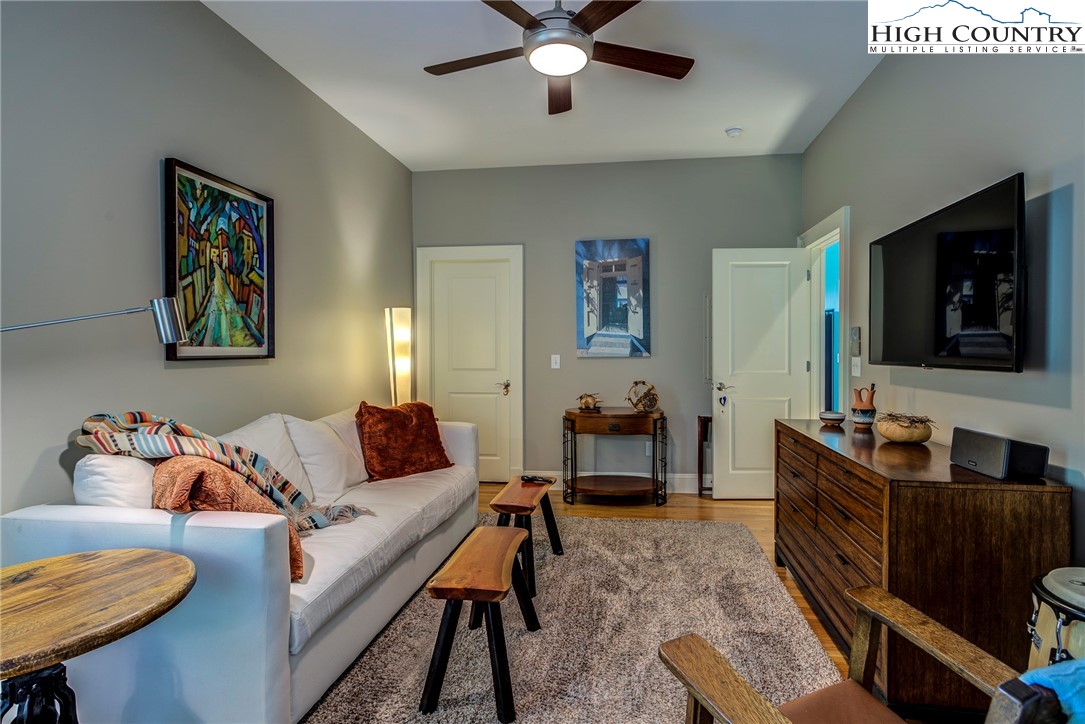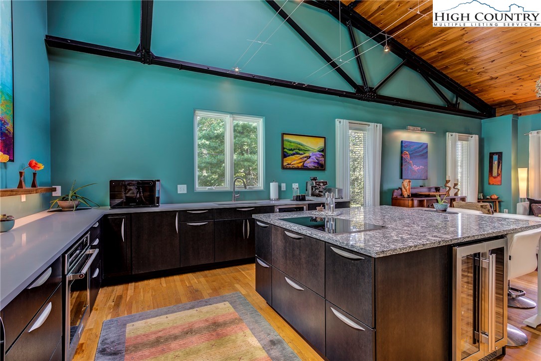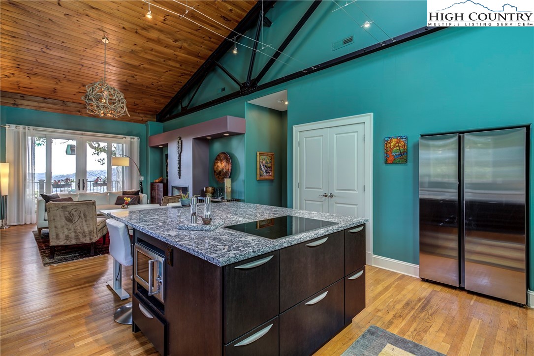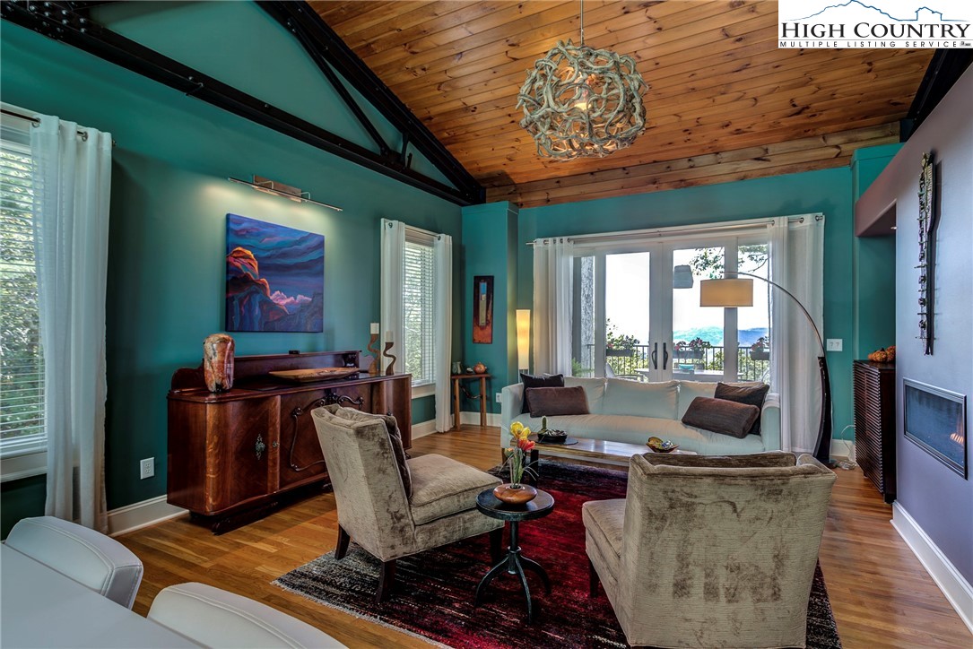 Experience a truly one-of-a-kind, grand mountain retreat. This condo features a visionary renovation that replaces the expected look with the utterly stunning. The transformation has created an absolute architectural masterpiece, resulting in an intentionally created sanctuary. Forget rustic; step inside a dynamic space defined by softly sculpted, adobe-inspired walls and a vibrant color palette. Soaring heart of pine tongue and groove cathedral ceilings create a dramatic and lofty feel. As an end unit, the condo is drenched in natural light thanks to expansive windows on three sides. The remodeled kitchen is out of this world, designed for both style and function, featuring quartz counters, an induction cooktop, and abundant storage including a large pantry, all while maintaining a feeling of openness by eliminating all upper cabinetry. This is a fantastic space for entertaining, complete with two wine fridges, and flows seamlessly into the open-concept living area and out to a fabulous covered deck with long-range layered views of the majestic Blue Ridge Mountains, including Grandfather Mountain! This property will truly take your breath away! The stunning primary suite boasts a completely remodeled gorgeous bathroom with artistic custom touches. The two guest bedrooms are currently set up as an office and a media room; one features a separate exterior door, creating an lovely guest suite option with its own private entrance. Great for seasonal or full-time residents, this location offers an ideal tranquil lifestyle. Renting is not permitted, ensuring homeowners will not be disturbed by short-term renters. Interestingly, the building itself has an incredible history! Originally a hotel and restaurant, some locals still refer to it fondly as The Inn at Seven Devils.” Then it became a dance hall with Scottish Clans congregating for their Tartan Ball! Be sure to check out the articles in the attached documents. The fantastic location in Seven Devils is centrally located between Boone, Banner Elk, and Blowing Rock, a short drive to world-class hiking, ski slopes, snow tubing, ziplining, and iconic Grandfather Mountain. Along with excellent year-round access right off the main road, the property sits conveniently diagonally across the street from the Seven Devils Community Center offering an exercise room, fitness & art classes, seasonal events, and more; and a property owner can join the Seven Devils Resort Club for an annual membership. This condominium is a doorway to a lifestyle of leisure and enjoyment. This isn't just a condo; it's a curated, artistic living experience unlike any other in the mountains—get ready for something completely different and absolutely fabulous!