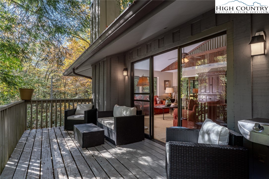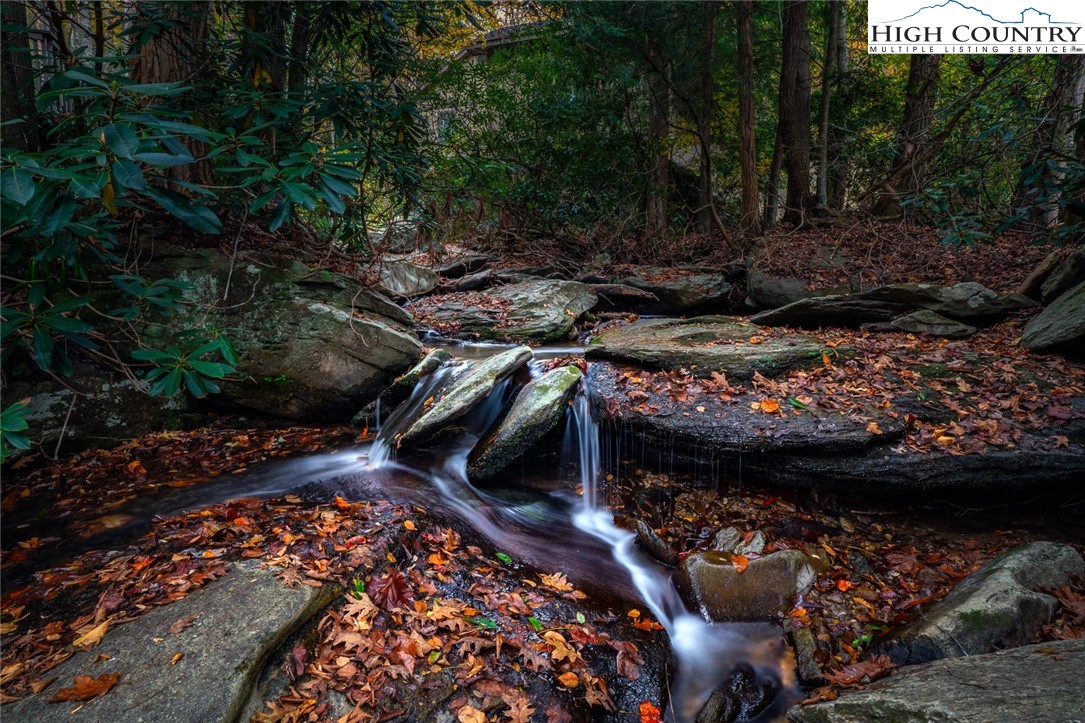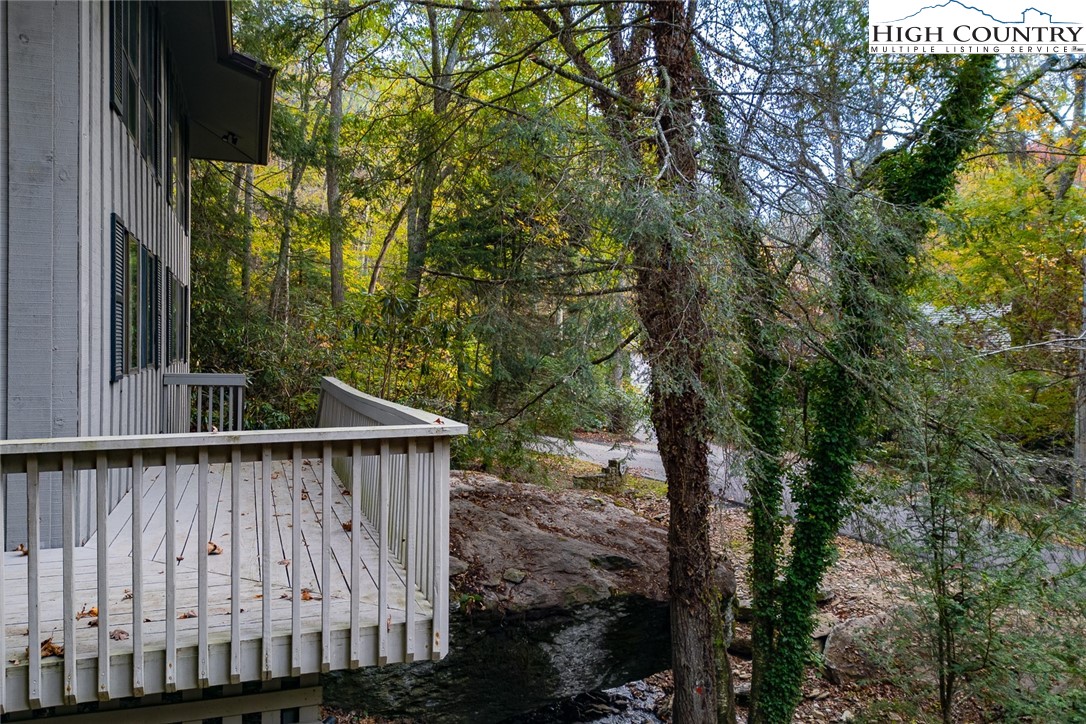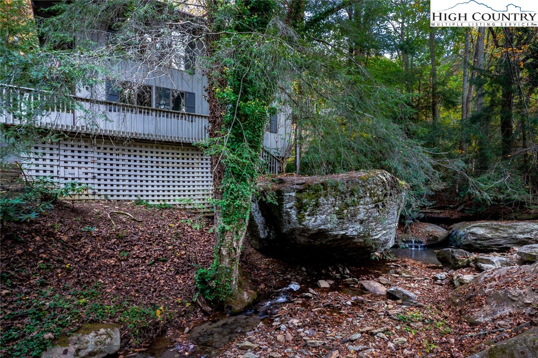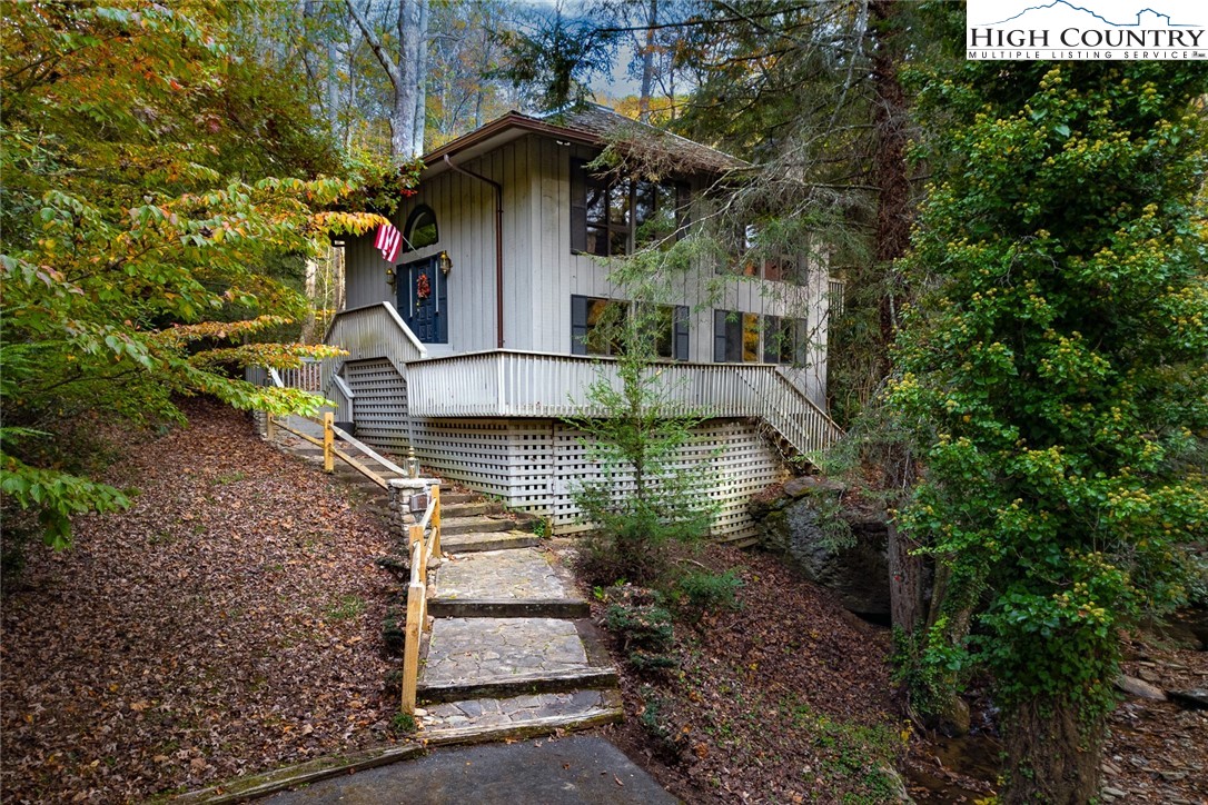 Welcoming streamside mountain retreat in the desirable gated Hound Ears community. Perched alongside a year-round tributary of the Watauga River, enjoy the water sounds and outdoor views from the decks of this four-bedroom, three and a half-bath mountain home. The main level is made for entertaining family and friends with a cozy den and kitchen that adjoins an open living room and dining room. Relax on the upper porch and enjoy grilling outside in the mountain air and sounds of the stream. The second level has two bedrooms sharing a Jack and Jill bath and the primary suite with a spacious bath and walk-in closet, with its porch along the stream. The bottom level features Grandfather Mountain slate flooring, full bath, and bedroom. Level driveway and parking provide easy access. Impressive rock features outside along the stream provide a secluded feel while being convenient to all activities the Hound Ears community and High Country have to offer.