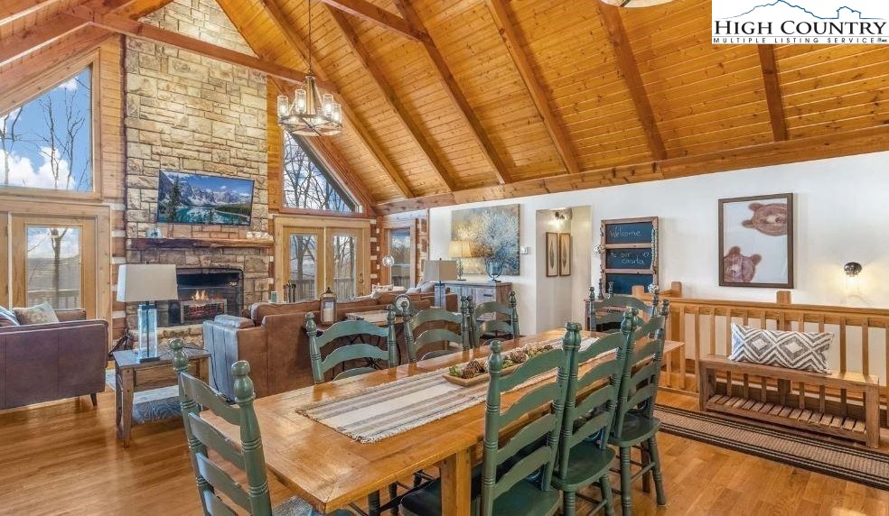 Welcome to Peek-A-Boo Lodge – No doubt one of the best deals in Eagles Nest. A contemporary log home nestled in the coveted Eagles Nest community, convenient location, just a 7 minute drive to downtown Banner Elk via a back gate. As you step inside, you’re greeted by a spacious great room featuring tongue n groove cathedral ceilings, wood floors, and a striking floor-to-ceiling stone fireplace with gas starter. Expansive windows provide lots of natural light and offer impressive long-range views. The thoughtful layout includes two generous primary suites on the main level both with deck access. On the lower floor, you’ll find a guest bedroom, a large recreation room, a full bathroom, lots of closets and storage, and a bonus room ideal for additional sleeping space. Generous decking for entertaining and enjoying the stunning views. This home is a fantastic opportunity in Eagles Nest, offering both good rental history and an amazing mountain retreat. On a 1.5-acre lot, situated for privacy, it also includes mature landscaping, stone steps to an inviting fire pit, garage, generator, and ample parking. Warm and inviting family home ideal for entertaining and holiday gatherings. The Lodges of Eagles Nest offers an array of outstanding amenities: ATV trails, a fitness center, a fantastic live music venue, tennis and pickleball courts, versatile sports fields, river access, hiking trails, and a dog park. Enjoy exceptional dining at the Epic Chophouse, connect with new friends at the Eagles Nest Winery, and take advantage of the convenience of an on-site Dollar General. Located just a short drive from downtown Banner Elk, Beech Mountain, and Sugar Mountain, you’ll have access to shopping, fine dining, skiing, mountain biking, and so much more.