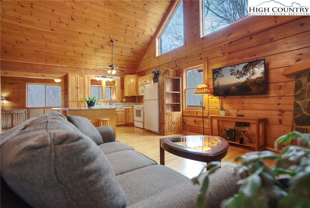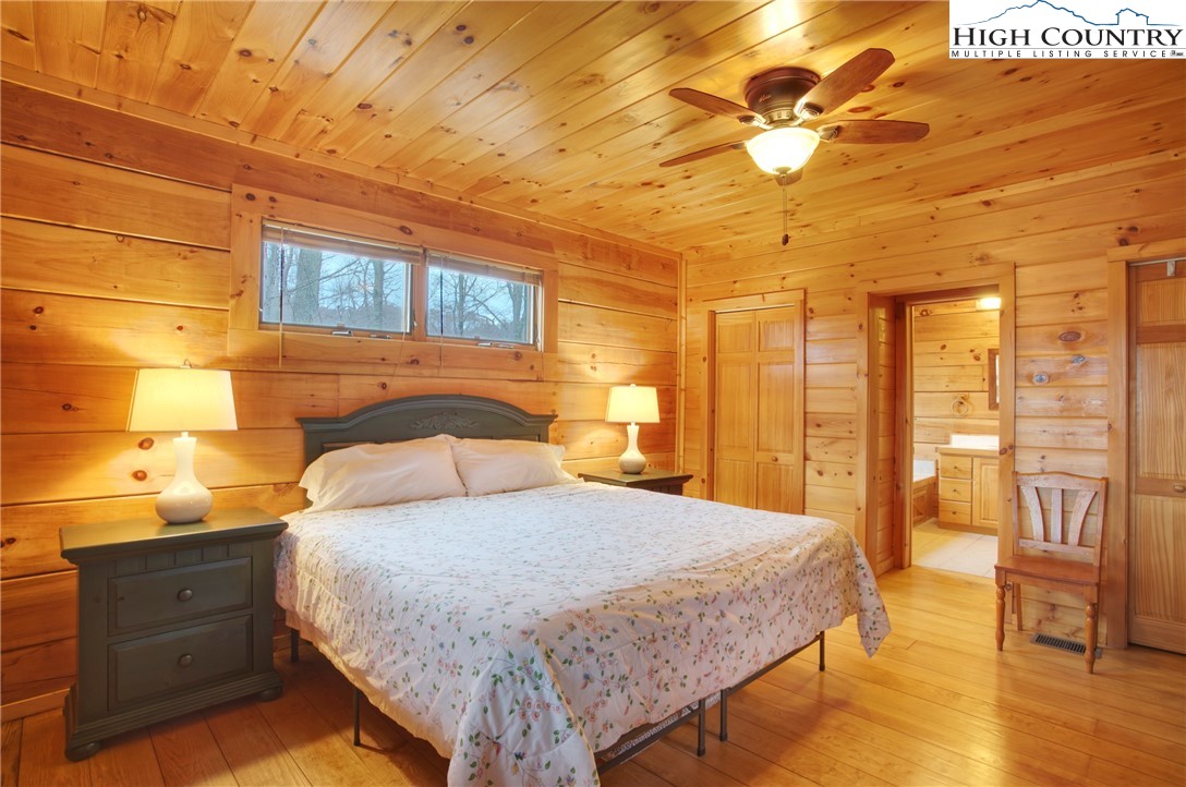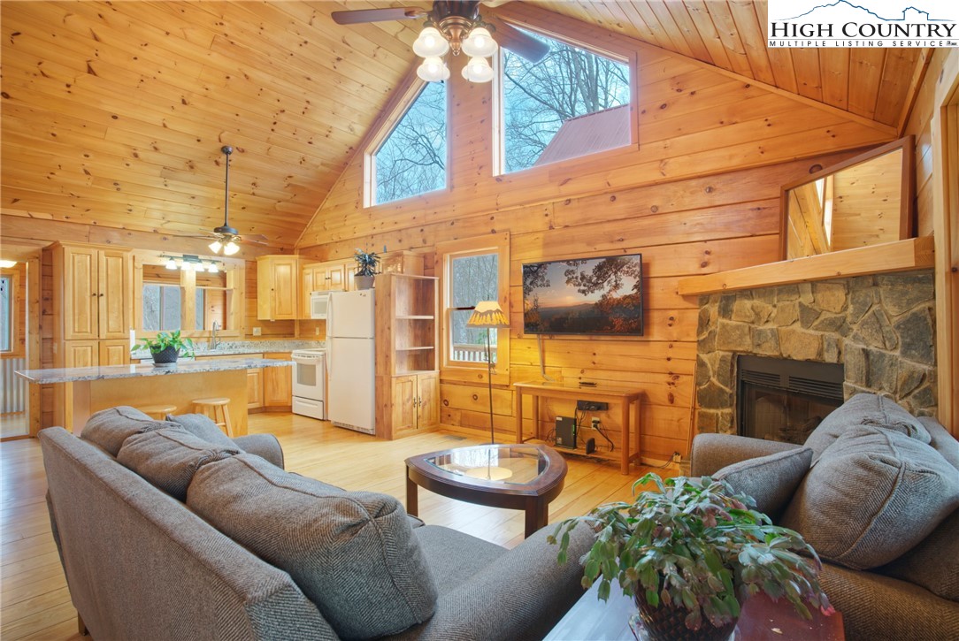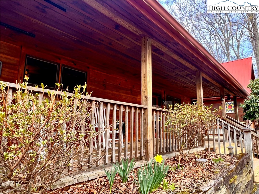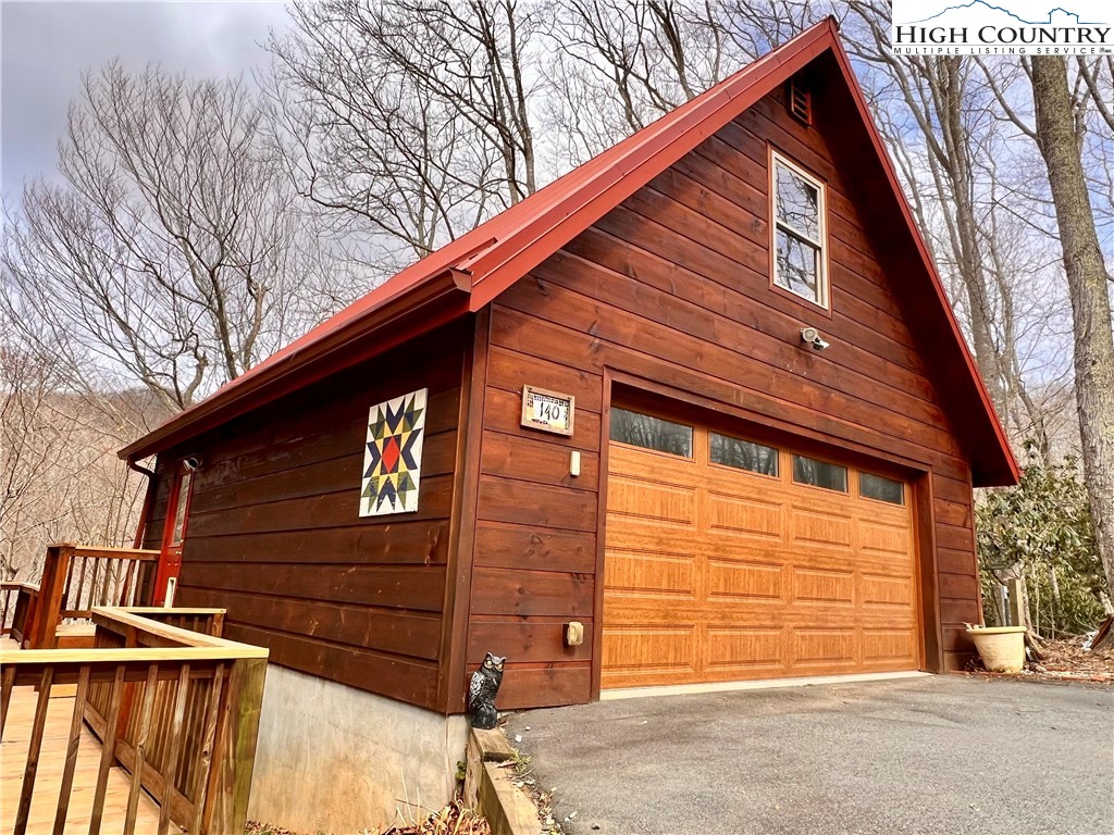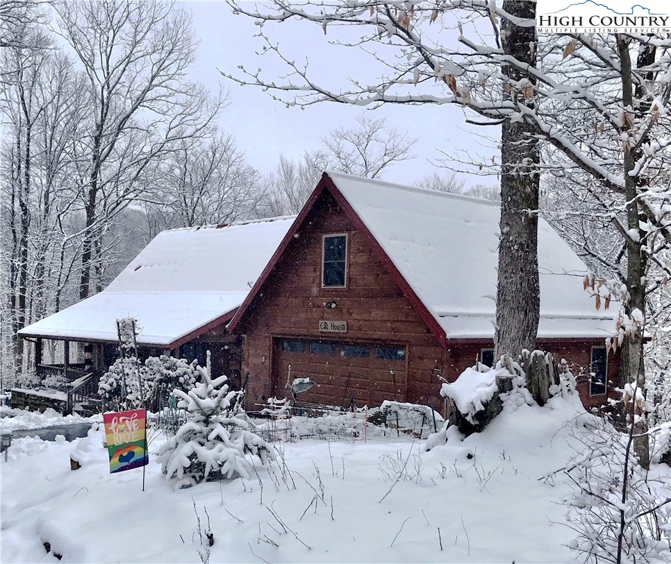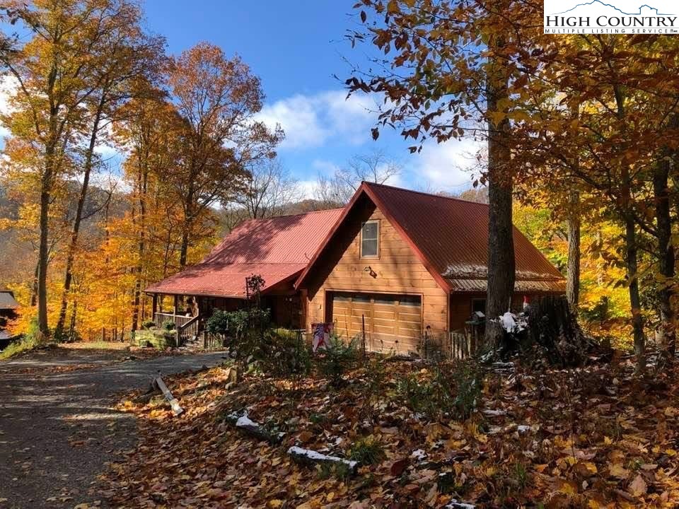 This 2 bedroom, 2.5 bath log cabin sits on just over an acre within a quiet gated community and offers approximately 2,467 square feet of comfortable High Country living at 140 Vixen Den Drive. With seasonal mountain views and the peaceful sound of a creek along the back of the property, this High Country home blends classic log cabin character with thoughtful updates. Located about 10 minutes from Elk Knob State Park, known for some of the High Country's best hiking and panoramic mountain views; plus, a scenic drive from Boone, the home offers a peaceful setting surrounded by nature, privacy, and mountain beauty. Inside, oversized windows bring in abundant natural light, highlighting the recently refinished hardwood floors and warm wood interior. Two fireplaces create inviting gathering spaces for relaxing during cool High Country evenings. The kitchen features granite countertops, a center island with seating, and generous cabinet storage, creating an inviting space for cooking and gathering. Just off the kitchen, a window-lined sunroom with hardwood floors offers a bright and welcoming space for reading, morning coffee, or a quiet workspace. The main-level primary suite offers comfort and convenience with two closets and an armoire providing excellent storage. The ensuite bathroom includes a newly updated tile shower and a jetted soaking tub, creating a comfortable space to unwind at the end of the day. Upstairs, a loft area provides additional storage, closet space, and flexibility for guests, hobbies, or additional sleeping space. The lower level offers additional living space with a bedroom, full bathroom, and a spacious living area that works well for guests or extended stays. This level also includes the laundry room, mechanical room, and access to a lower deck. Outdoor living is just as inviting with a covered front porch that offers a perfect spot for rocking chairs and quiet mountain mornings. A fire pit creates a natural gathering place for evenings outdoors, while perennial gardens throughout the property add color and seasonal interest. A paved driveway and paved parking area provide easy access and convenient parking. The home includes a detached oversized two-car garage and a finished room over the garage of 379 heated square feet, offering flexible space for storage, a workshop, studio, or home office. This additional heated area also provides excellent options for guest overflow, creative projects, or remote work. Located within a quiet gated community, residents enjoy access to an easy walking trail, a community garden just outside the gate, and a pavilion area with fire pit, picnic space, and parking for gatherings. With seasonal mountain views, natural surroundings, and flexible living spaces, this log cabin offers a relaxed High Country setting for full-time living or a mountain getaway.