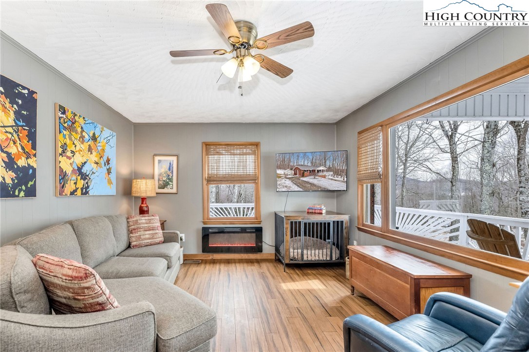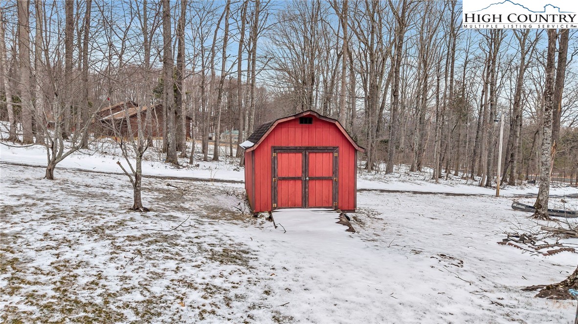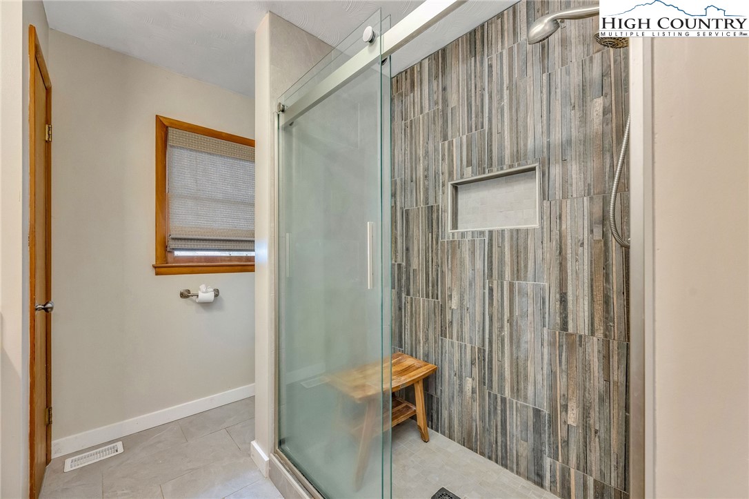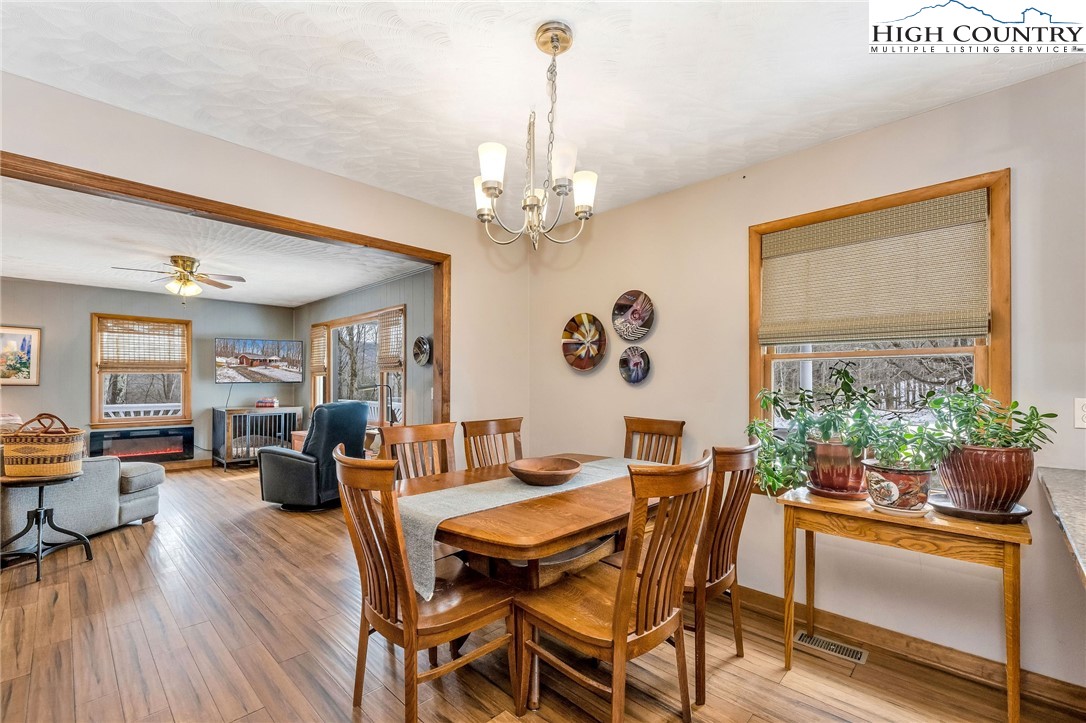 Charming brick ranch in West Jefferson offering convenience and a peaceful mountain setting just 2 miles from Old Barn Winery and Mountain Aire Golf Course. Situated on over an acre with a small stream, the property features a usable yard ideal for gardening, outdoor enjoyment, or future enhancements. A covered front porch and spacious open deck provide excellent areas for entertaining or relaxing outdoors. Step inside to a spacious living room with abundant windows, including a large picture window that frames the outdoors and fills the space with natural light. The updated kitchen features quartz countertops, complementary backsplash, custom wood cabinetry, stainless appliances, and generous counter space and storage, with peninsula seating providing a casual dining option. The dining room connects the living area and kitchen, creating easy flow for everyday living. The primary bedroom includes twin closets and a convenient half bath. The updated hall full bath features a vessel sink and beautifully tiled shower. A spacious second bedroom currently incorporates the laundry for true one-level living. Bamboo flooring runs throughout the upper level, adding warmth and durability. The unfinished lower level provides an excellent opportunity to expand heated living space and includes a wood stove offering radiant auxiliary heat. Additional features include a greenhouse, outbuilding, and a backyard well-suited for gardening or hobby use. Ample parking with a second driveway leading to the lower level. Full-time residence — please provide as much notice as possible for showings.