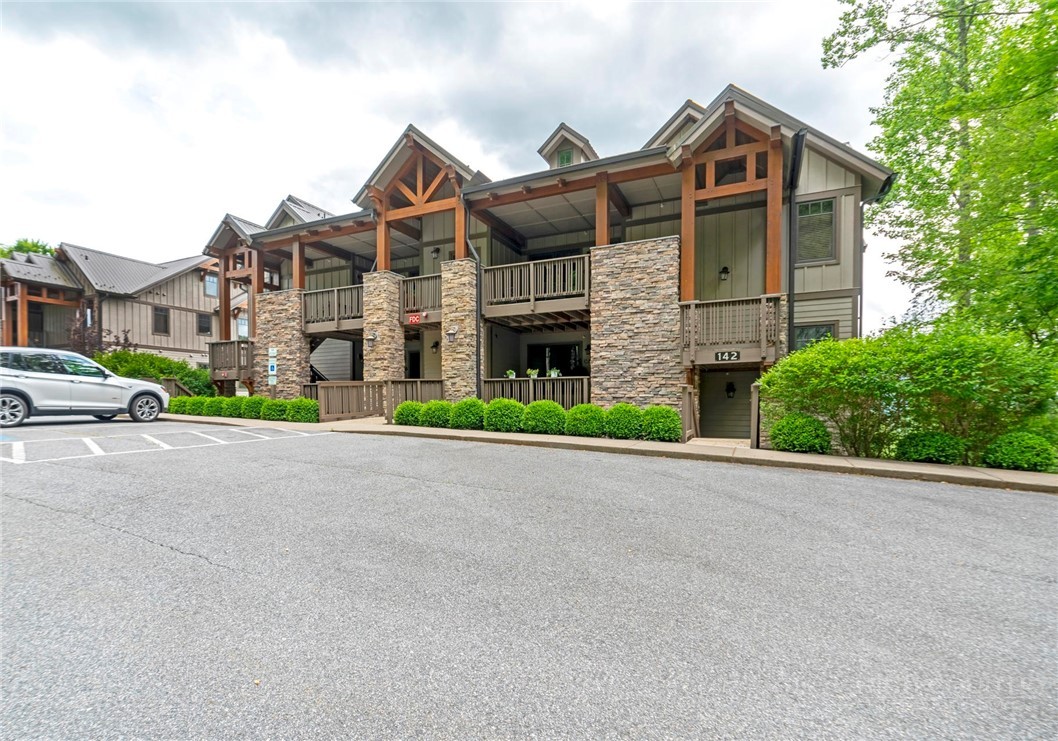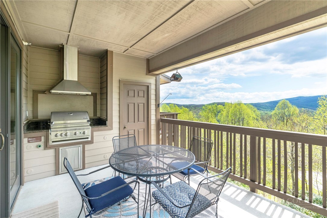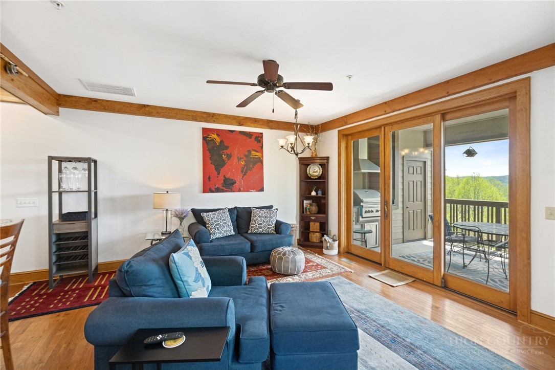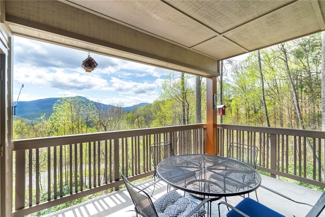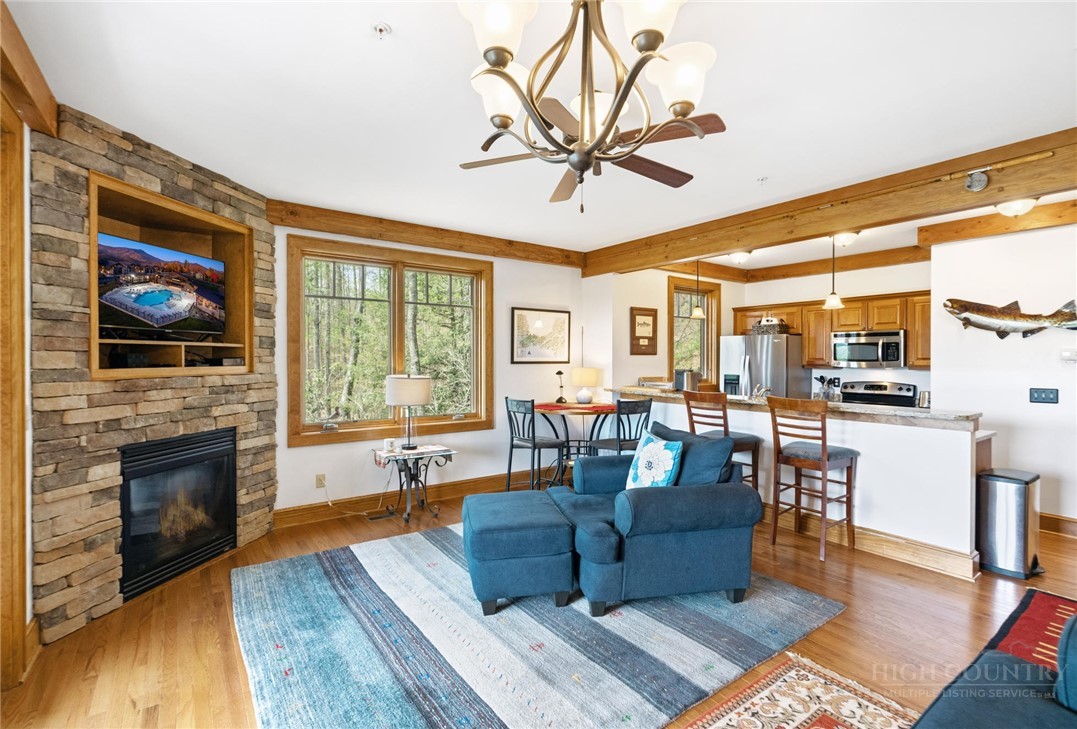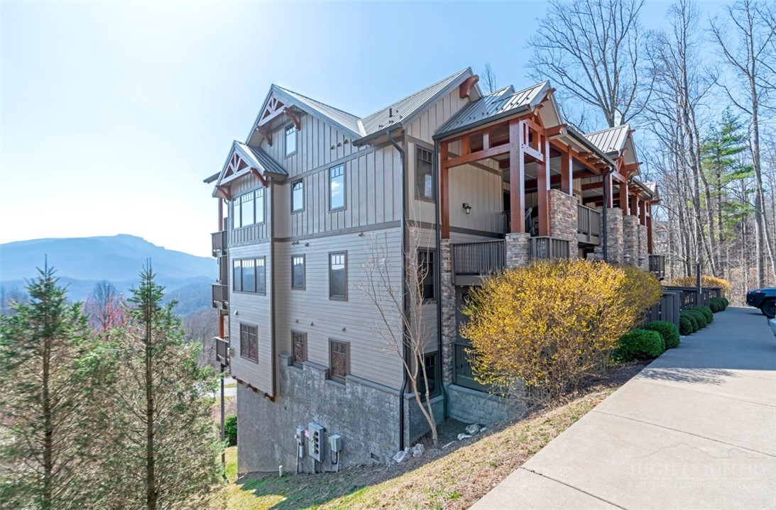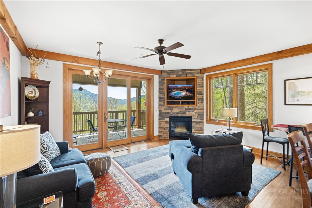 Elegant One Bedroom Condo in Chalakee with the iconic view of Grandfather Mountain! Located on the desirable Evening View Lane, this end-building, end unit offers exceptional privacy and an abundance of natural light. Being offered fully furnished, this turn key property has been exceptionally well maintained and thoughtfully updated. Finishes include hardwood flooring throughout the main living area, stacked stone gas fireplace and rustic timber frame accents throughout. The kitchen features cherry cabinetry, granite countertops and stainless steel appliances. The open living and dining area are light and bright with an abundance of windows along with floor to ceiling sliding glass doors that open to the private, covered deck with built in gas grill. Recent updates include a new refrigerator, fresh carpet and paint, updated bathroom hardware and fan, and a new thermostat — making this property truly move-in ready. Located in the sought-after gated community of Echota, owners enjoy an incredible maintenance-free lifestyle with unparalleled amenities. The community features two clubhouses, 2 outdoor pools, 1 indoor pool, 3 fitness facilities, a 25-acre riverpark, stocked fishing ponds, plus the exciting new owners-only Summit at Echota amenity center with its spectacular outdoor pool, deck, fitness facility, and skybridge.