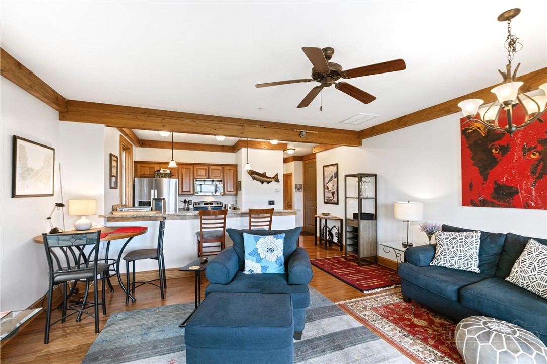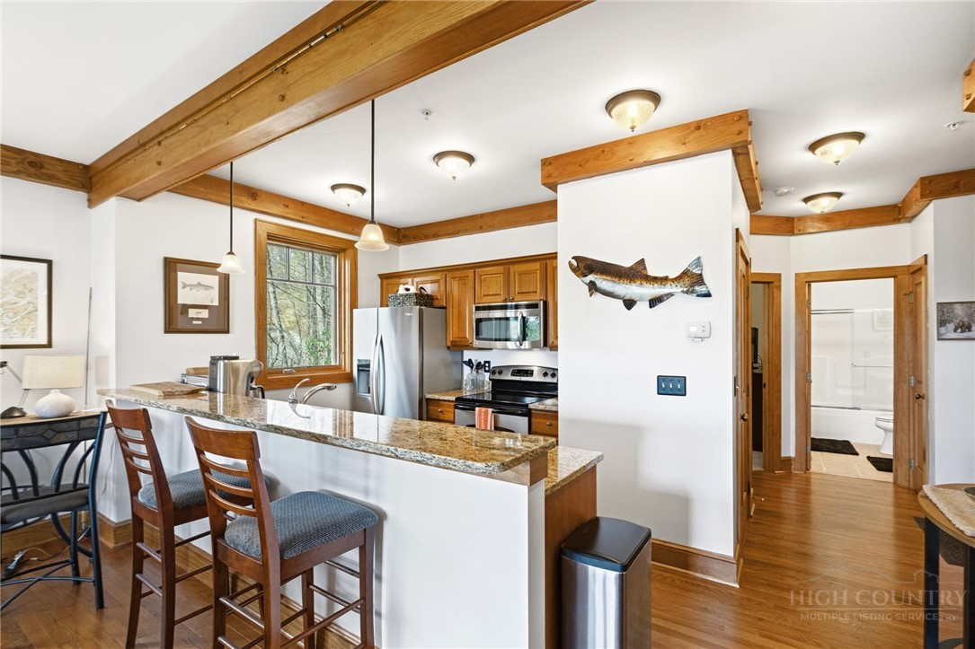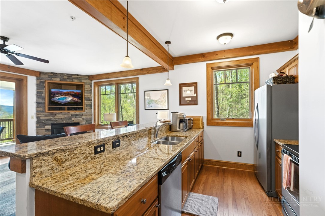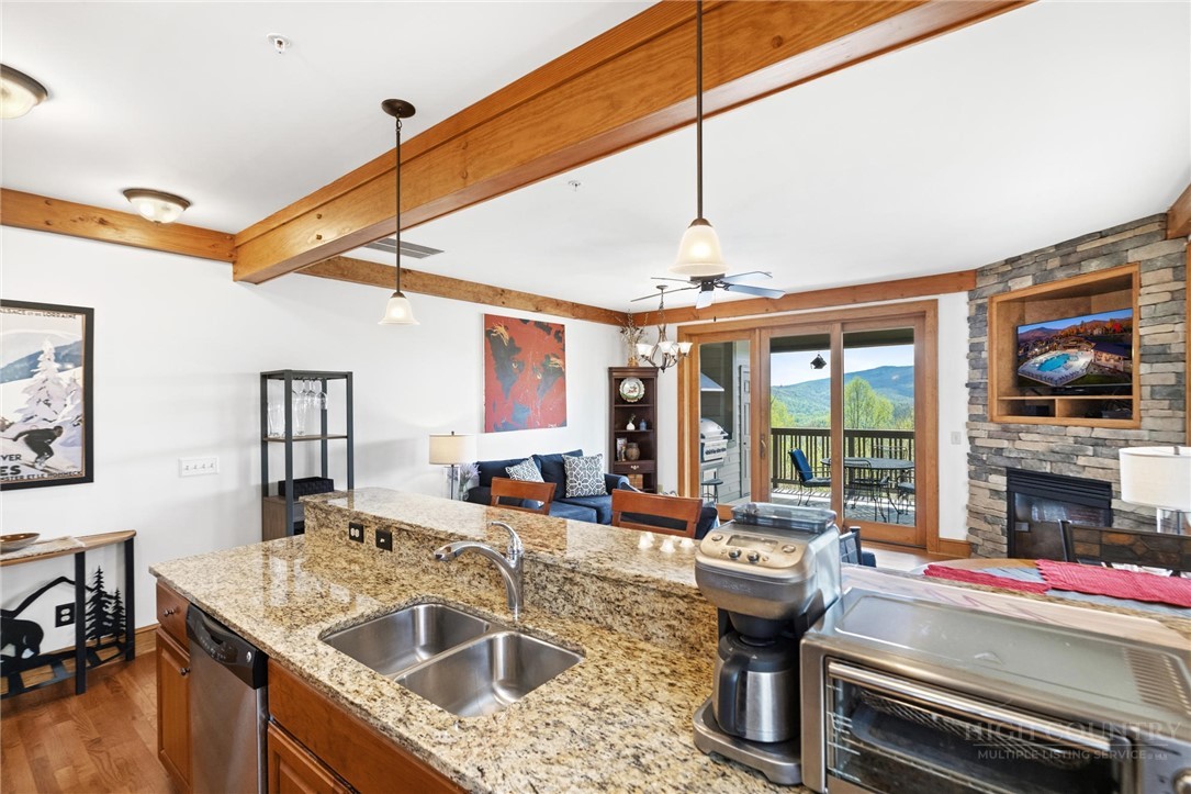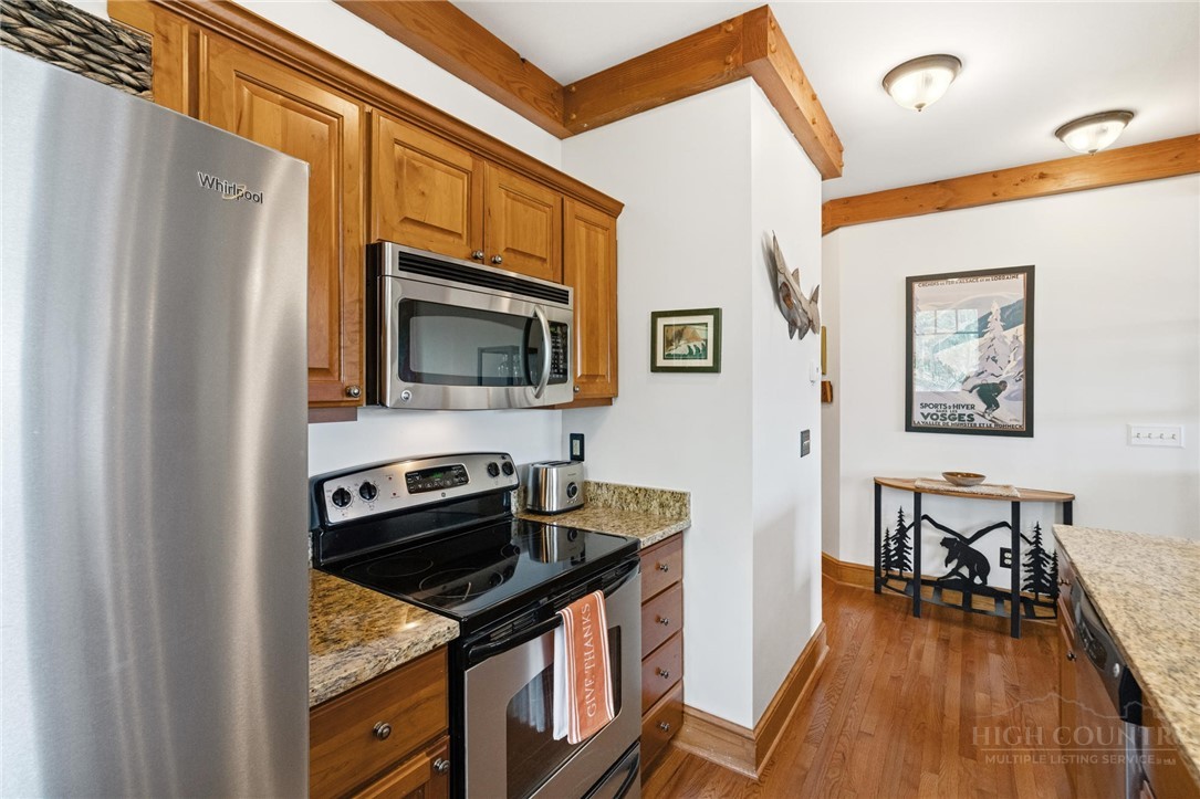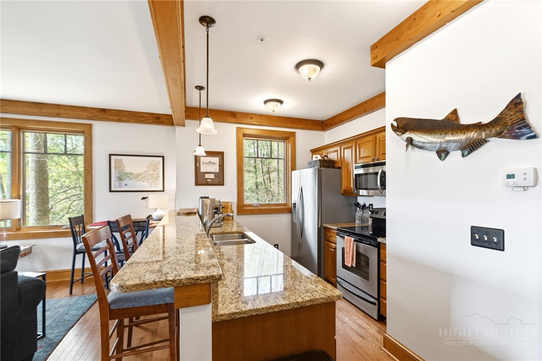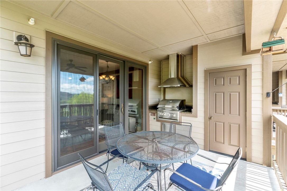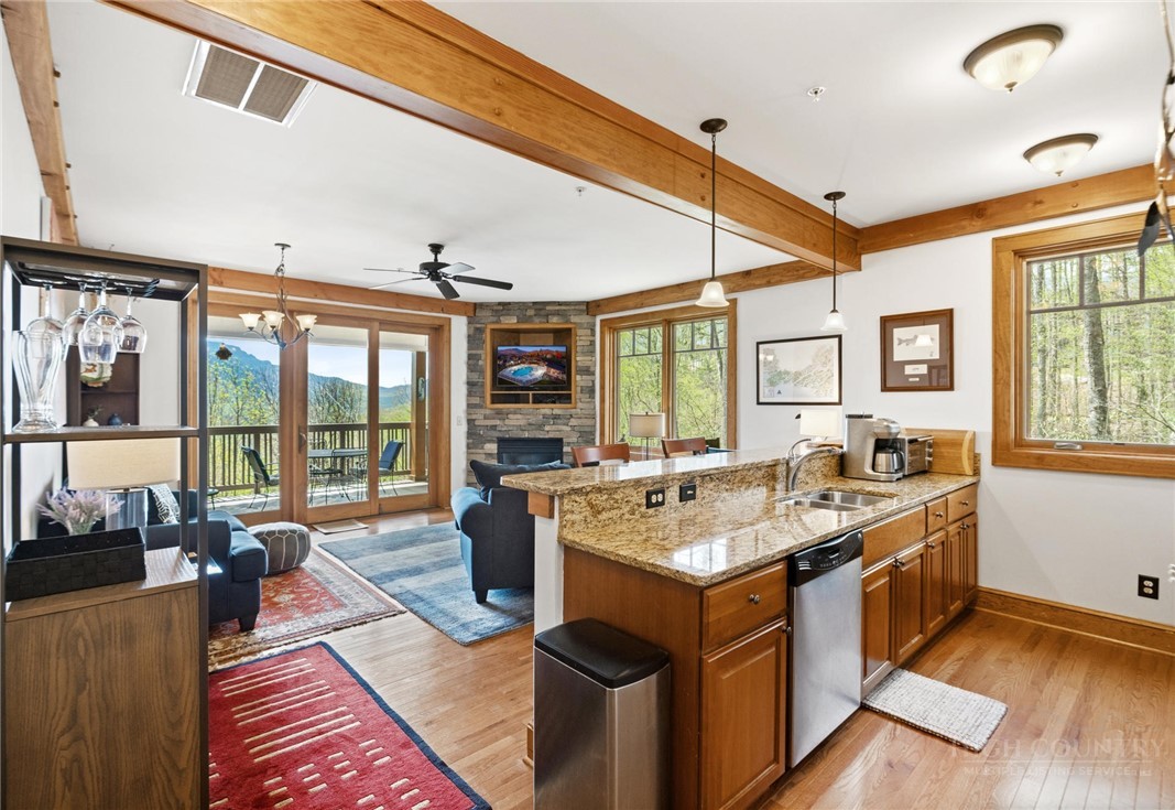 Elegant One Bedroom Condo in Chalakee with the iconic view of Grandfather Mountain! Located on the desirable Evening View Lane, this end-building, end unit offers exceptional privacy and an abundance of natural light. Being offered fully furnished, this turn key property has been exceptionally well maintained and thoughtfully updated. Finishes include hardwood flooring throughout the main living area, stacked stone gas fireplace and rustic timber frame accents throughout. The kitchen features cherry cabinetry, granite countertops and stainless steel appliances. The open living and dining area are light and bright with an abundance of windows along with floor to ceiling sliding glass doors that open to the private, covered deck with built in gas grill. Recent updates include a new refrigerator, fresh carpet and paint, updated bathroom hardware and fan, and a new thermostat — making this property truly move-in ready. Located in the sought-after gated community of Echota, owners enjoy an incredible maintenance-free lifestyle with unparalleled amenities. The community features two clubhouses, 2 outdoor pools, 1 indoor pool, 3 fitness facilities, a 25-acre riverpark, stocked fishing ponds, plus the exciting new owners-only Summit at Echota amenity center with its spectacular outdoor pool, deck, fitness facility, and skybridge.