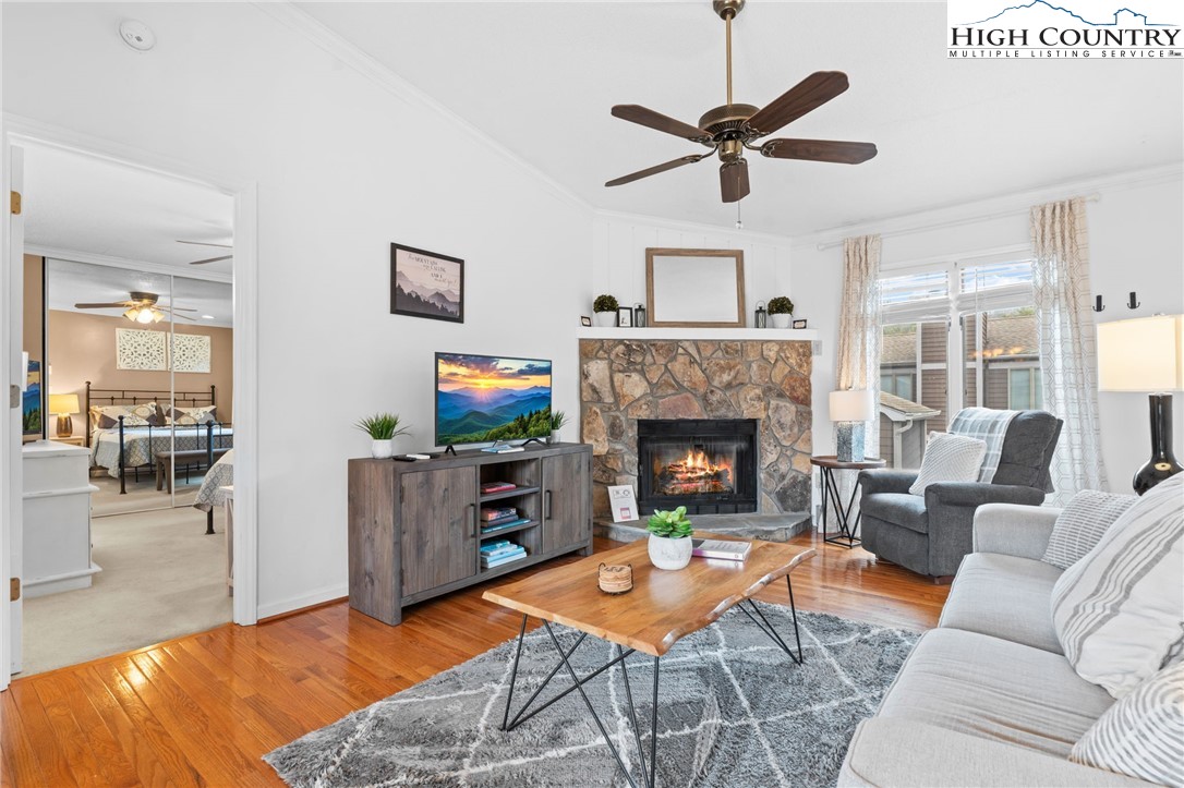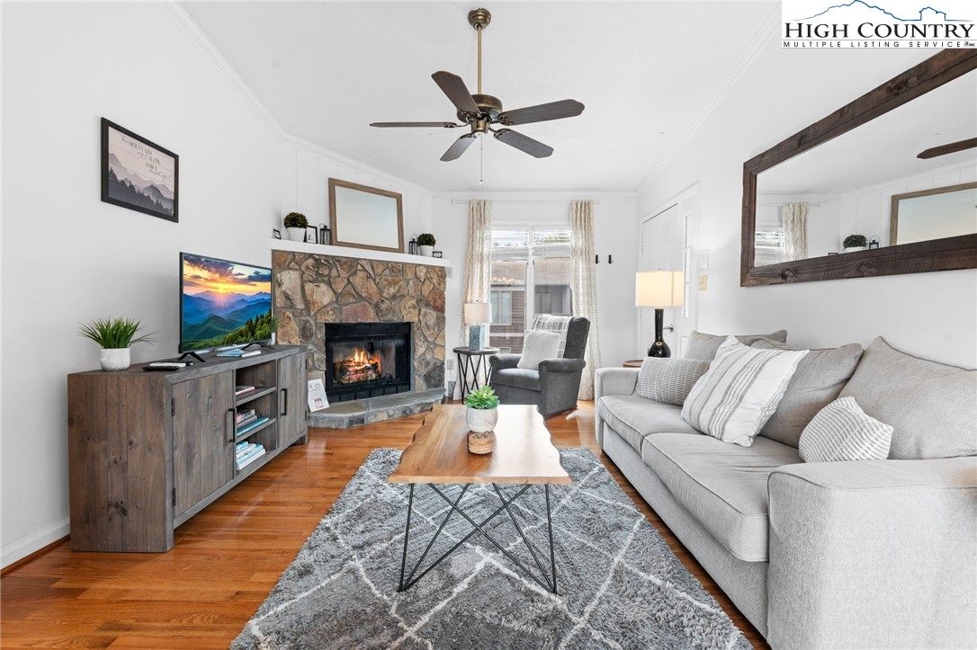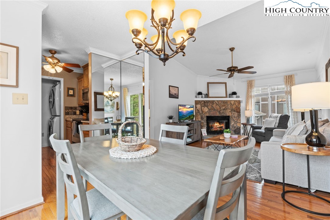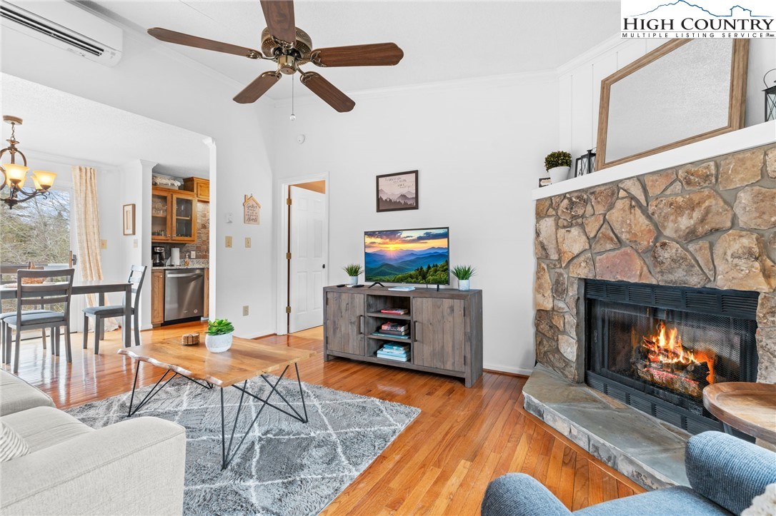 Tucked into the heart of Blowing Rock, this fully furnished condominium offers the ideal blend of mountain charm and walkable convenience. Inside, you’ll find two spacious bedrooms, each with its own private ensuite bath, creating a comfortable and functional layout for guests or full-time living. The living room features a stone-faced fireplace and soaring cathedral ceilings, adding warmth and architectural interest while enhancing the sense of space and light. The dining area opens to a private balcony — a highly sought-after feature, with only a limited number of units in the complex offering this outdoor extension. It’s the perfect spot for morning coffee or cool mountain evenings. The galley-style kitchen is efficiently designed and comes complete with a full appliance package, generous pantry storage, and a stackable washer and dryer for everyday convenience. Located just a short stroll from Main Street, you’ll enjoy easy access to charming boutiques, art galleries, and local dining. Outdoor enthusiasts will appreciate the close proximity to the scenic Blue Ridge Parkway, offering miles of breathtaking views and recreation. With vacation rentals permitted, this property presents a compelling opportunity as a full-time residence, second home, or income-producing investment in one of the High Country’s most desirable destinations.