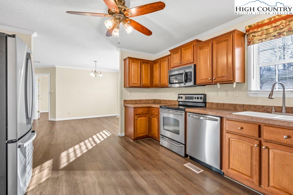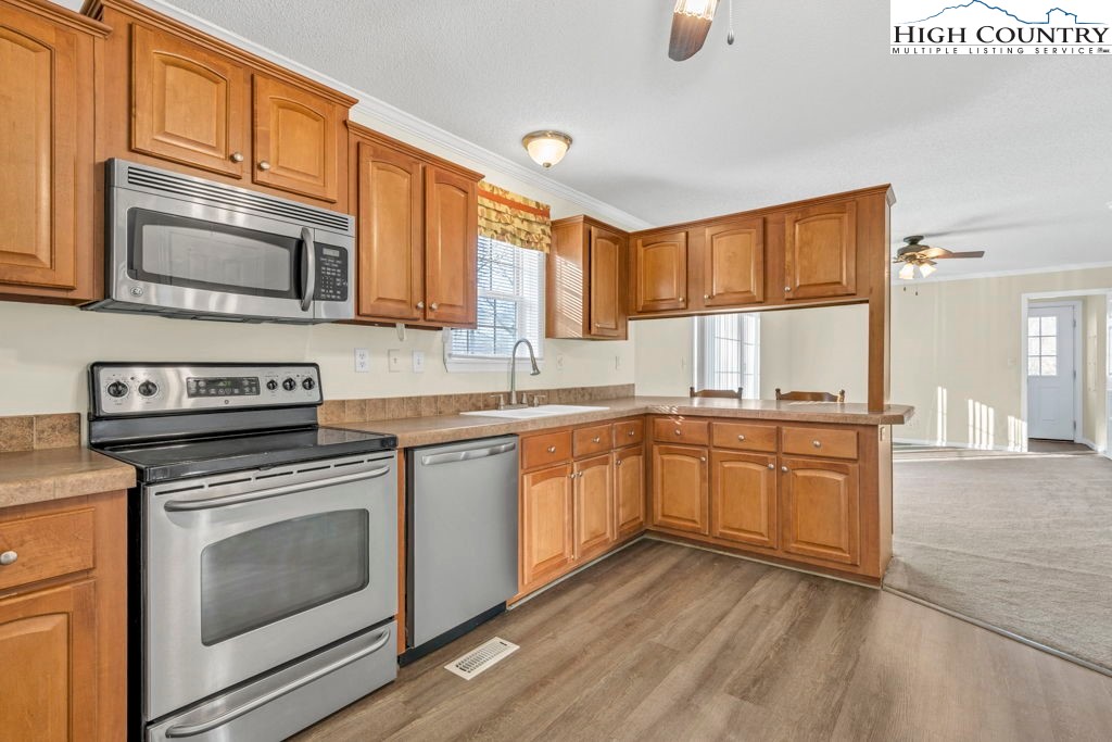 Enjoy easy access, one-level living, spacious lawn and more from this well maintained 4BR/3BA, 2052sq.ft. home on .91 acres minutes from Boone! Home features central heat/air, spacious kitchen with stainless steel appliances and pantry, dining area, den, living room, office, laundry area, primary suite with double vanity, tub and separate shower, 3 additional bedrooms and 2 additional baths. Other features include low maintenance exterior, high speed fiber optic internet, new refrigerator, new dishwasher, and newer lvp flooring in kitchen, laundry area, office and baths. Exterior features include front covered porch, open back deck, 2 detached storage sheds, mature flower beds, apple trees, paved driveway and seasonal long range mountain views. Located less than 10-15 minutes via easy commute to downtown Boone, AppState and many other high-country attractions!