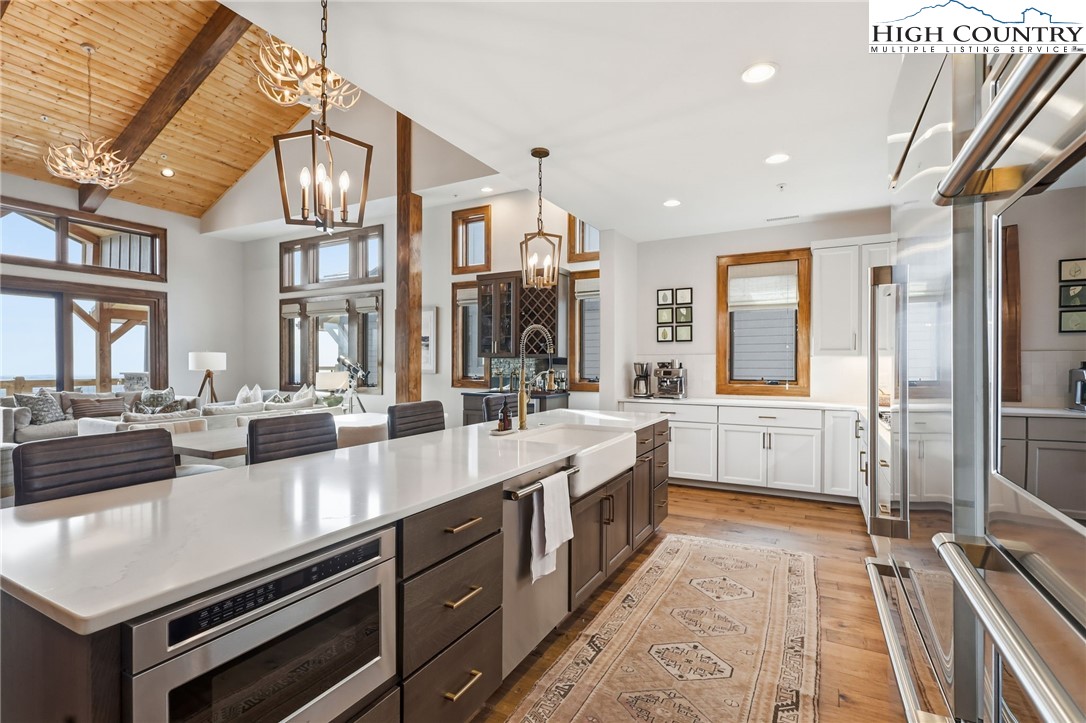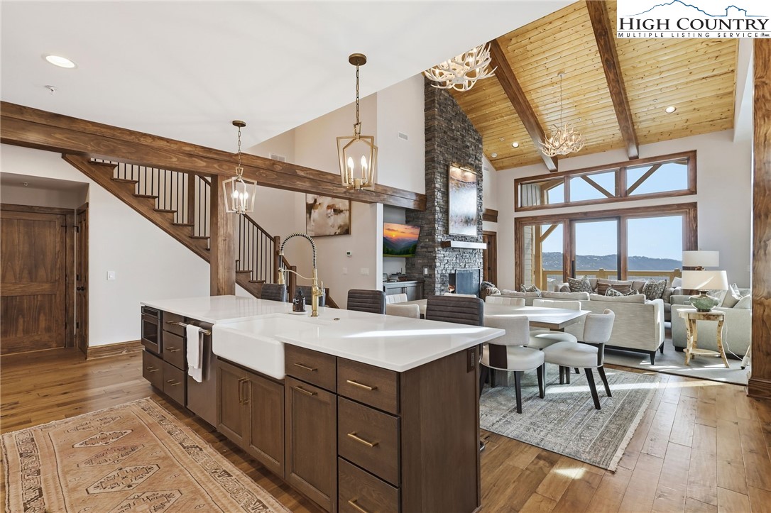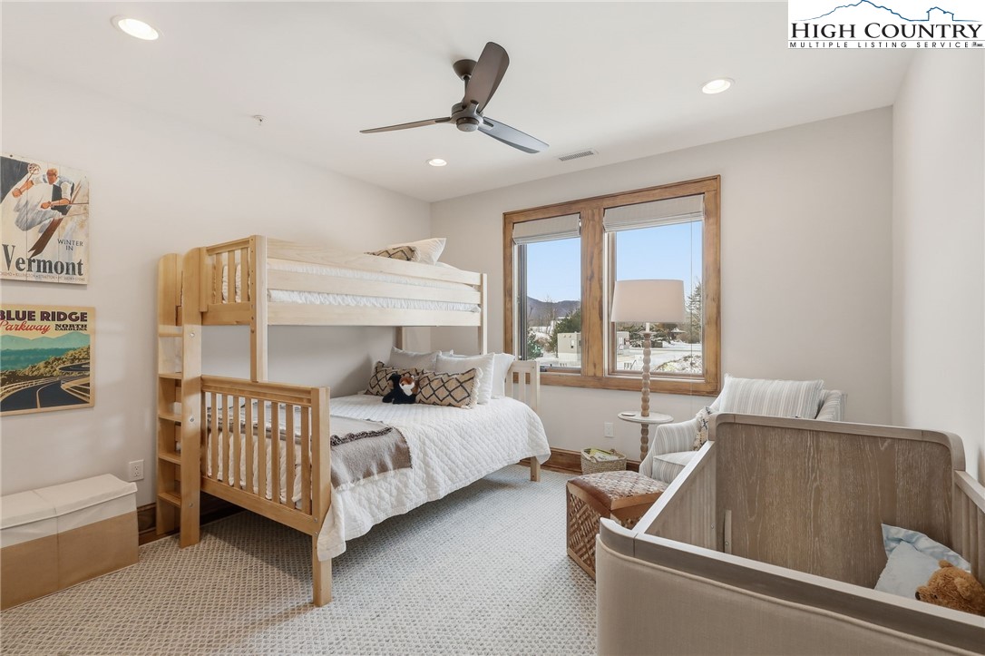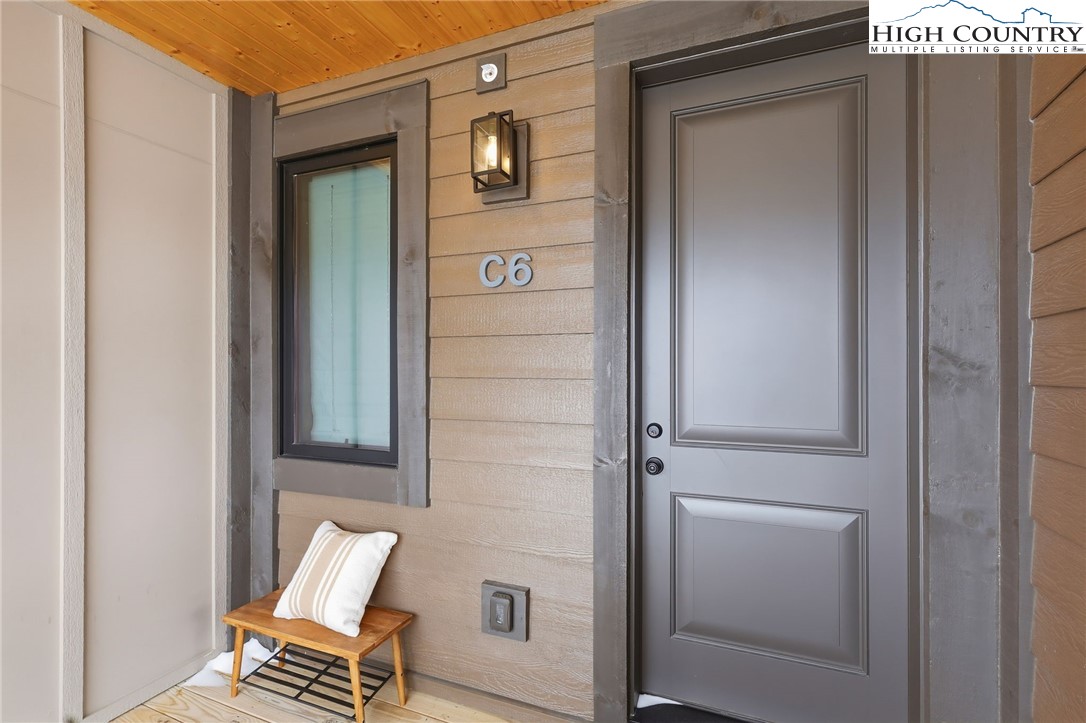 Expansive gorge views define this well-appointed upper-level three-bedroom condominium at The Bluffs at Blowing Rock. This is the first-ever resale of a top-floor unit. Thoughtful upgrades, quality finishes, and tasteful designer furnishings make this newly constructed unit truly move-in ready. A gracious open floor plan allows for effortless flow through the main living areas, ideal for both everyday living and entertaining. The great room showcases a dramatic floor-to-ceiling stacked stone fireplace with gas logs, rising to a vaulted wood-and-beam ceiling accented by elegant antler chandeliers. Large windows and direct access to the deck frame the layered Johns River Gorge views. The kitchen is equally impressive, featuring an upgraded appliance package with double wall ovens, a microwave drawer, and an extended island with bar seating. A refined wet bar just off the living area includes a wine cooler and custom antique mirror backsplash, an inviting space for hosting guests. Off the main living area, a covered deck offers a built-in propane grill and fireplace, creating a comfortable outdoor extension of the home. The primary bedroom, located on the main level, enjoys the same sweeping gorge views through a wall of windows and is beautifully appointed with grasscloth wallpaper and an elegant canopy bed. A hall office with designer wallpaper and a custom glass door provides a quiet workspace and could also function as an additional sleeping area. A spacious guest bedroom and shared full bath complete the main level. Upstairs, a custom high-end carpeted stair runner leads to a generous loft currently arranged as a TV and lounge area. An additional guest bedroom and full hall bath provide privacy and comfort for visitors. This unit features numerous high-quality upgrades throughout, inclusive of custom fiberglass balcony railing panels, glass shower enclosures in guest baths, automatic shades in the primary bedroom and great room, and matching window treatments throughout. As an upper-level unit with elevator access, C6 is well positioned just inside the gated entrance of The Bluffs, offering convenient access in and out, as well as proximity to green space and utility receptacles. Located just ten minutes from downtown Blowing Rock, the Blue Ridge Parkway, and all the High Country has to offer, this exceptional residence presents a rare opportunity to own a thoughtfully designed, turnkey home with outstanding views. The unit is being sold mostly furnished with an inclusion list.