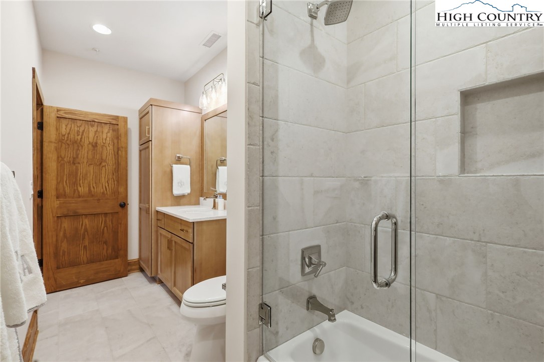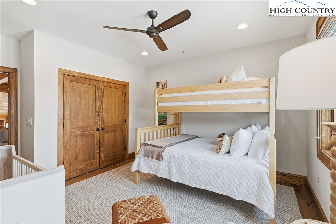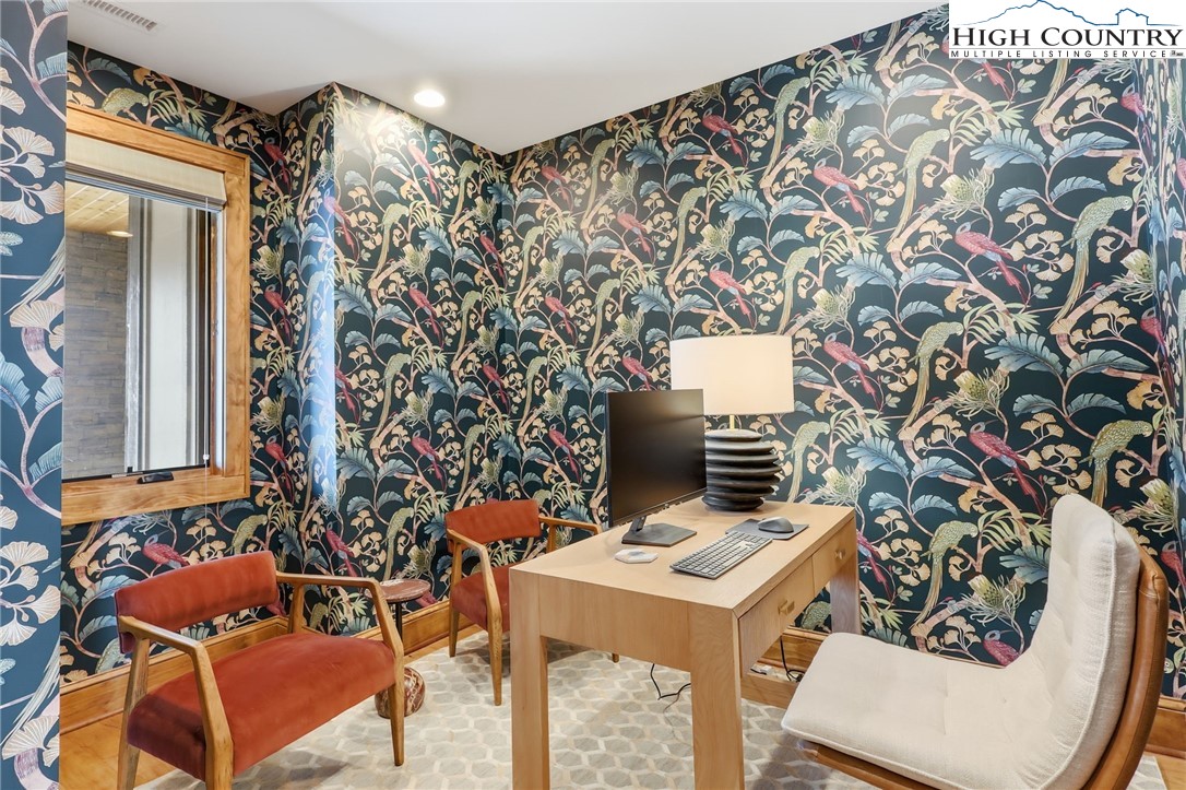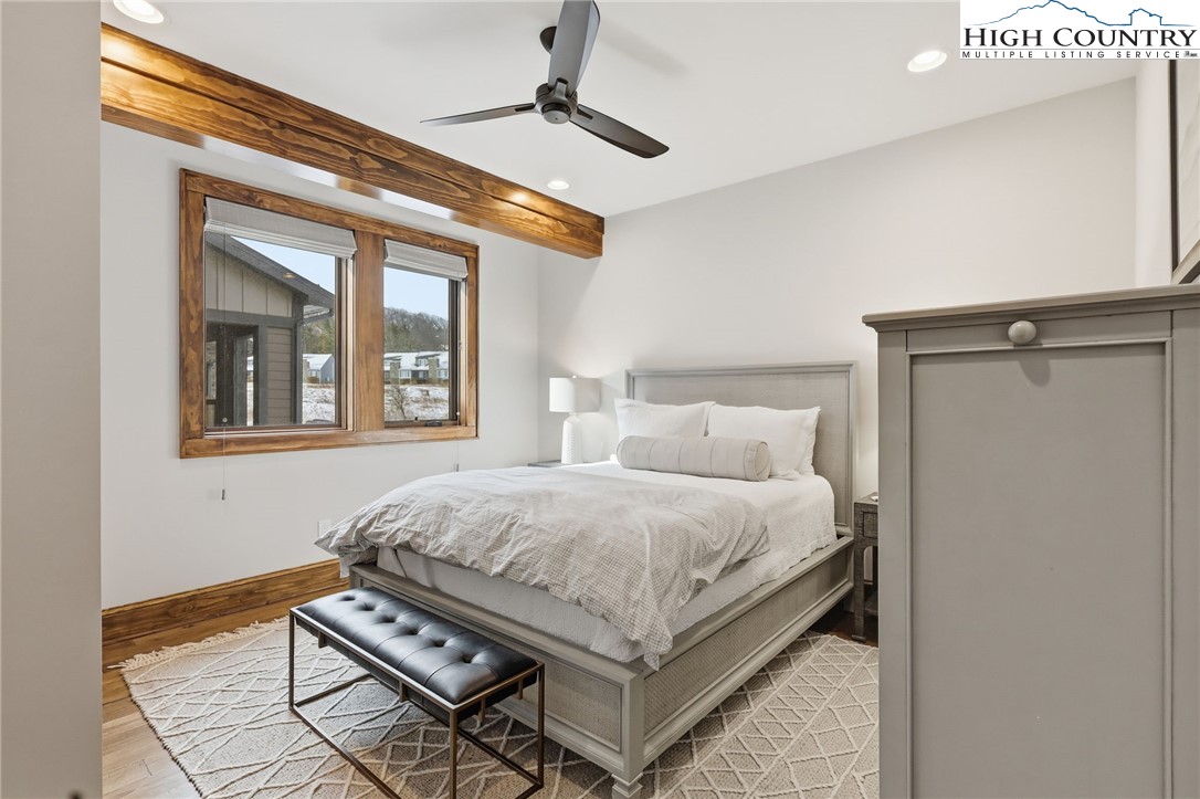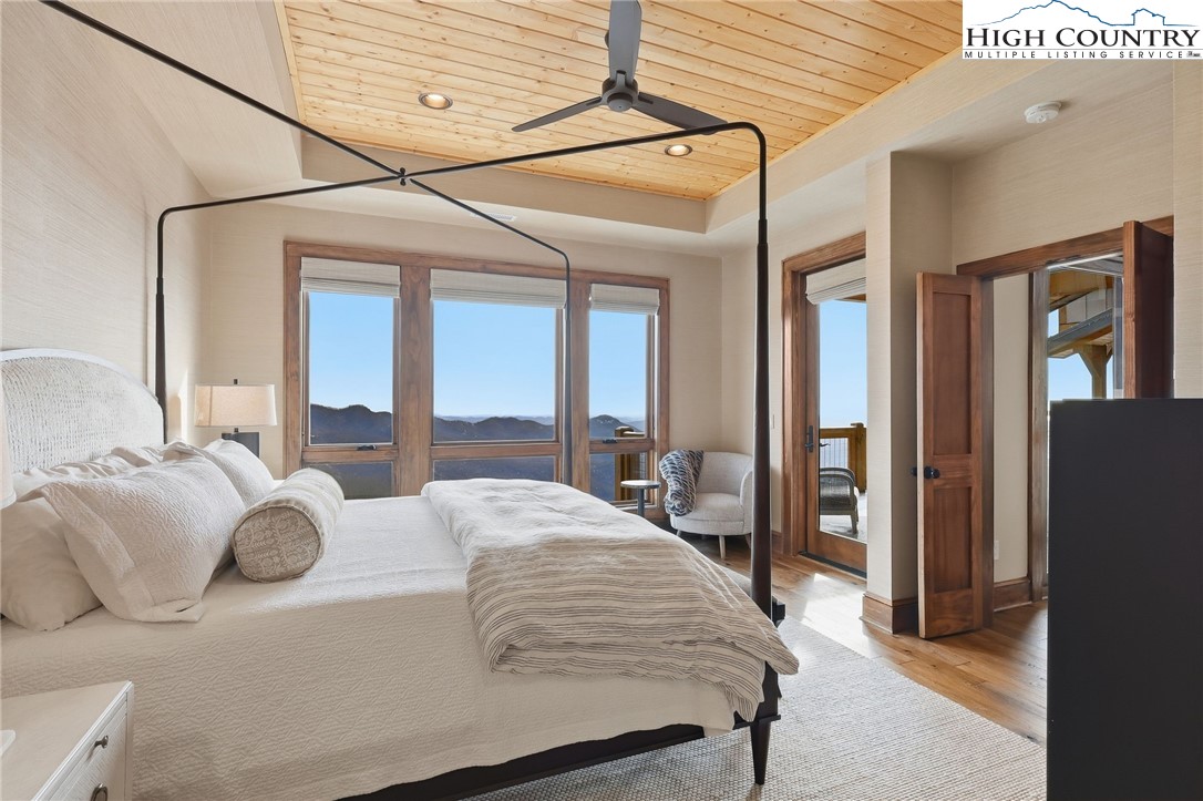 Expansive gorge views define this well-appointed upper-level three-bedroom condominium at The Bluffs at Blowing Rock. This is the first-ever resale of a top-floor unit. Thoughtful upgrades, quality finishes, and tasteful designer furnishings make this newly constructed unit truly move-in ready. A gracious open floor plan allows for effortless flow through the main living areas, ideal for both everyday living and entertaining. The great room showcases a dramatic floor-to-ceiling stacked stone fireplace with gas logs, rising to a vaulted wood-and-beam ceiling accented by elegant antler chandeliers. Large windows and direct access to the deck frame the layered Johns River Gorge views. The kitchen is equally impressive, featuring an upgraded appliance package with double wall ovens, a microwave drawer, and an extended island with bar seating. A refined wet bar just off the living area includes a wine cooler and custom antique mirror backsplash, an inviting space for hosting guests. Off the main living area, a covered deck offers a built-in propane grill and fireplace, creating a comfortable outdoor extension of the home. The primary bedroom, located on the main level, enjoys the same sweeping gorge views through a wall of windows and is beautifully appointed with grasscloth wallpaper and an elegant canopy bed. A hall office with designer wallpaper and a custom glass door provides a quiet workspace and could also function as an additional sleeping area. A spacious guest bedroom and shared full bath complete the main level. Upstairs, a custom high-end carpeted stair runner leads to a generous loft currently arranged as a TV and lounge area. An additional guest bedroom and full hall bath provide privacy and comfort for visitors. This unit features numerous high-quality upgrades throughout, inclusive of custom fiberglass balcony railing panels, glass shower enclosures in guest baths, automatic shades in the primary bedroom and great room, and matching window treatments throughout. As an upper-level unit with elevator access, C6 is well positioned just inside the gated entrance of The Bluffs, offering convenient access in and out, as well as proximity to green space and utility receptacles. Located just ten minutes from downtown Blowing Rock, the Blue Ridge Parkway, and all the High Country has to offer, this exceptional residence presents a rare opportunity to own a thoughtfully designed, turnkey home with outstanding views. The unit is being sold mostly furnished with an inclusion list.