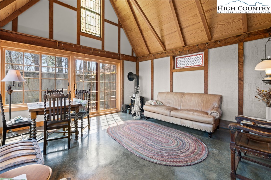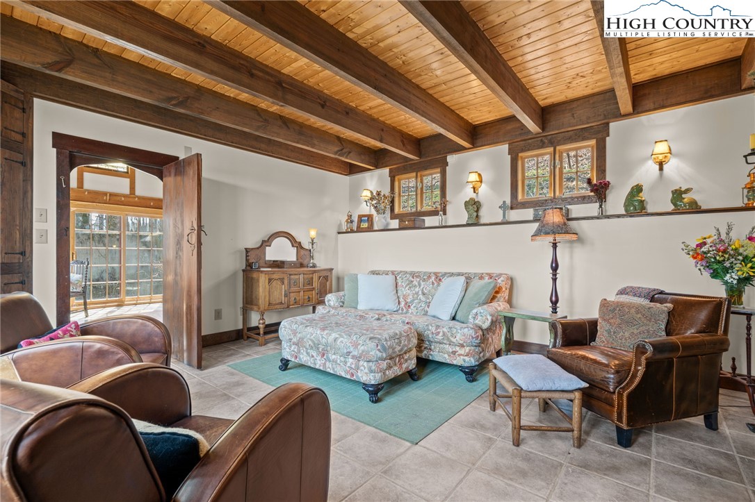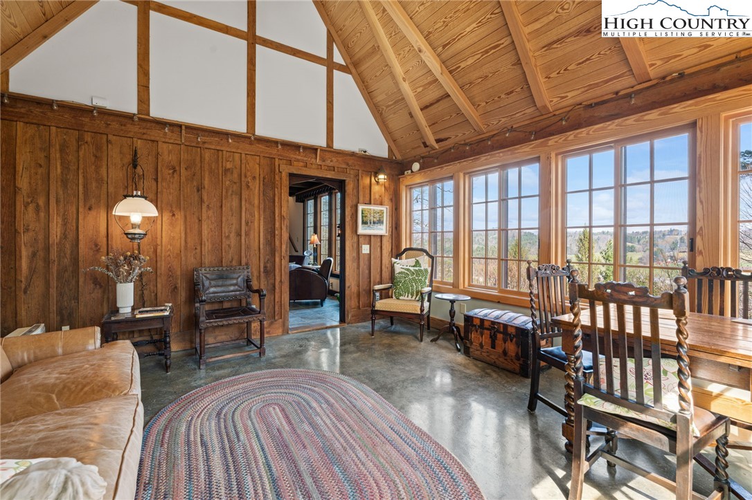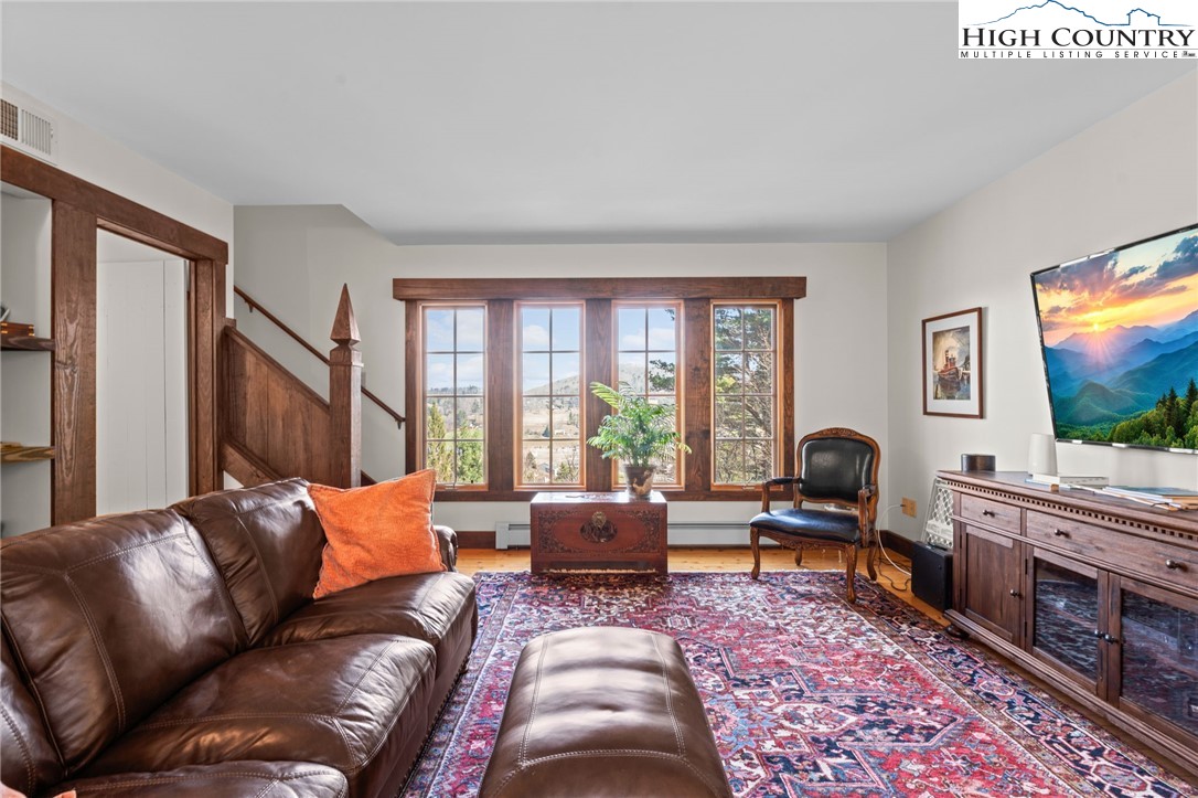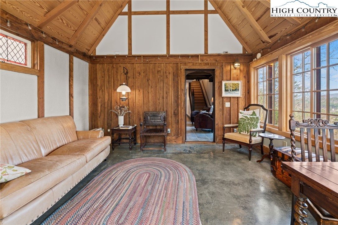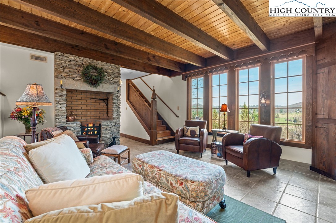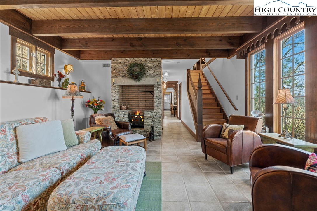 So much to offer! Nestled just above the Boone Golf Club in the charming Kellwood neighborhood, this beautifully crafted 3 bedroom, 2.5 bath Tudor style home captures stunning views of Bamboo Valley and the essence of High Country living. Ideally located just minutes from Boone, Blowing Rock and the Blue Ridge Parkway this home is perfectly suited as a full time residence or a serene mountain getaway. Custom built with a creative touch, this one of a kind home features a thoughtfully designed layout and unique architectural details throughout. The main level welcomes you with a beautiful eat-in kitchen, a spacious living room anchored by a stone fireplace with gas logs and, with the exception of the sunroom, radiant floors throughout. The spectacular sunroom offers polished concrete floors, a wood stove and a custom stained glass window as well as direct access to the outdoor patio and landscaped grounds. The second floor primary suite is a true retreat, featuring a private den, full bath, laundry area, large walk in closet and dedicated office space. The third floor offers two additional bedrooms, a full bath another sitting area and access to a small charming turret patio. A versatile bonus room, accessed from the mudroom, is currently used as a guest space but would make an excellent office, fitness room, yoga studio or creative workspace. Recent upgrades include a new heating system, new refrigerator and oven and a Generac generator for added peace of mind. With exceptional character, flexible living space, and a prime location, this home offers endless possibilities. Don't miss your chance to make it your own!