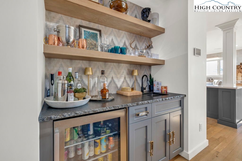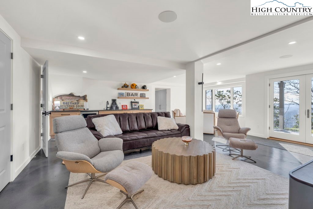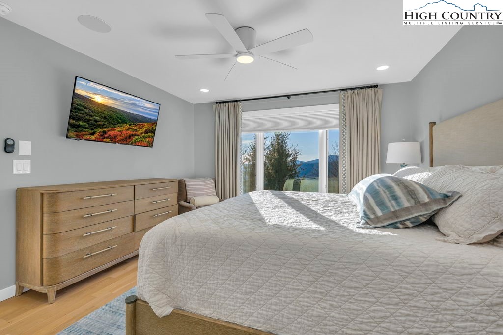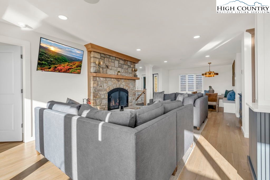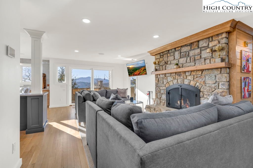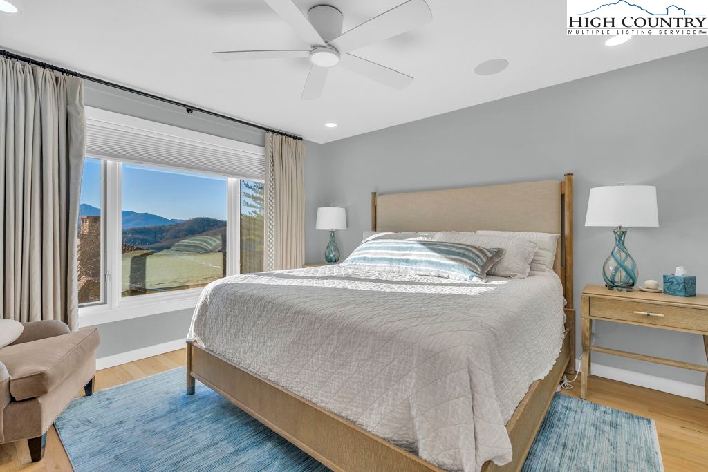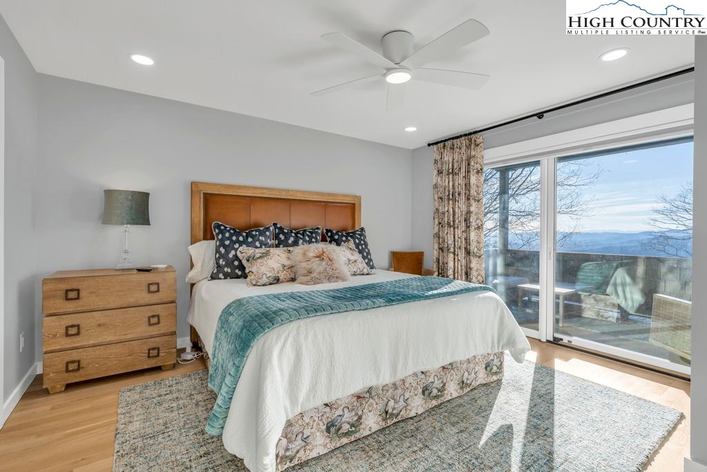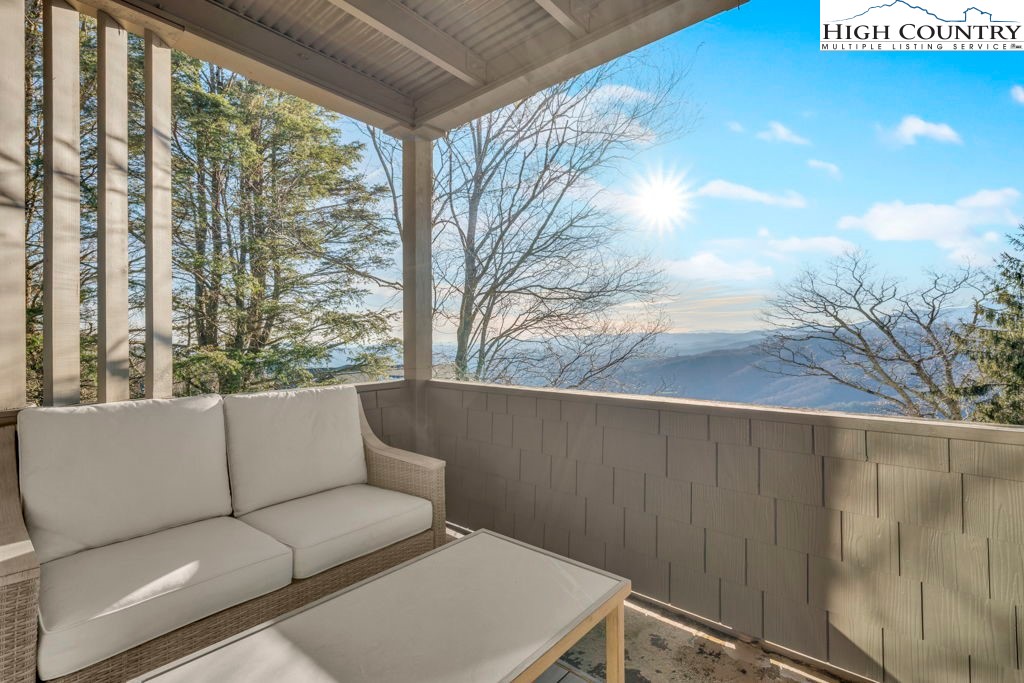 Sophisticated luxury condominium located in the coveted Mayview Park area of Blowing Rock is situated within a private gated community, and offers exceptional long-range, multi-layer mountain views to the south and west. This elegant property provides the full scope and style of mountain grandeur. Ideally positioned within walking distance to restaurants, parks, and the Village of Blowing Rock, this residence combines breathtaking scenery with tremendous convenience. Professionally designed by Architect Jill Spaeh and entirely renovated down to the studs completed in 2024, the home features new HVAC, electrical, plumbing, kitchen, baths, flooring, and more, all reflecting meticulous attention to detail and refined mountain distinction throughout. The thoughtfully designed layout includes 4 bedrooms and 4.5 baths. A welcoming entry foyer opens to expansive open-concept living and dining areas highlighted by white oak hardwood floors, custom white oak paneling, and a wood-burning fireplace. Adjacent entertaining spaces include a wet bar and seamless access to the covered deck with built-in tables and a lounge area—ideal for enjoying sweeping views to include Grandfather Mountain and layered peaks exceeding 5,000 feet in elevation with unforgettable sunsets. The open living areas flow into a gourmet kitchen with custom cabinetry and premium appliances, including GE Café Professional Series stainless steel appliances with double convection ovens, gas range, warming drawer, dishwasher, Thermador refrigerator and freezer, and a large island with bar seating—perfect for everyday living and entertaining. The main level offers three bedrooms, including a luxurious primary suite with spa-like ensuite bath featuring elegant tilework, upscale fixtures, and a walk-in closet. Two additional guest suites each include beautifully appointed baths, along with a convenient main-level half bath. The lower walk-out level features a fourth bedroom and full bath, a family room with flat-screen TV, white oak paneling, custom built-in cabinetry with wine storage, wet bar with beverage refrigerator, sitting area, and direct outdoor access. A well-appointed laundry room with built-ins and utility sink, along with abundant storage, including a spacious seasonal closet, adds exceptional functionality. Mayview Manor Court Community amenities include a swimming pool, and all just minutes from the Village of Blowing Rock, with walkability to dining, shopping, parks, galleries, trails, and much more.