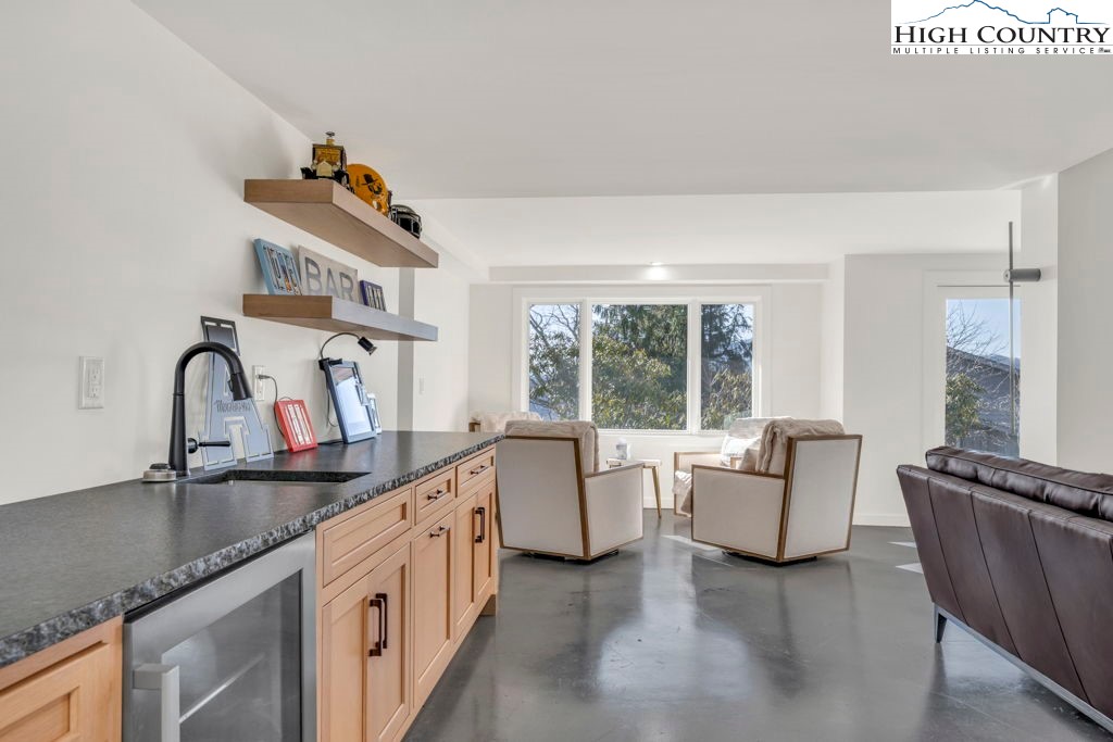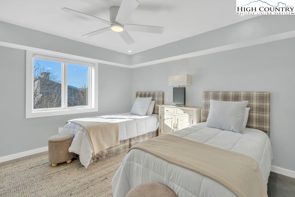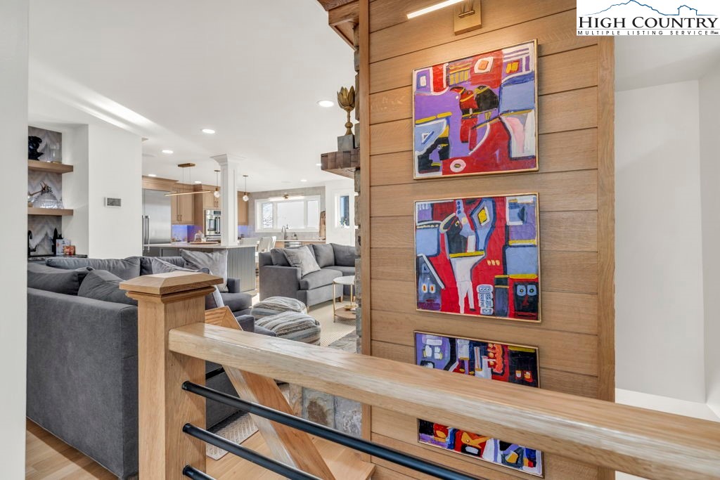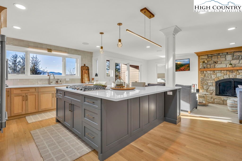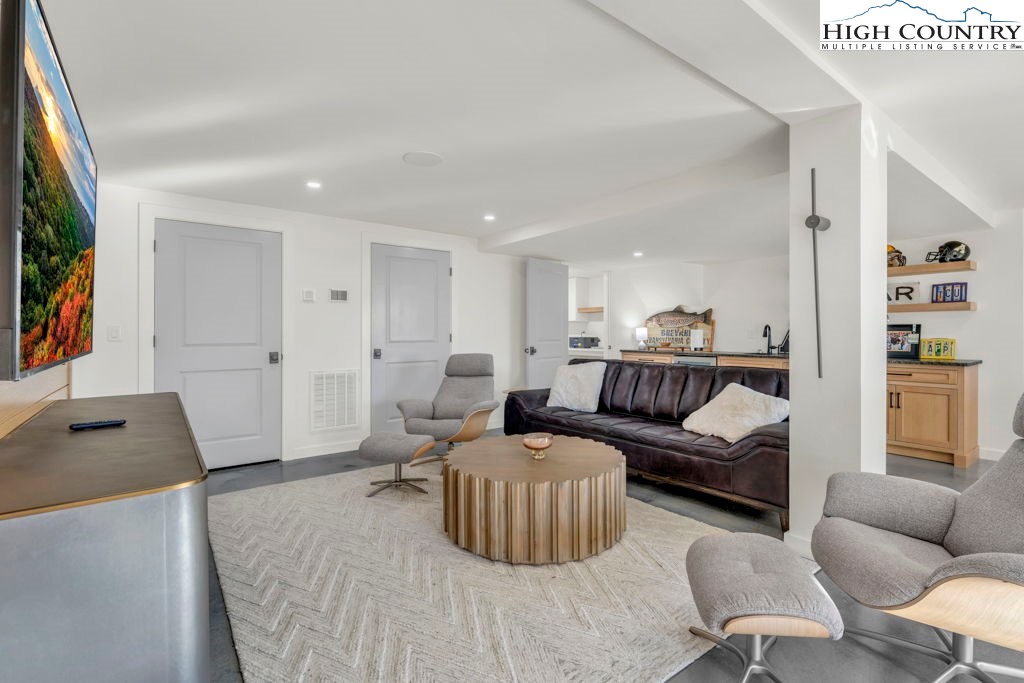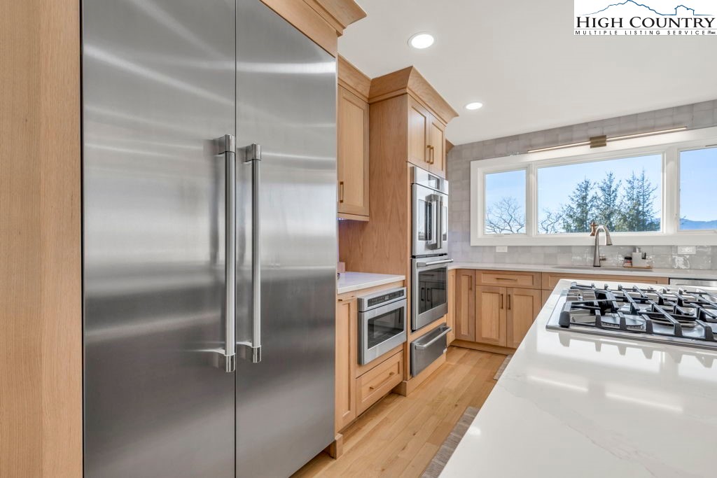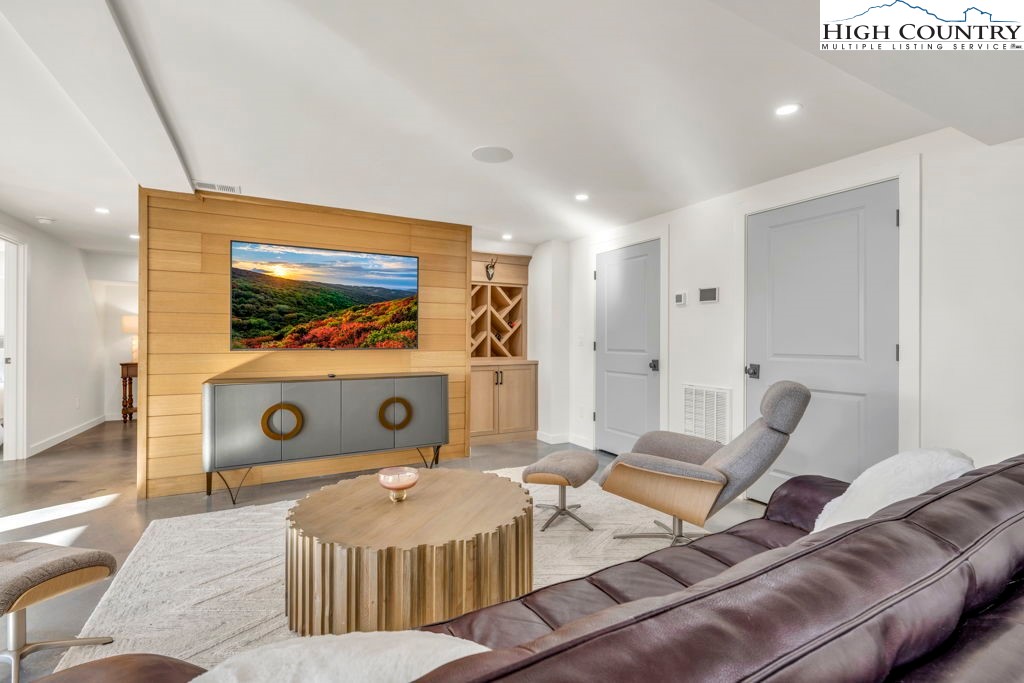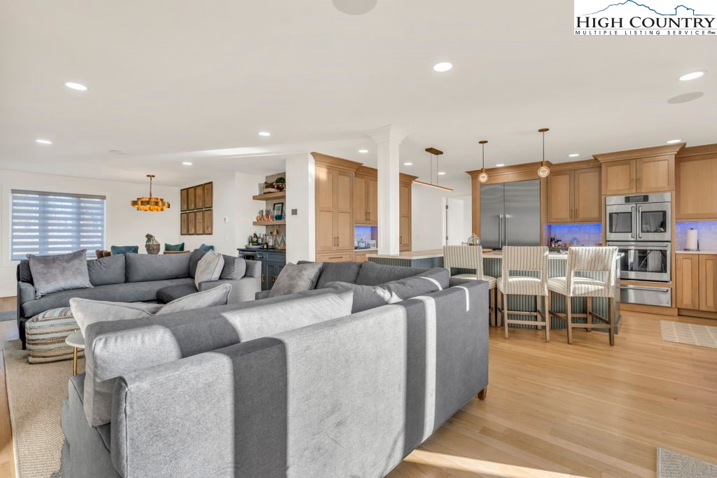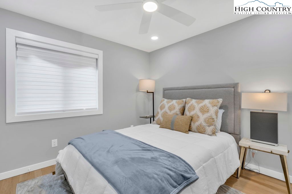 Sophisticated luxury condominium located in the coveted Mayview Park area of Blowing Rock is situated within a private gated community, and offers exceptional long-range, multi-layer mountain views to the south and west. This elegant property provides the full scope and style of mountain grandeur. Ideally positioned within walking distance to restaurants, parks, and the Village of Blowing Rock, this residence combines breathtaking scenery with tremendous convenience. Professionally designed by Architect Jill Spaeh and entirely renovated down to the studs completed in 2024, the home features new HVAC, electrical, plumbing, kitchen, baths, flooring, and more, all reflecting meticulous attention to detail and refined mountain distinction throughout. The thoughtfully designed layout includes 4 bedrooms and 4.5 baths. A welcoming entry foyer opens to expansive open-concept living and dining areas highlighted by white oak hardwood floors, custom white oak paneling, and a wood-burning fireplace. Adjacent entertaining spaces include a wet bar and seamless access to the covered deck with built-in tables and a lounge area—ideal for enjoying sweeping views to include Grandfather Mountain and layered peaks exceeding 5,000 feet in elevation with unforgettable sunsets. The open living areas flow into a gourmet kitchen with custom cabinetry and premium appliances, including GE Café Professional Series stainless steel appliances with double convection ovens, gas range, warming drawer, dishwasher, Thermador refrigerator and freezer, and a large island with bar seating—perfect for everyday living and entertaining. The main level offers three bedrooms, including a luxurious primary suite with spa-like ensuite bath featuring elegant tilework, upscale fixtures, and a walk-in closet. Two additional guest suites each include beautifully appointed baths, along with a convenient main-level half bath. The lower walk-out level features a fourth bedroom and full bath, a family room with flat-screen TV, white oak paneling, custom built-in cabinetry with wine storage, wet bar with beverage refrigerator, sitting area, and direct outdoor access. A well-appointed laundry room with built-ins and utility sink, along with abundant storage, including a spacious seasonal closet, adds exceptional functionality. Mayview Manor Court Community amenities include a swimming pool, and all just minutes from the Village of Blowing Rock, with walkability to dining, shopping, parks, galleries, trails, and much more.