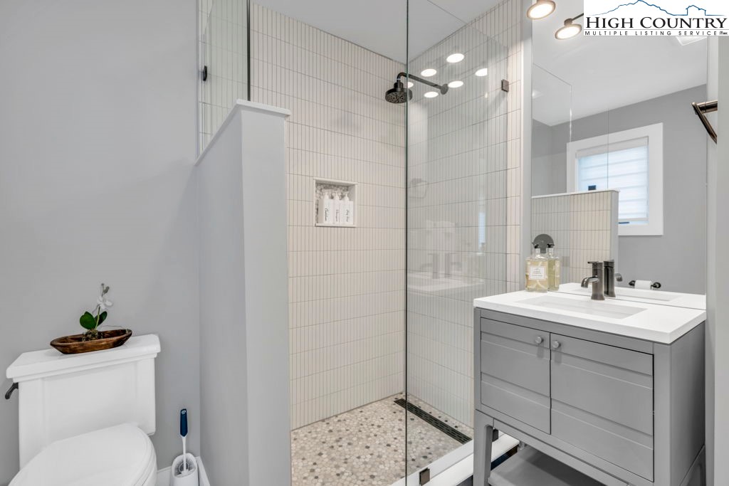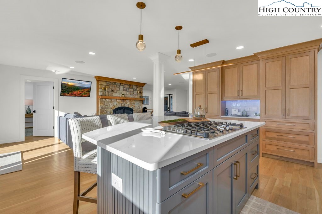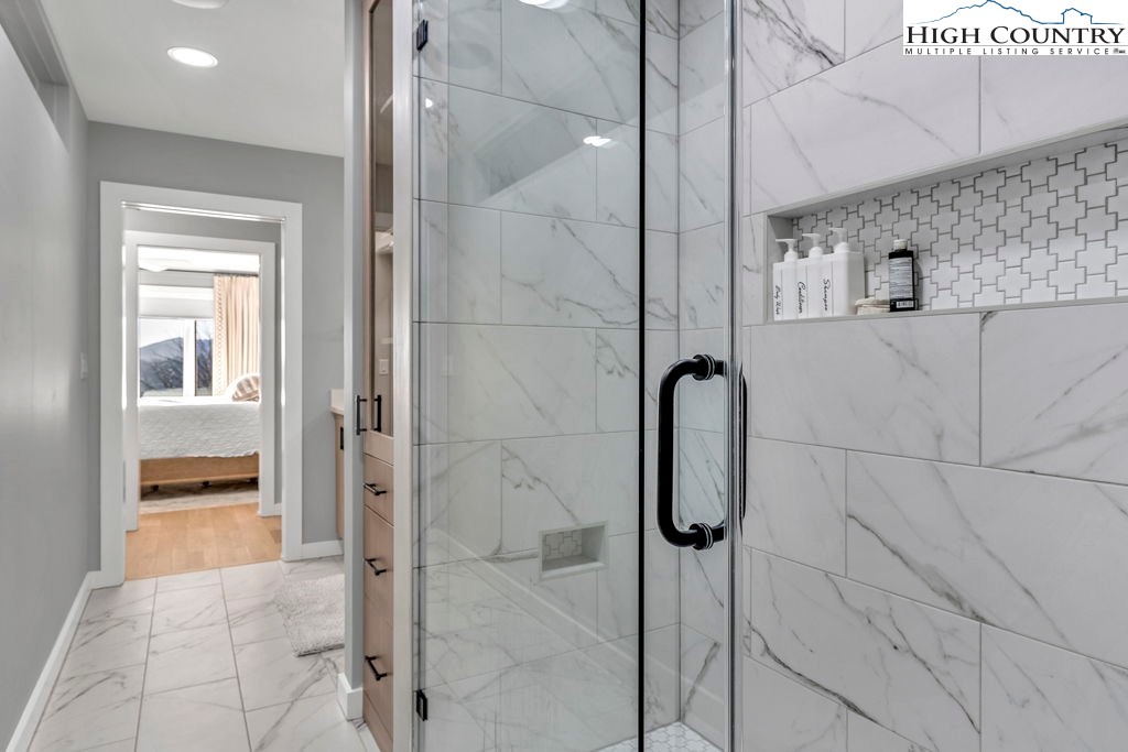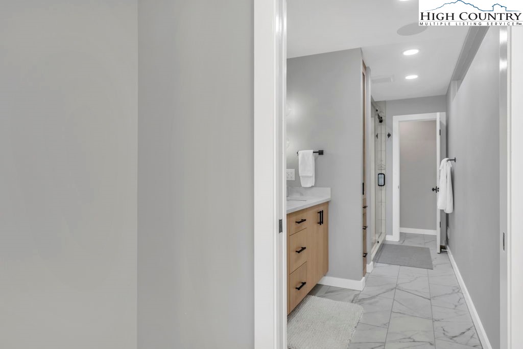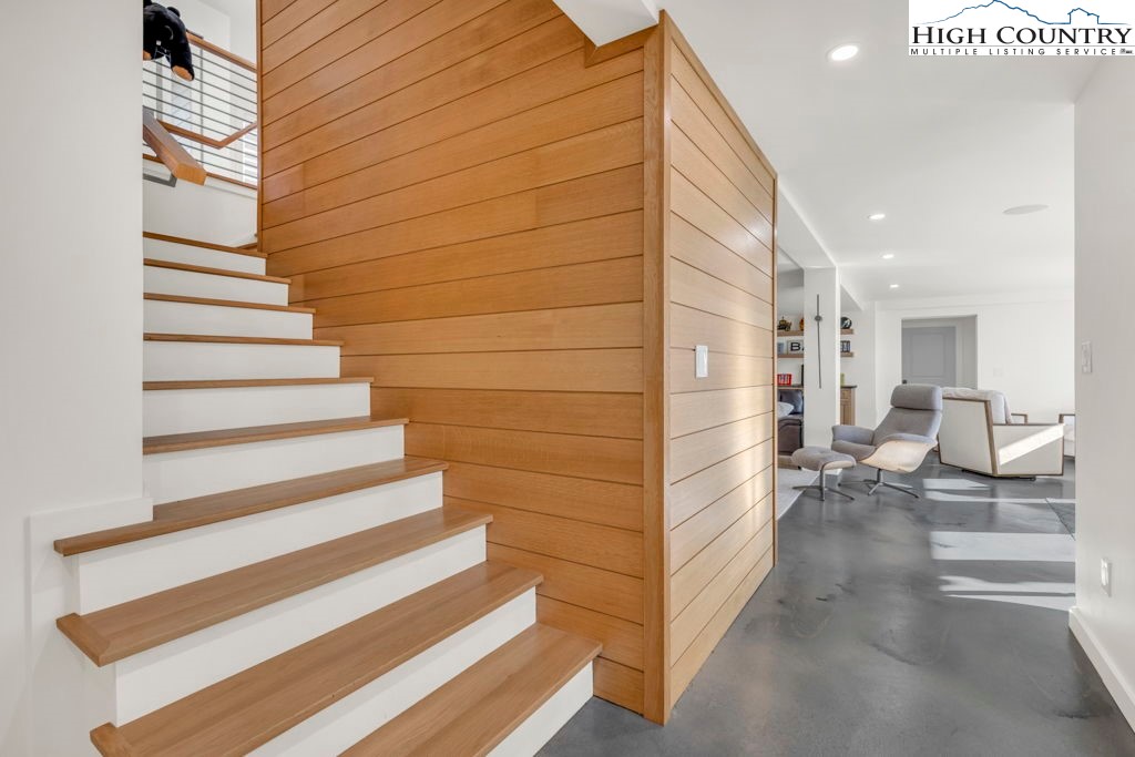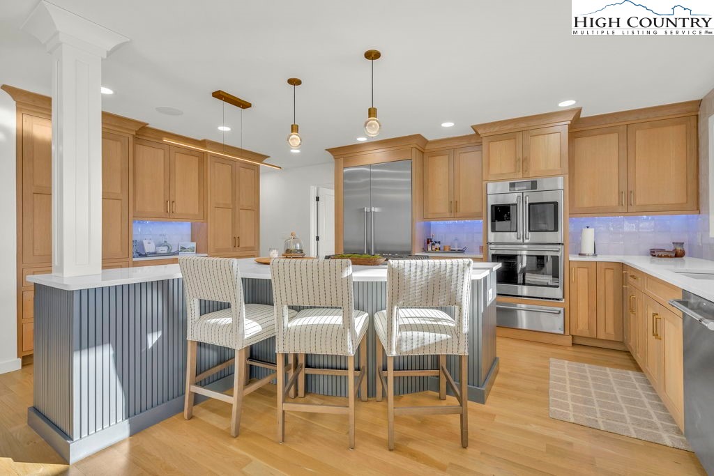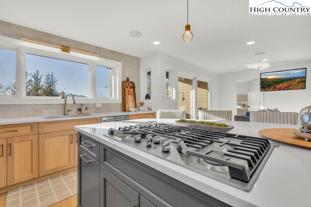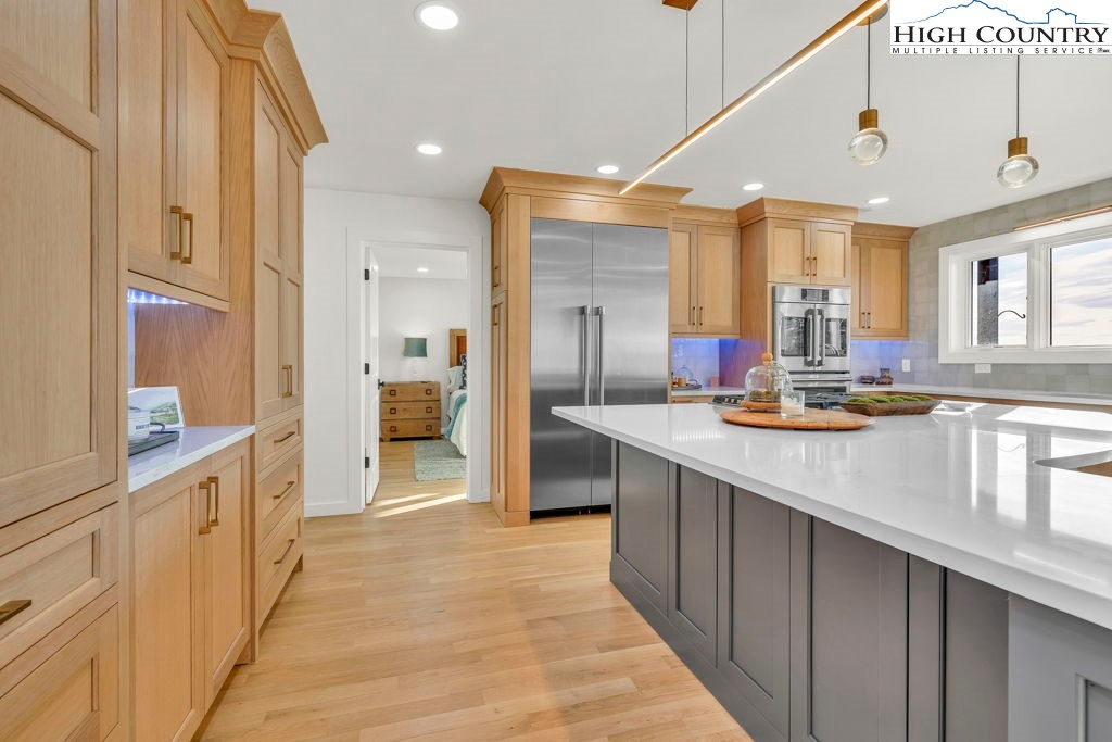 Sophisticated luxury condominium located in the coveted Mayview Park area of Blowing Rock is situated within a private gated community, and offers exceptional long-range, multi-layer mountain views to the south and west. This elegant property provides the full scope and style of mountain grandeur. Ideally positioned within walking distance to restaurants, parks, and the Village of Blowing Rock, this residence combines breathtaking scenery with tremendous convenience. Professionally designed by Architect Jill Spaeh and entirely renovated down to the studs completed in 2024, the home features new HVAC, electrical, plumbing, kitchen, baths, flooring, and more, all reflecting meticulous attention to detail and refined mountain distinction throughout. The thoughtfully designed layout includes 4 bedrooms and 4.5 baths. A welcoming entry foyer opens to expansive open-concept living and dining areas highlighted by white oak hardwood floors, custom white oak paneling, and a wood-burning fireplace. Adjacent entertaining spaces include a wet bar and seamless access to the covered deck with built-in tables and a lounge area—ideal for enjoying sweeping views to include Grandfather Mountain and layered peaks exceeding 5,000 feet in elevation with unforgettable sunsets. The open living areas flow into a gourmet kitchen with custom cabinetry and premium appliances, including GE Café Professional Series stainless steel appliances with double convection ovens, gas range, warming drawer, dishwasher, Thermador refrigerator and freezer, and a large island with bar seating—perfect for everyday living and entertaining. The main level offers three bedrooms, including a luxurious primary suite with spa-like ensuite bath featuring elegant tilework, upscale fixtures, and a walk-in closet. Two additional guest suites each include beautifully appointed baths, along with a convenient main-level half bath. The lower walk-out level features a fourth bedroom and full bath, a family room with flat-screen TV, white oak paneling, custom built-in cabinetry with wine storage, wet bar with beverage refrigerator, sitting area, and direct outdoor access. A well-appointed laundry room with built-ins and utility sink, along with abundant storage, including a spacious seasonal closet, adds exceptional functionality. Mayview Manor Court Community amenities include a swimming pool, and all just minutes from the Village of Blowing Rock, with walkability to dining, shopping, parks, galleries, trails, and much more.