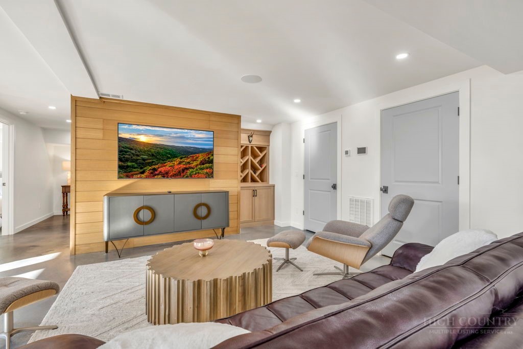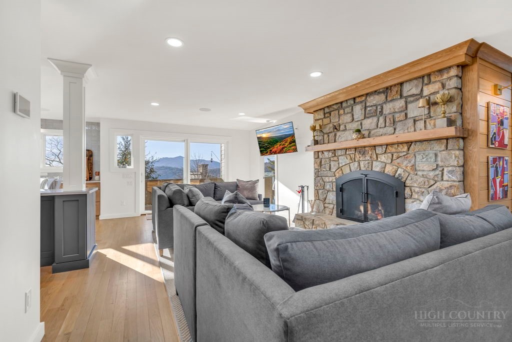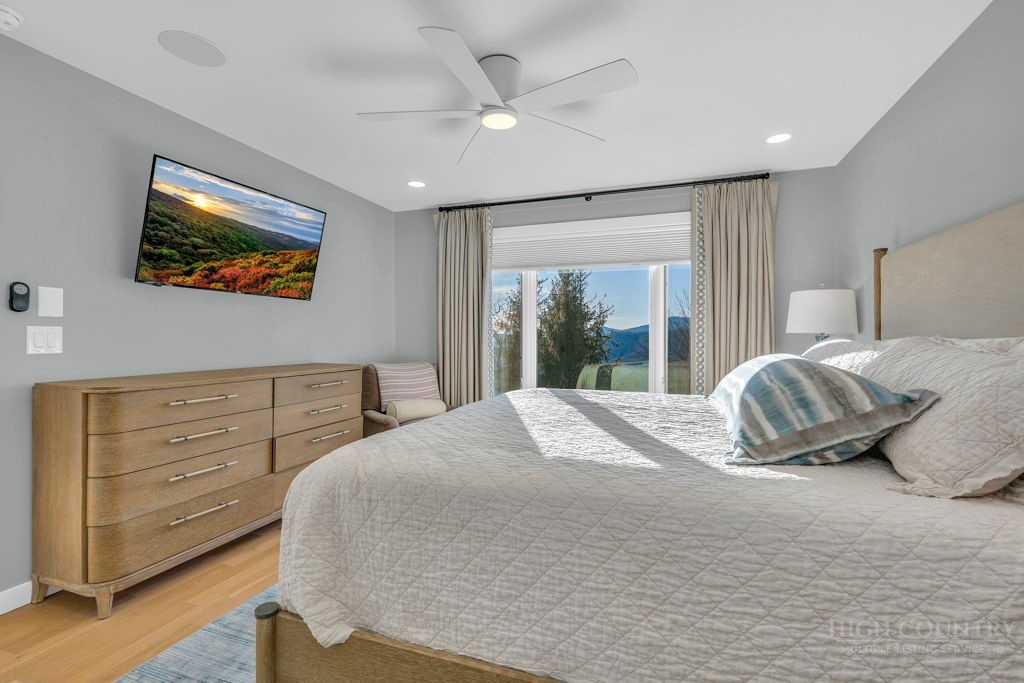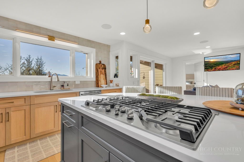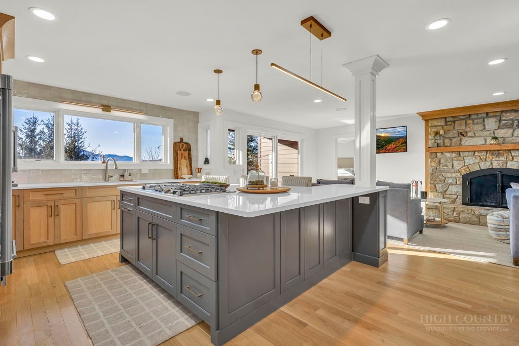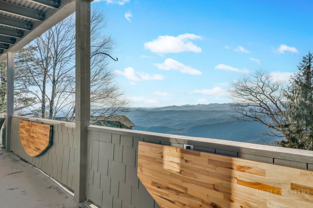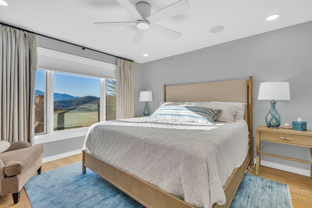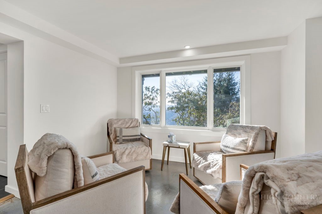 Sophisticated luxury condominium located in the coveted Mayview Park area of Blowing Rock is situated within a private gated community, and offers exceptional long-range, multi-layer mountain views to the south and west. This elegant property provides the full scope and style of mountain grandeur. Ideally positioned within walking distance to restaurants, parks, and the Village of Blowing Rock, this residence combines breathtaking scenery with tremendous convenience. Professionally designed by Architect Jill Spaeh and entirely renovated down to the studs completed in 2024, the home features new HVAC, electrical, plumbing, kitchen, baths, flooring, and more, all reflecting meticulous attention to detail and refined mountain distinction throughout. The thoughtfully designed layout includes 4 bedrooms and 4.5 baths. A welcoming entry foyer opens to expansive open-concept living and dining areas highlighted by white oak hardwood floors, custom white oak paneling, and a wood-burning fireplace. Adjacent entertaining spaces include a wet bar and seamless access to the covered deck with built-in tables and a lounge area—ideal for enjoying sweeping views to include Grandfather Mountain and layered peaks exceeding 5,000 feet in elevation with unforgettable sunsets. The open living areas flow into a gourmet kitchen with custom cabinetry and premium appliances, including GE Café Professional Series stainless steel appliances with double convection ovens, gas range, warming drawer, dishwasher, Thermador refrigerator and freezer, and a large island with bar seating—perfect for everyday living and entertaining. The main level offers three bedrooms, including a luxurious primary suite with spa-like ensuite bath featuring elegant tilework, upscale fixtures, and a walk-in closet. Two additional guest suites each include beautifully appointed baths, along with a convenient main-level half bath. The lower walk-out level features a fourth bedroom and full bath, a family room with flat-screen TV, white oak paneling, custom built-in cabinetry with wine storage, wet bar with beverage refrigerator, sitting area, and direct outdoor access. A well-appointed laundry room with built-ins and utility sink, along with abundant storage, including a spacious seasonal closet, adds exceptional functionality. Mayview Manor Court Community amenities include a swimming pool, and all just minutes from the Village of Blowing Rock, with walkability to dining, shopping, parks, galleries, trails, and much more.