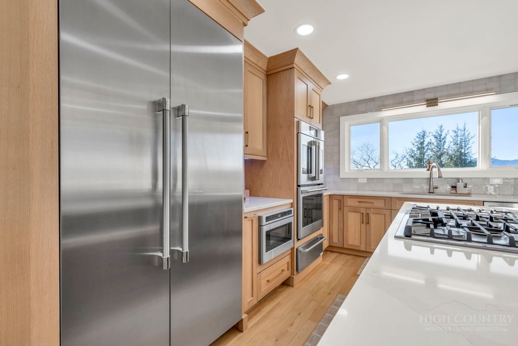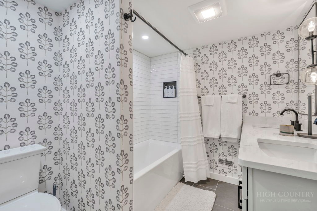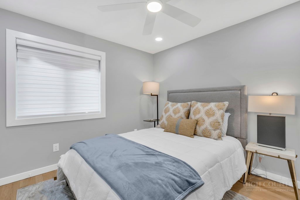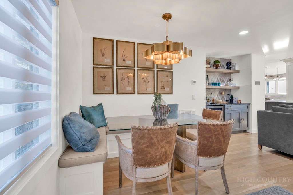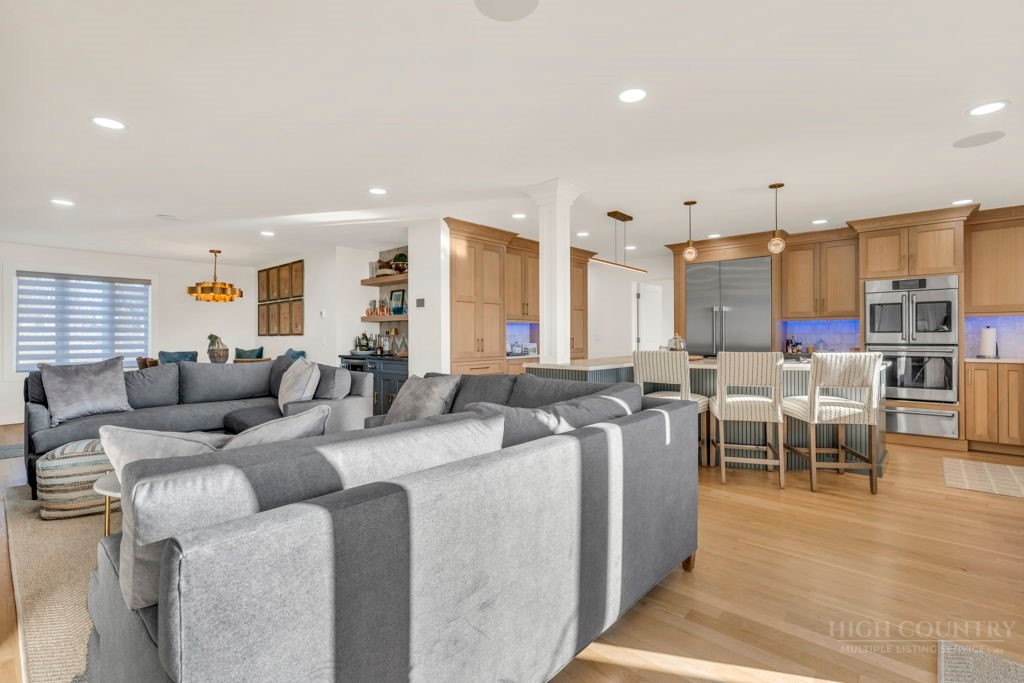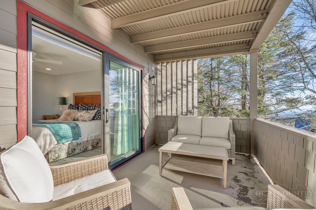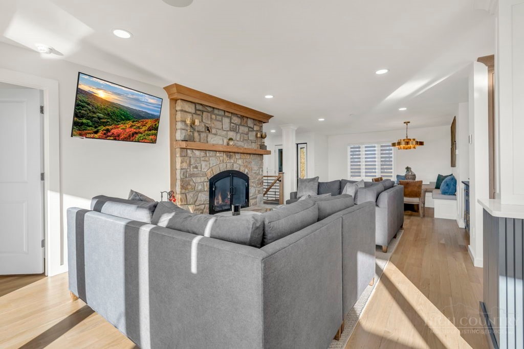 Sophisticated luxury condominium located in the coveted Mayview Park area of Blowing Rock is situated within a private gated community, and offers exceptional long-range, multi-layer mountain views to the south and west. This elegant property provides the full scope and style of mountain grandeur. Ideally positioned within walking distance to restaurants, parks, and the Village of Blowing Rock, this residence combines breathtaking scenery with tremendous convenience. Professionally designed by Architect Jill Spaeh and entirely renovated down to the studs completed in 2024, the home features new HVAC, electrical, plumbing, kitchen, baths, flooring, and more, all reflecting meticulous attention to detail and refined mountain distinction throughout. The thoughtfully designed layout includes 4 bedrooms and 4.5 baths. A welcoming entry foyer opens to expansive open-concept living and dining areas highlighted by white oak hardwood floors, custom white oak paneling, and a wood-burning fireplace. Adjacent entertaining spaces include a wet bar and seamless access to the covered deck with built-in tables and a lounge area—ideal for enjoying sweeping views to include Grandfather Mountain and layered peaks exceeding 5,000 feet in elevation with unforgettable sunsets. The open living areas flow into a gourmet kitchen with custom cabinetry and premium appliances, including GE Café Professional Series stainless steel appliances with double convection ovens, gas range, warming drawer, dishwasher, Thermador refrigerator and freezer, and a large island with bar seating—perfect for everyday living and entertaining. The main level offers three bedrooms, including a luxurious primary suite with spa-like ensuite bath featuring elegant tilework, upscale fixtures, and a walk-in closet. Two additional guest suites each include beautifully appointed baths, along with a convenient main-level half bath. The lower walk-out level features a fourth bedroom and full bath, a family room with flat-screen TV, white oak paneling, custom built-in cabinetry with wine storage, wet bar with beverage refrigerator, sitting area, and direct outdoor access. A well-appointed laundry room with built-ins and utility sink, along with abundant storage, including a spacious seasonal closet, adds exceptional functionality. Mayview Manor Court Community amenities include a swimming pool, and all just minutes from the Village of Blowing Rock, with walkability to dining, shopping, parks, galleries, trails, and much more.