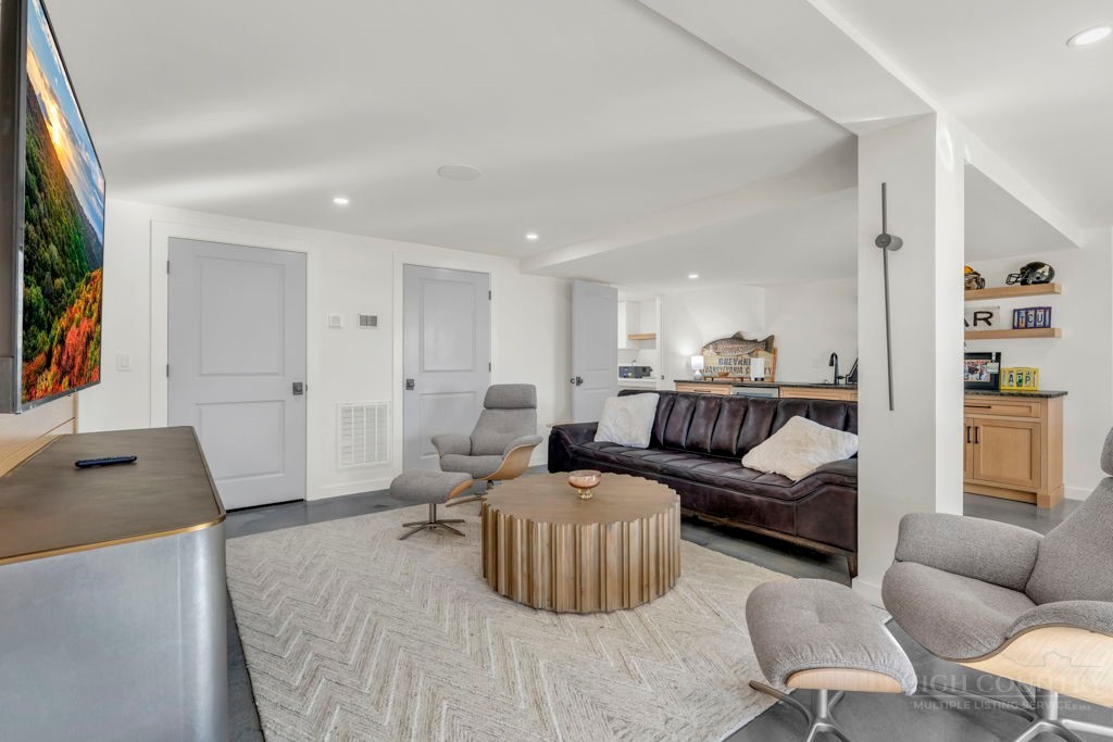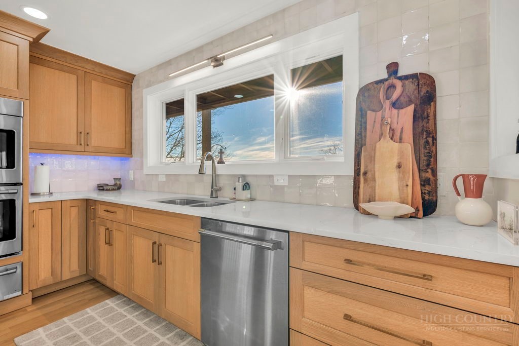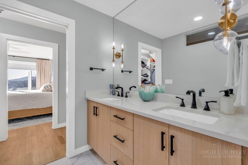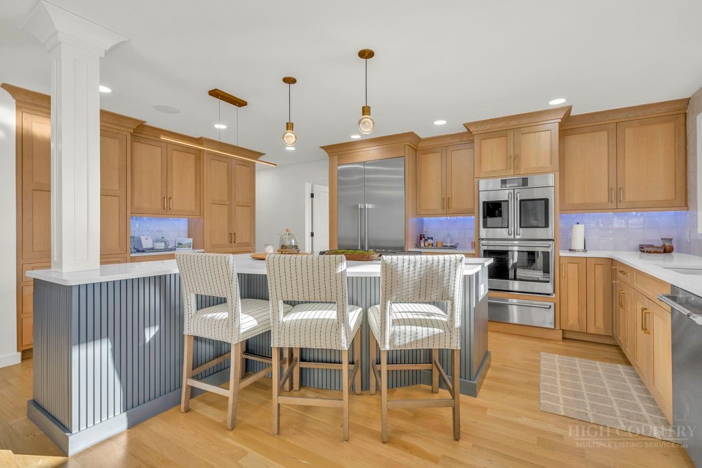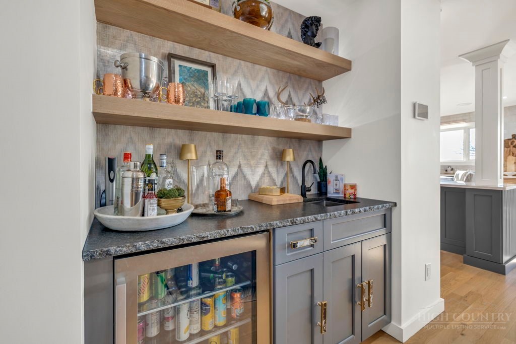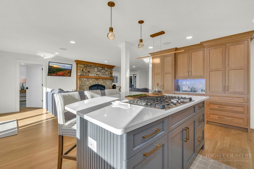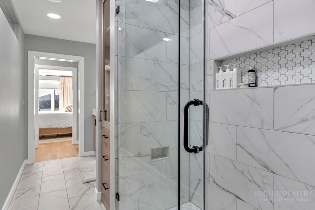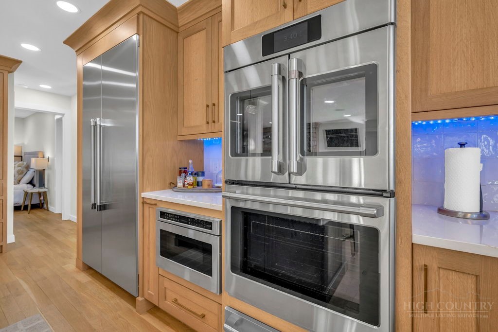 Sophisticated luxury condominium located in the coveted Mayview Park area of Blowing Rock is situated within a private gated community, and offers exceptional long-range, multi-layer mountain views to the south and west. This elegant property provides the full scope and style of mountain grandeur. Ideally positioned within walking distance to restaurants, parks, and the Village of Blowing Rock, this residence combines breathtaking scenery with tremendous convenience. Professionally designed by Architect Jill Spaeh and entirely renovated down to the studs completed in 2024, the home features new HVAC, electrical, plumbing, kitchen, baths, flooring, and more, all reflecting meticulous attention to detail and refined mountain distinction throughout. The thoughtfully designed layout includes 4 bedrooms and 4.5 baths. A welcoming entry foyer opens to expansive open-concept living and dining areas highlighted by white oak hardwood floors, custom white oak paneling, and a wood-burning fireplace. Adjacent entertaining spaces include a wet bar and seamless access to the covered deck with built-in tables and a lounge area—ideal for enjoying sweeping views to include Grandfather Mountain and layered peaks exceeding 5,000 feet in elevation with unforgettable sunsets. The open living areas flow into a gourmet kitchen with custom cabinetry and premium appliances, including GE Café Professional Series stainless steel appliances with double convection ovens, gas range, warming drawer, dishwasher, Thermador refrigerator and freezer, and a large island with bar seating—perfect for everyday living and entertaining. The main level offers three bedrooms, including a luxurious primary suite with spa-like ensuite bath featuring elegant tilework, upscale fixtures, and a walk-in closet. Two additional guest suites each include beautifully appointed baths, along with a convenient main-level half bath. The lower walk-out level features a fourth bedroom and full bath, a family room with flat-screen TV, white oak paneling, custom built-in cabinetry with wine storage, wet bar with beverage refrigerator, sitting area, and direct outdoor access. A well-appointed laundry room with built-ins and utility sink, along with abundant storage, including a spacious seasonal closet, adds exceptional functionality. Mayview Manor Court Community amenities include a swimming pool, and all just minutes from the Village of Blowing Rock, with walkability to dining, shopping, parks, galleries, trails, and much more.