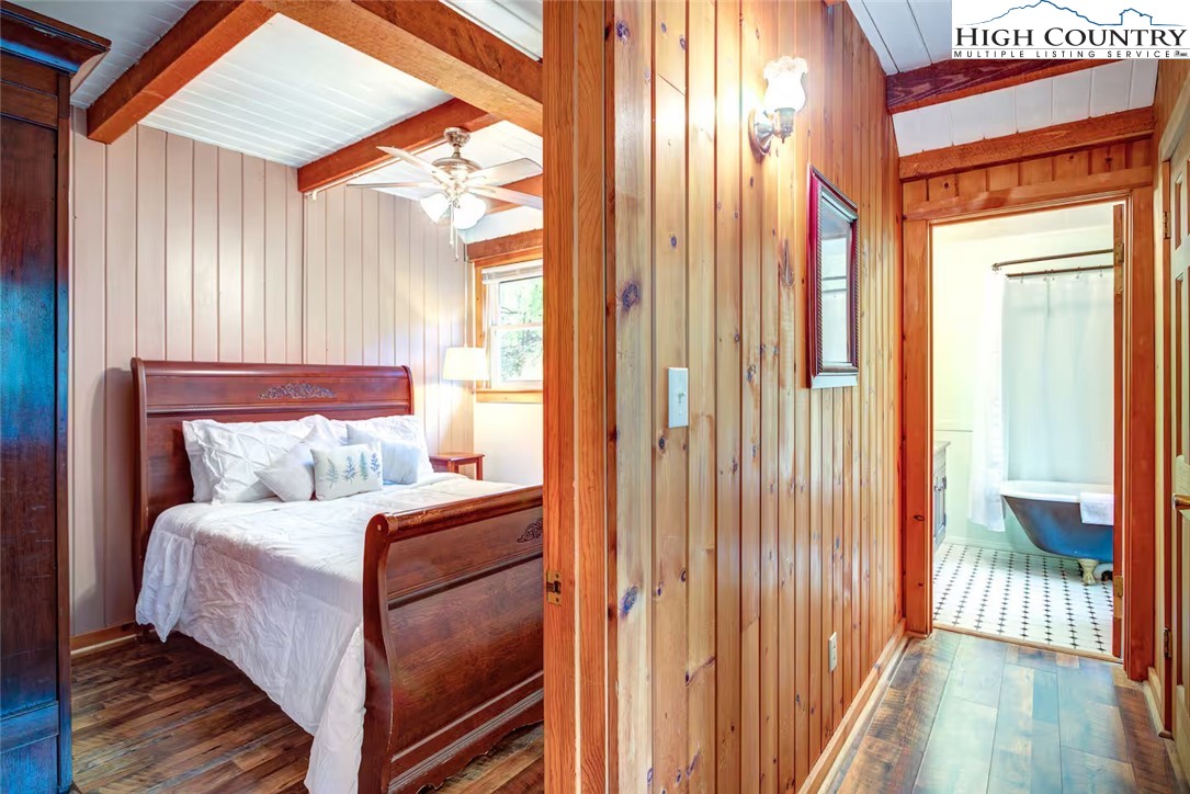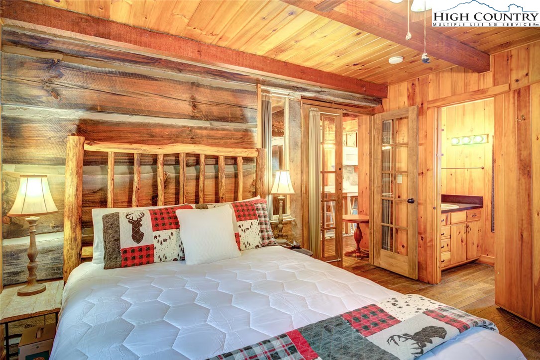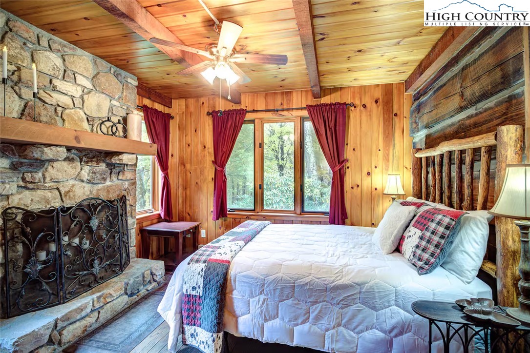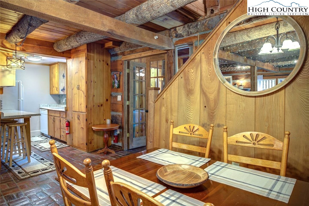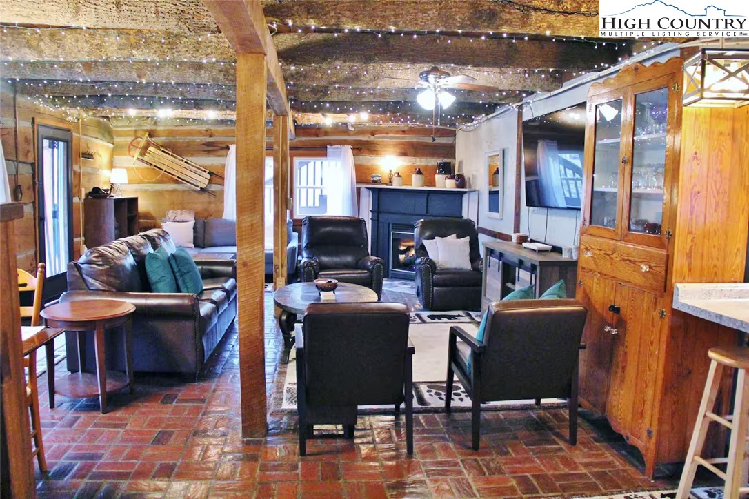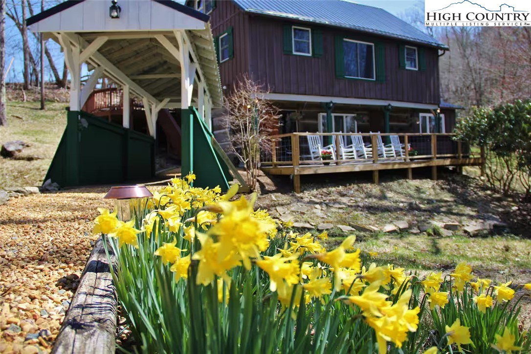 IMPROVED PRICE AND SELLER FINANCING CONSIDERED! An impressive renovation was completed to this remarkable property offering a unique blend of rustic charm and modern updates, featuring 2 cabins connected by a charming covered bridge walkway. Excellent vacation rental opportunity. Main property was once occupied as two separate units. Kitchen, bedroom and bath on both levels with separate entrances. Situated in a prime central location between Banner Elk and Beech Mountain, it provides easy access to activities like skiing, hiking, biking, wineries, dining, summer theater at Lees McRae College and nearby attractions such as Grandfather Mountain and the Blue Ridge Parkway. The main cabin boasts a primary bedroom with a fireplace, and original hardwood floors, full bath, a kitchenette, stunning log beams, and a stone fireplace in the great room, while the upper level includes two bedrooms, a full bath with a footed tub, water closet, a large dining area, kitchen, and an upper loft for an extended sleeping area. Spacious decking complete with hot tub, heated table, a huge flat yard with lots of parking and a fire pit make it ideal for entertaining and relaxing. In addition has a 223 sq ft cabin on the property, remodeled to be a versatile space; think kids playroom or art studio. The upper level loft has portions lower than 7' so the 209 sq ft is not counted in the total square footage. So much to offer with the property including 2 refrigerators, 2 dishwashers, 2 microwaves and a sound system. Both cabins had roofs replaced in 2023. Well pump and tank were just replaced.