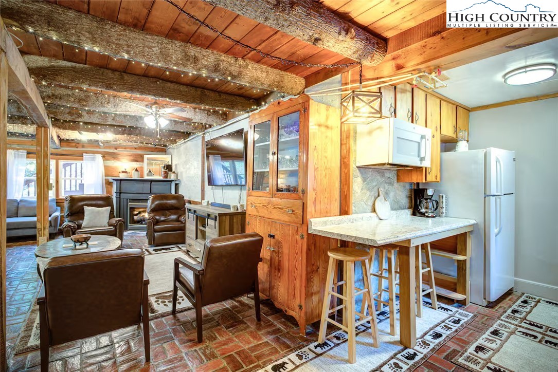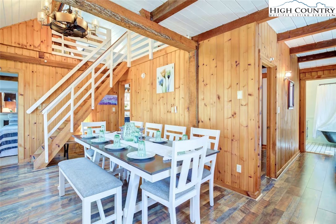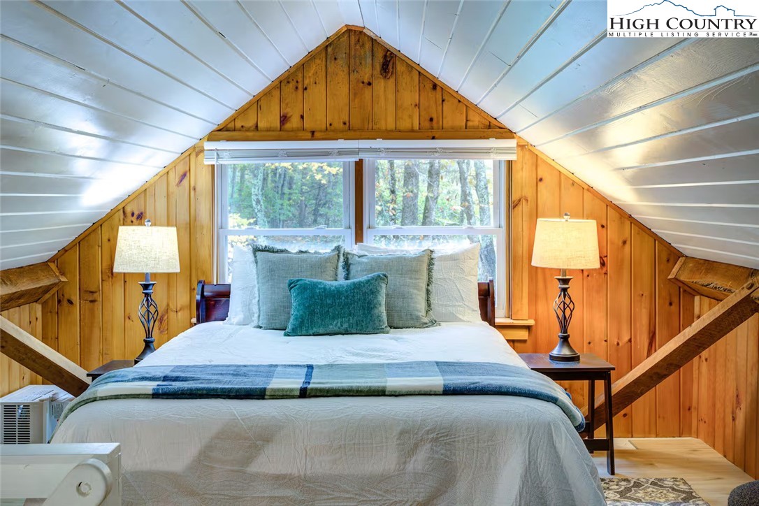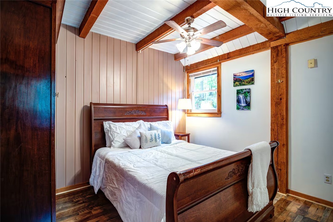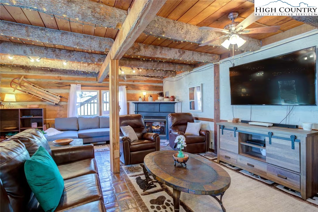 IMPROVED PRICE AND SELLER FINANCING CONSIDERED! An impressive renovation was completed to this remarkable property offering a unique blend of rustic charm and modern updates, featuring 2 cabins connected by a charming covered bridge walkway. Excellent vacation rental opportunity. Main property was once occupied as two separate units. Kitchen, bedroom and bath on both levels with separate entrances. Situated in a prime central location between Banner Elk and Beech Mountain, it provides easy access to activities like skiing, hiking, biking, wineries, dining, summer theater at Lees McRae College and nearby attractions such as Grandfather Mountain and the Blue Ridge Parkway. The main cabin boasts a primary bedroom with a fireplace, and original hardwood floors, full bath, a kitchenette, stunning log beams, and a stone fireplace in the great room, while the upper level includes two bedrooms, a full bath with a footed tub, water closet, a large dining area, kitchen, and an upper loft for an extended sleeping area. Spacious decking complete with hot tub, heated table, a huge flat yard with lots of parking and a fire pit make it ideal for entertaining and relaxing. In addition has a 223 sq ft cabin on the property, remodeled to be a versatile space; think kids playroom or art studio. The upper level loft has portions lower than 7' so the 209 sq ft is not counted in the total square footage. So much to offer with the property including 2 refrigerators, 2 dishwashers, 2 microwaves and a sound system. Both cabins had roofs replaced in 2023. Well pump and tank were just replaced.