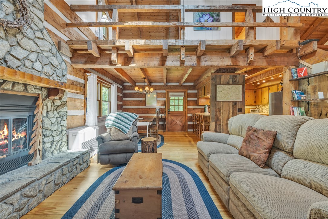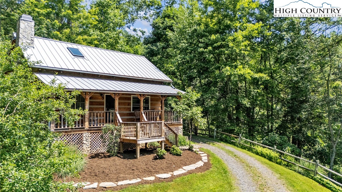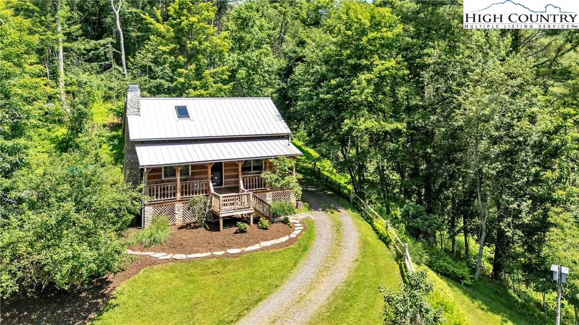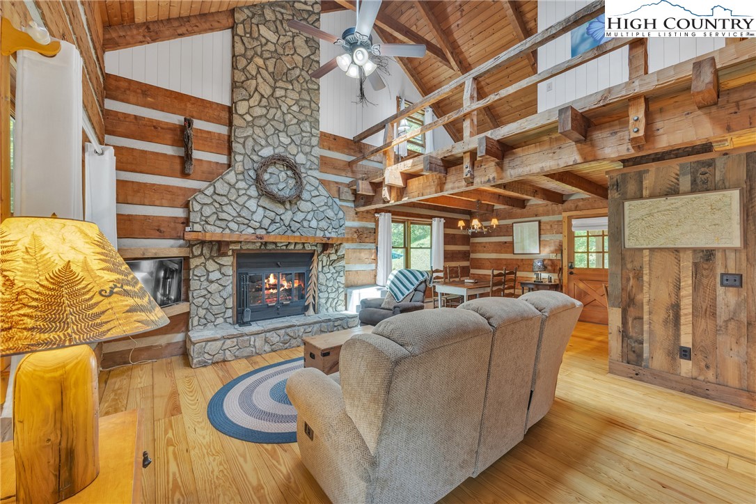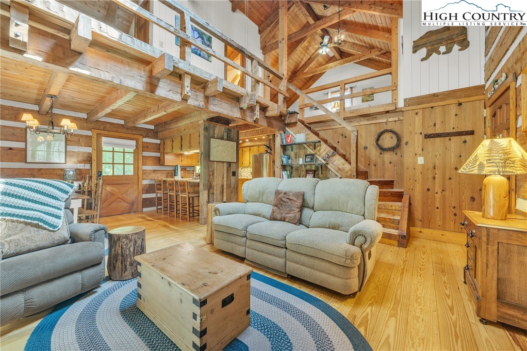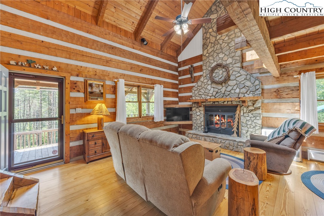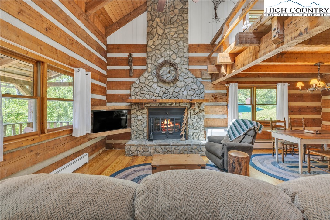 Offered with some furnishings - see items that do not convey list to see exceptions. Escape to this meticulously maintained rustic mountain retreat on just over 3 acres in the heart of Ashe County. This charming 2-bedroom, 2-bath cottage offers a warm, wood-rich interior with shiplap walls, tongue-and-groove pine, beautifully refinished wood floors, robust wooden slab cut stair steps, and a stone floor-to-ceiling fireplace. A recent cosmetic refresh adds charm and comfort, including updated vanities and inviting finishes throughout. The layout includes a main-level bedroom and an open sleeping loft above. An additional loft space is usable for guests as extra living space or sleeping. Covered front and rear porches invite you to relax year-round. With some tree clearing, a serene view of nearby Bass Pond could be restored. Located just minutes from Lansing, West Jefferson, and scenic hiking trails, this home located in the beautifully manicured Barn Gate Farm subdivision works for full-time living or a peaceful second home retreat. Cameras at home do capture sound.