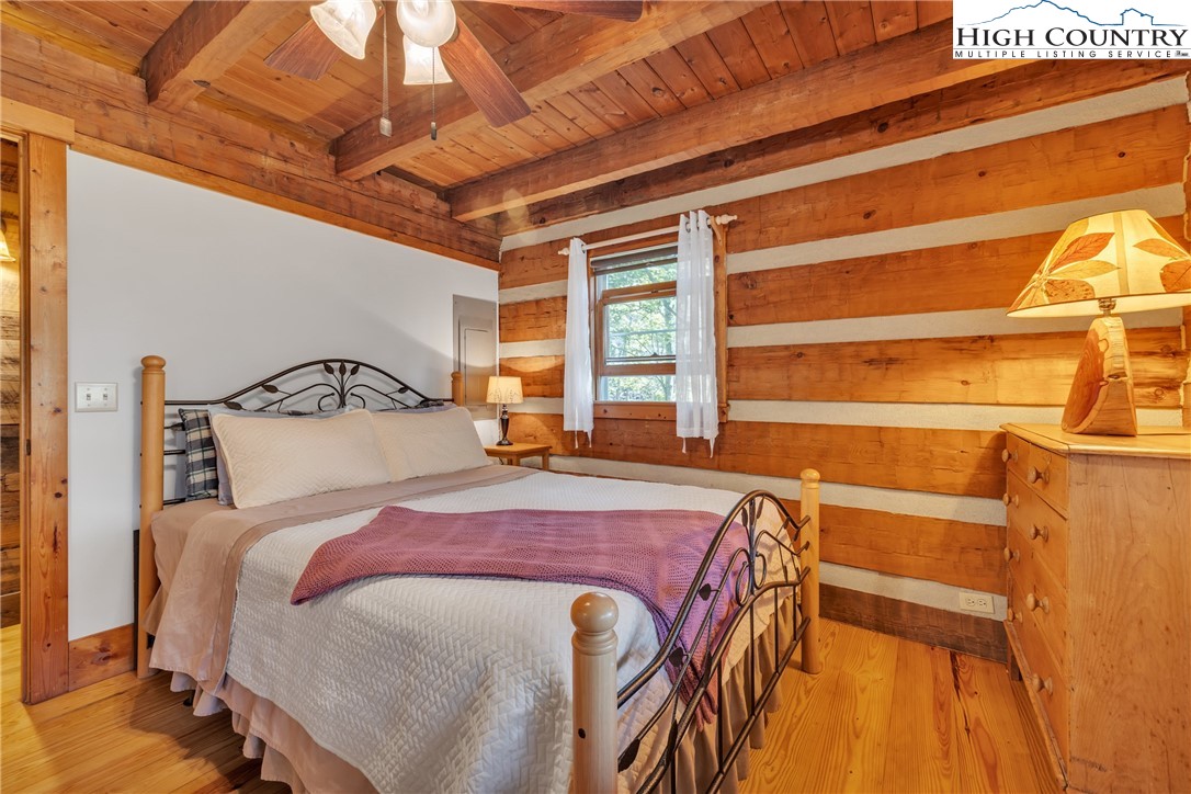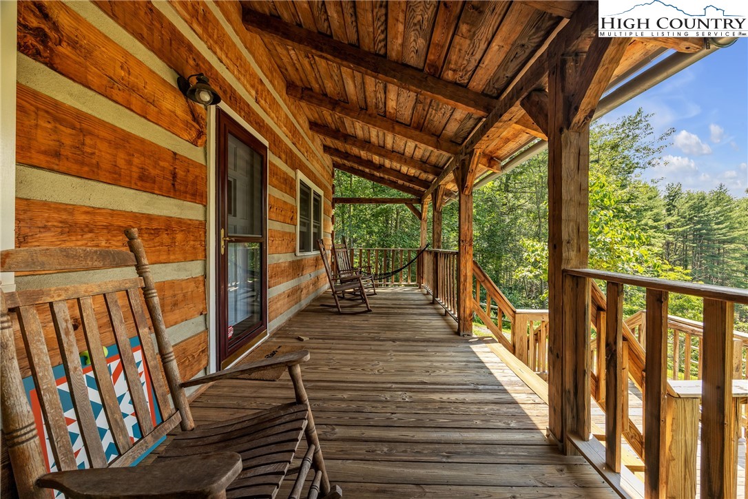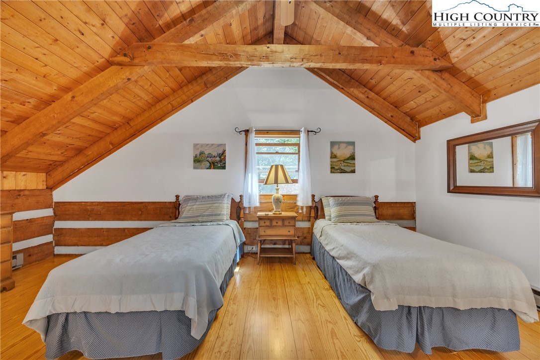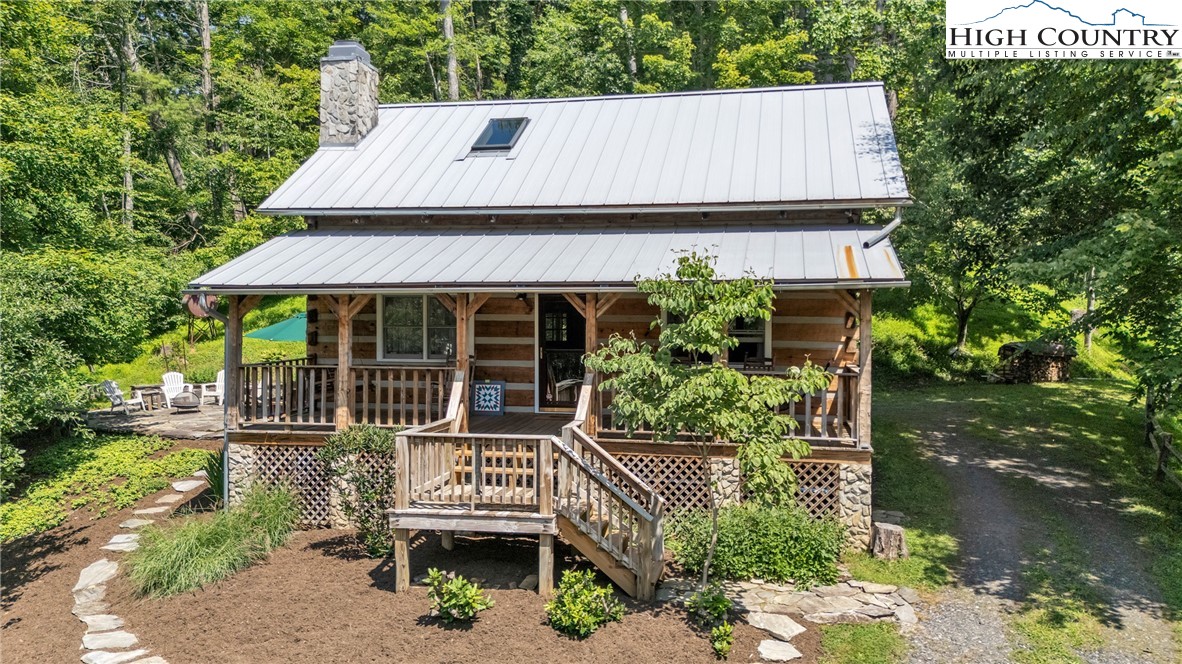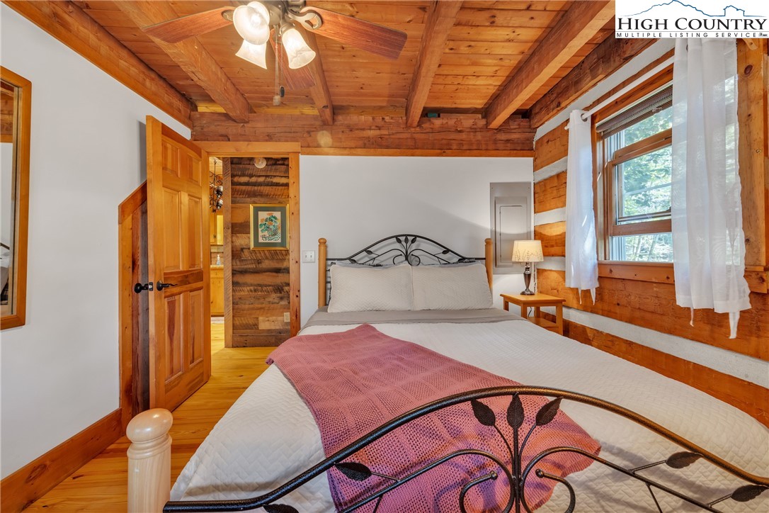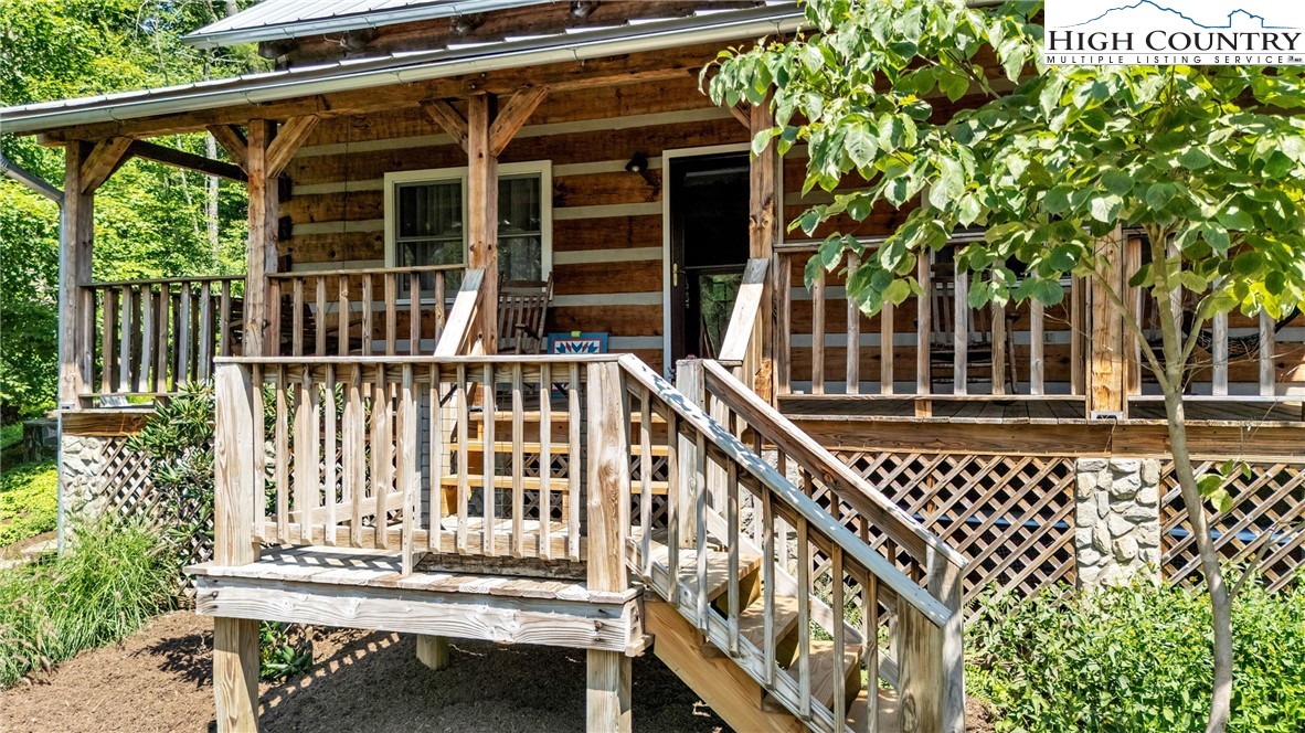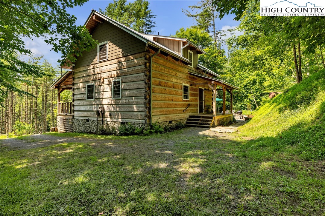 Offered with some furnishings - see items that do not convey list to see exceptions. Escape to this meticulously maintained rustic mountain retreat on just over 3 acres in the heart of Ashe County. This charming 2-bedroom, 2-bath cottage offers a warm, wood-rich interior with shiplap walls, tongue-and-groove pine, beautifully refinished wood floors, robust wooden slab cut stair steps, and a stone floor-to-ceiling fireplace. A recent cosmetic refresh adds charm and comfort, including updated vanities and inviting finishes throughout. The layout includes a main-level bedroom and an open sleeping loft above. An additional loft space is usable for guests as extra living space or sleeping. Covered front and rear porches invite you to relax year-round. With some tree clearing, a serene view of nearby Bass Pond could be restored. Located just minutes from Lansing, West Jefferson, and scenic hiking trails, this home located in the beautifully manicured Barn Gate Farm subdivision works for full-time living or a peaceful second home retreat. Cameras at home do capture sound.