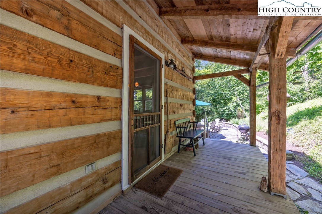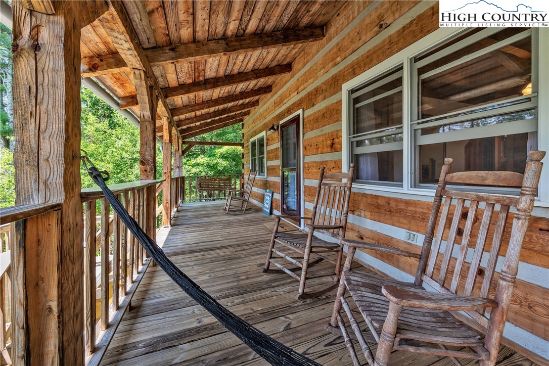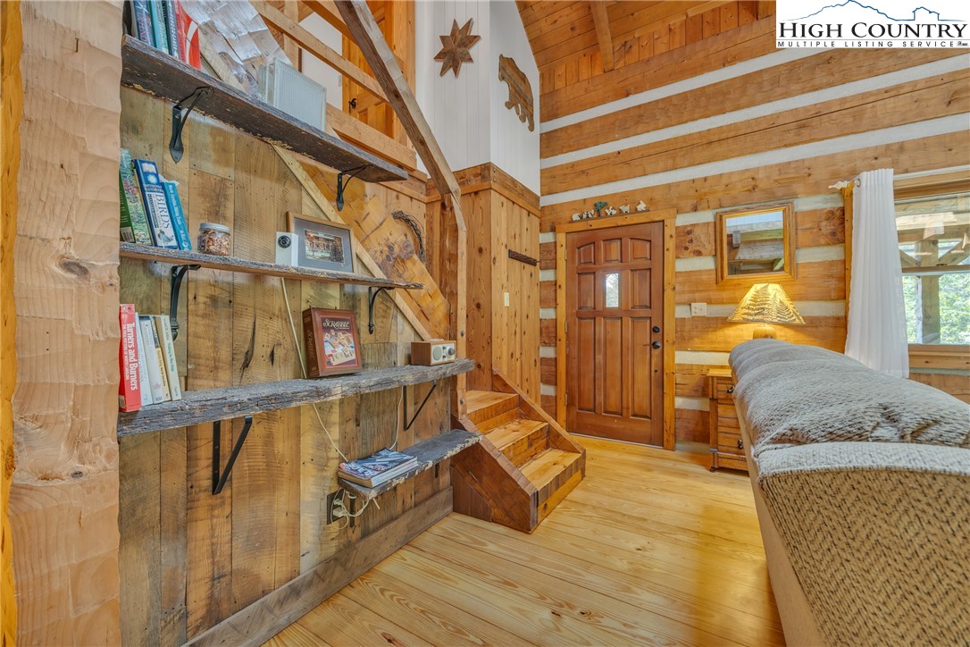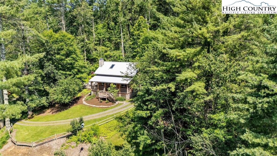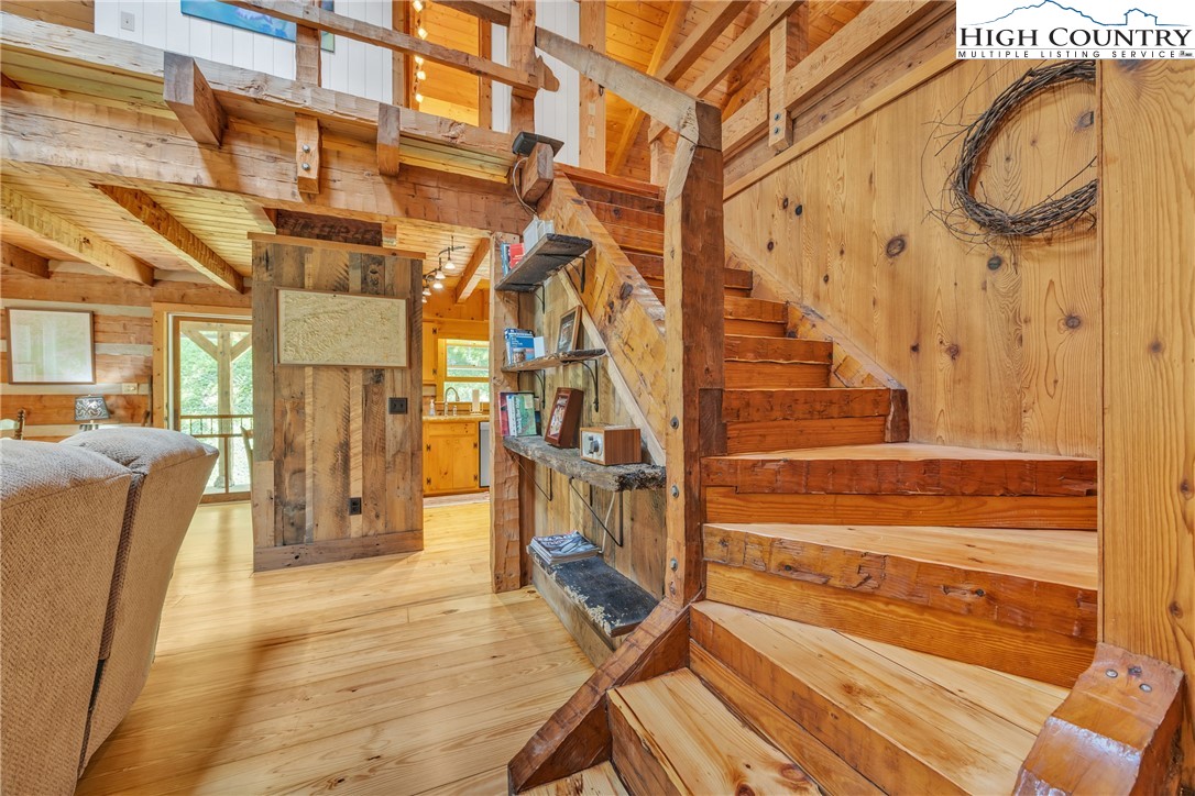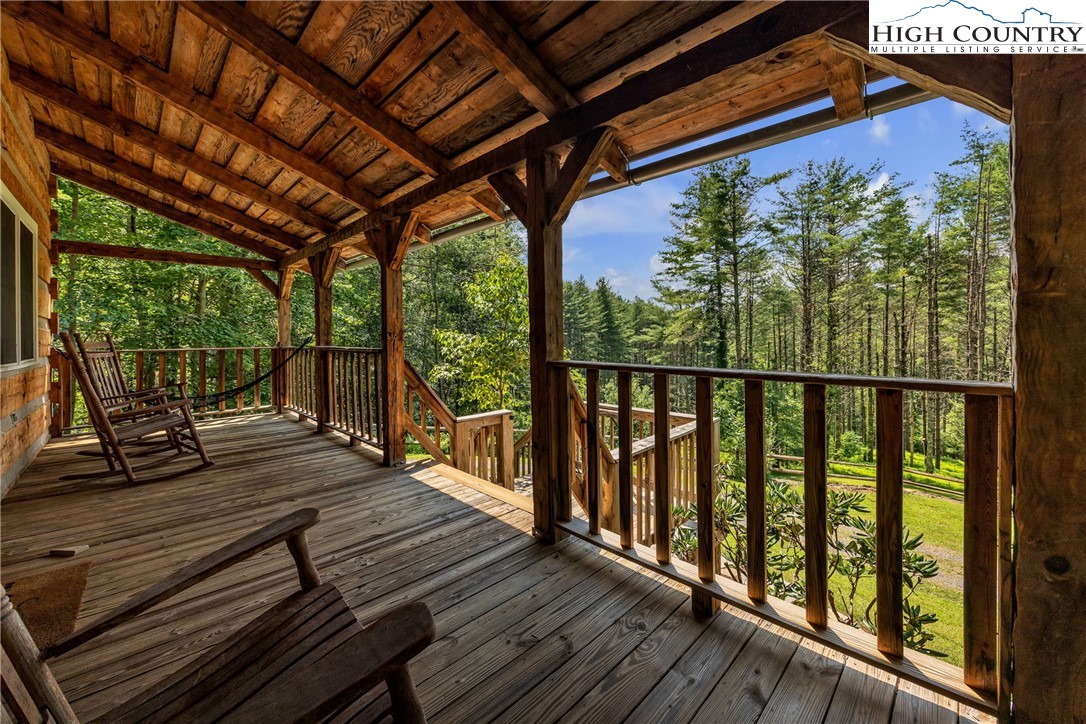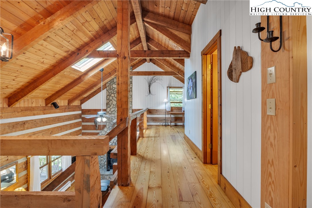 Offered with some furnishings - see items that do not convey list to see exceptions. Escape to this meticulously maintained rustic mountain retreat on just over 3 acres in the heart of Ashe County. This charming 2-bedroom, 2-bath cottage offers a warm, wood-rich interior with shiplap walls, tongue-and-groove pine, beautifully refinished wood floors, robust wooden slab cut stair steps, and a stone floor-to-ceiling fireplace. A recent cosmetic refresh adds charm and comfort, including updated vanities and inviting finishes throughout. The layout includes a main-level bedroom and an open sleeping loft above. An additional loft space is usable for guests as extra living space or sleeping. Covered front and rear porches invite you to relax year-round. With some tree clearing, a serene view of nearby Bass Pond could be restored. Located just minutes from Lansing, West Jefferson, and scenic hiking trails, this home located in the beautifully manicured Barn Gate Farm subdivision works for full-time living or a peaceful second home retreat. Cameras at home do capture sound.
