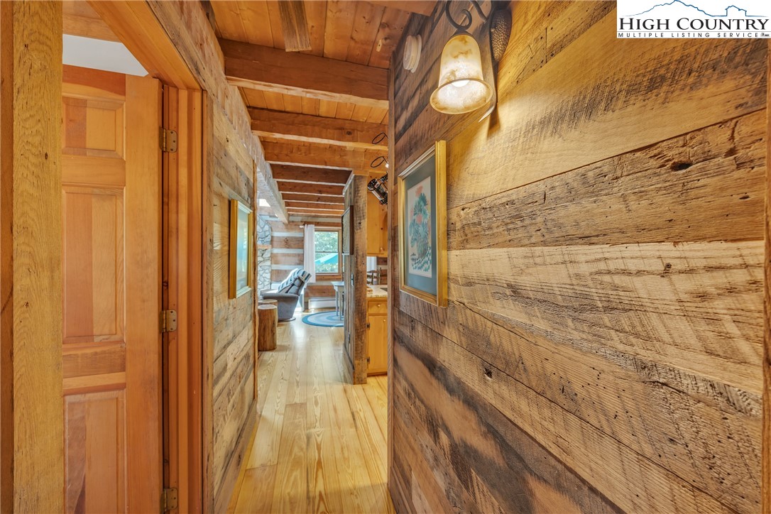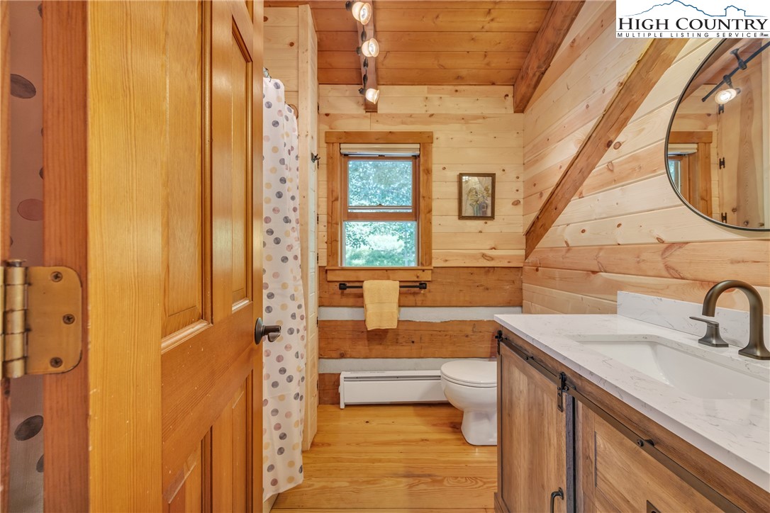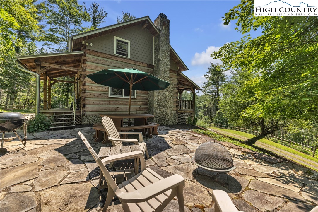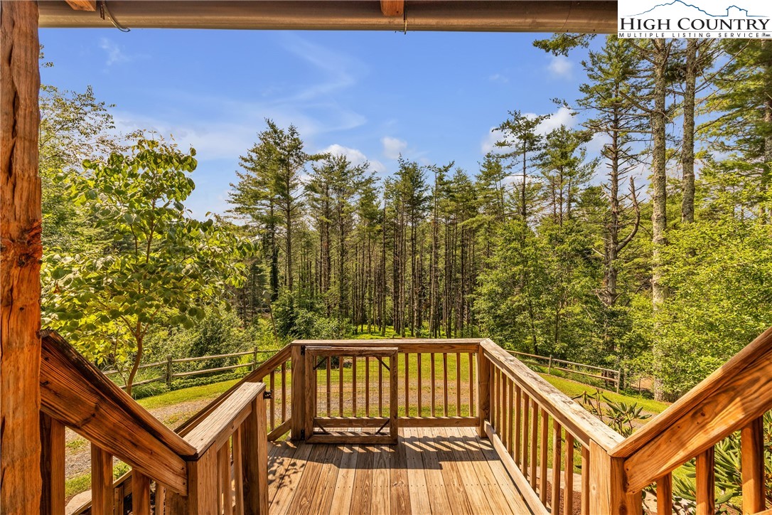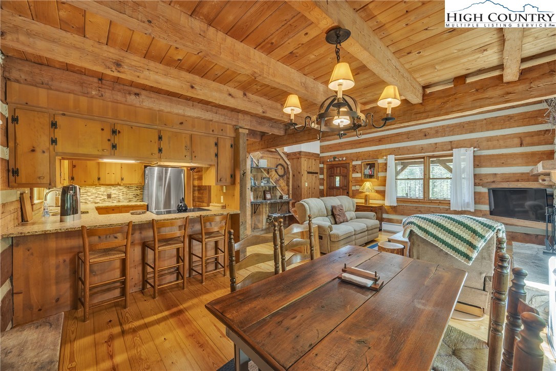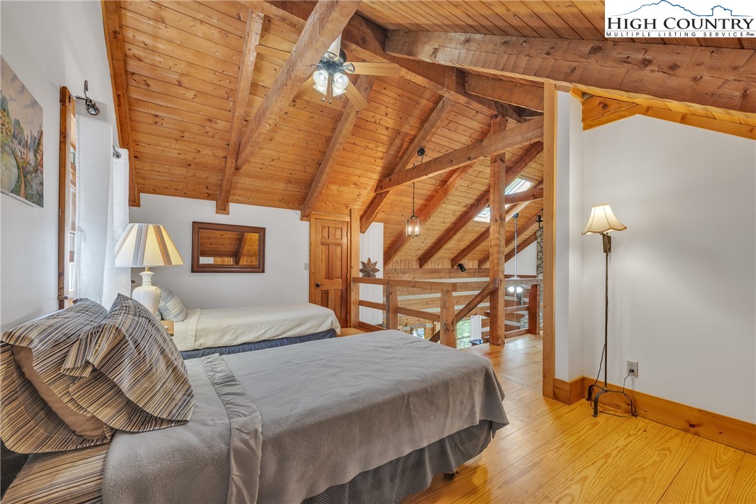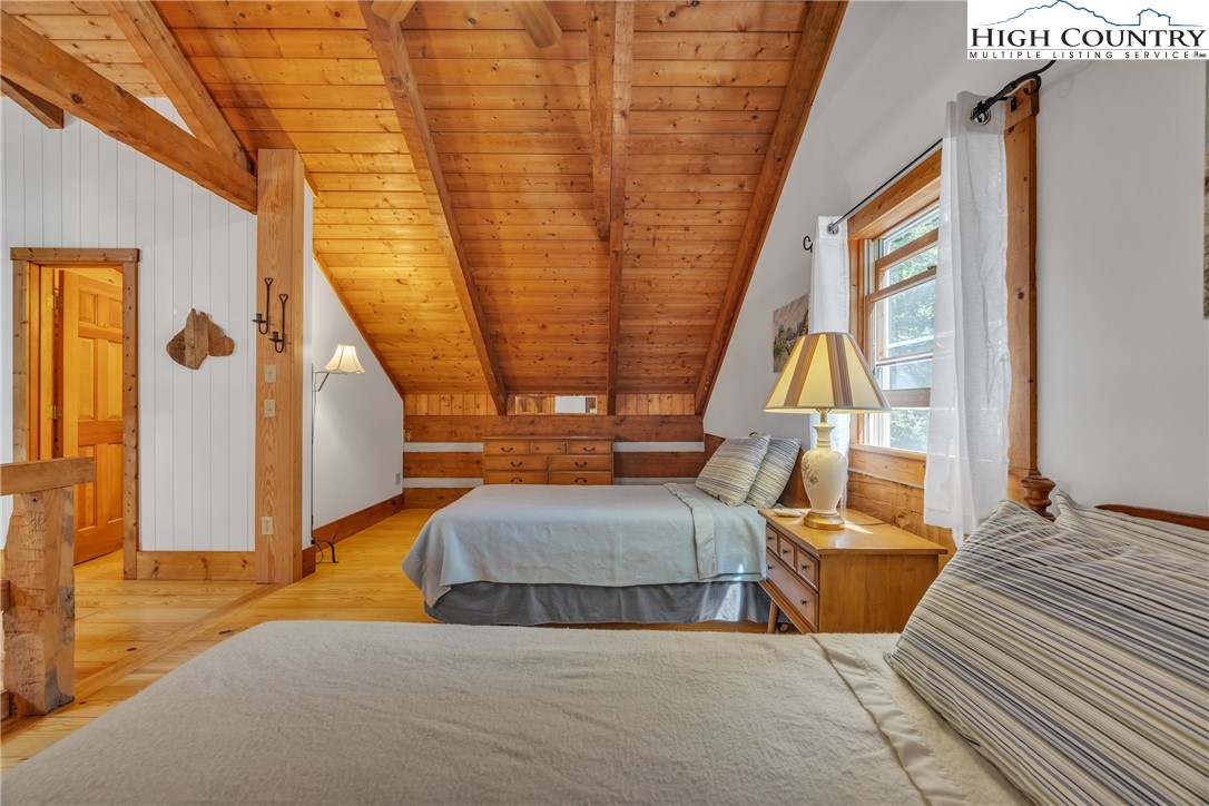Offered with some furnishings - see items that do not convey list to see exceptions. Escape to this meticulously maintained rustic mountain retreat on just over 3 acres in the heart of Ashe County. This charming 2-bedroom, 2-bath cottage offers a warm, wood-rich interior with shiplap walls, tongue-and-groove pine, beautifully refinished wood floors, robust wooden slab cut stair steps, and a stone floor-to-ceiling fireplace. A recent cosmetic refresh adds charm and comfort, including updated vanities and inviting finishes throughout. The layout includes a main-level bedroom and an open sleeping loft above. An additional loft space is usable for guests as extra living space or sleeping. Covered front and rear porches invite you to relax year-round. With some tree clearing, a serene view of nearby Bass Pond could be restored. Located just minutes from Lansing, West Jefferson, and scenic hiking trails, this home located in the beautifully manicured Barn Gate Farm subdivision works for full-time living or a peaceful second home retreat. Cameras at home do capture sound.