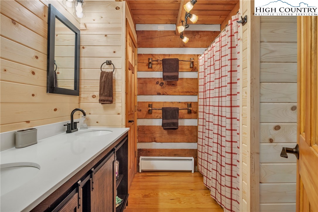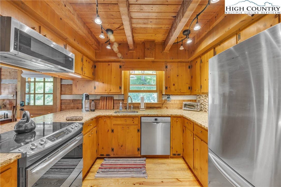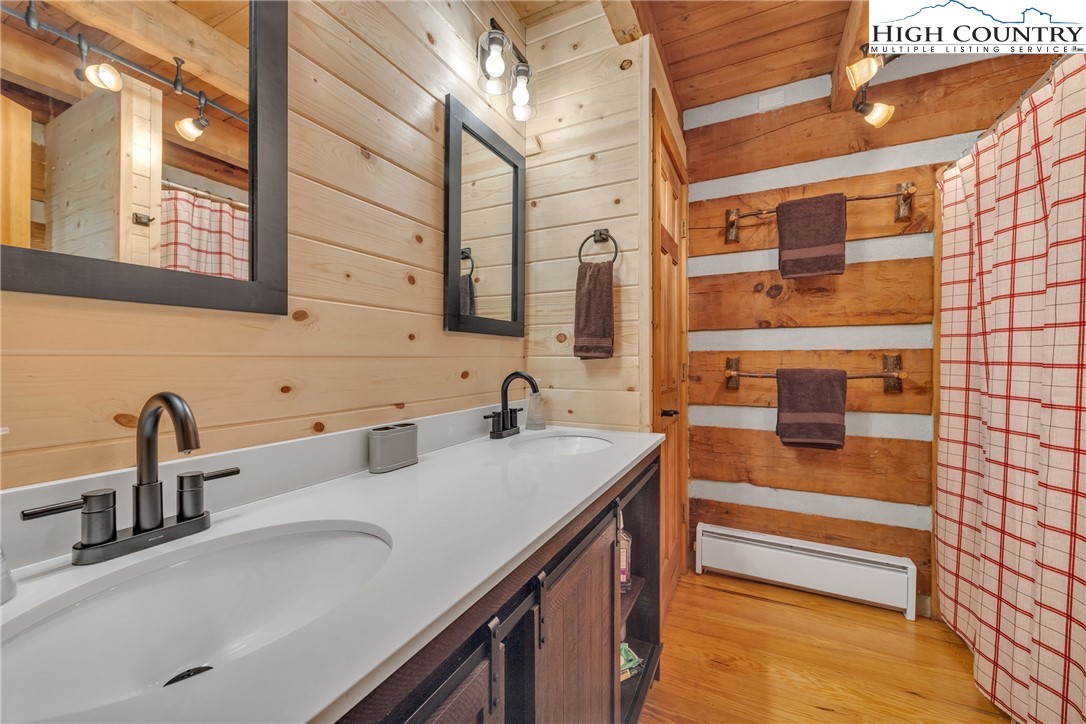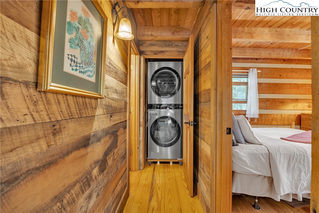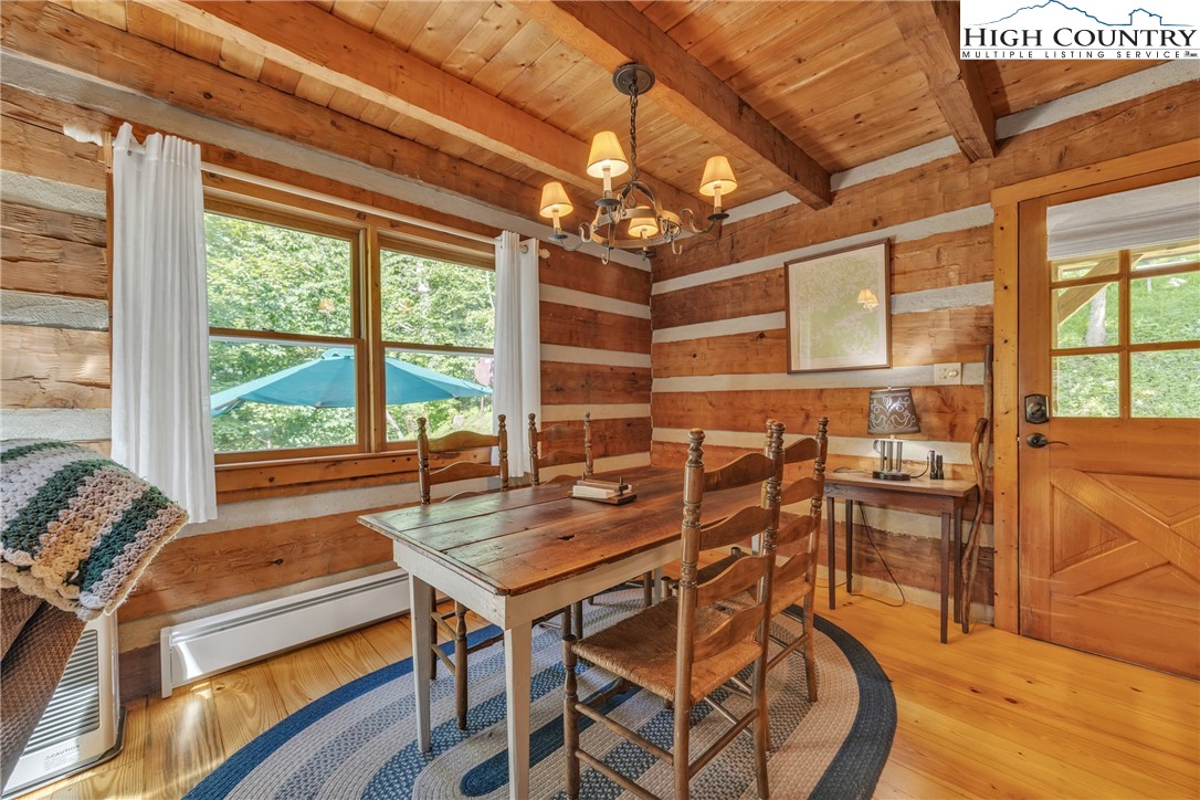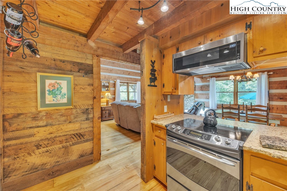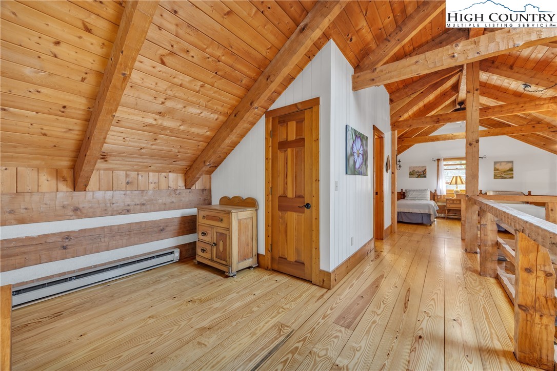 Offered with some furnishings - see items that do not convey list to see exceptions. Escape to this meticulously maintained rustic mountain retreat on just over 3 acres in the heart of Ashe County. This charming 2-bedroom, 2-bath cottage offers a warm, wood-rich interior with shiplap walls, tongue-and-groove pine, beautifully refinished wood floors, robust wooden slab cut stair steps, and a stone floor-to-ceiling fireplace. A recent cosmetic refresh adds charm and comfort, including updated vanities and inviting finishes throughout. The layout includes a main-level bedroom and an open sleeping loft above. An additional loft space is usable for guests as extra living space or sleeping. Covered front and rear porches invite you to relax year-round. With some tree clearing, a serene view of nearby Bass Pond could be restored. Located just minutes from Lansing, West Jefferson, and scenic hiking trails, this home located in the beautifully manicured Barn Gate Farm subdivision works for full-time living or a peaceful second home retreat. Cameras at home do capture sound.
