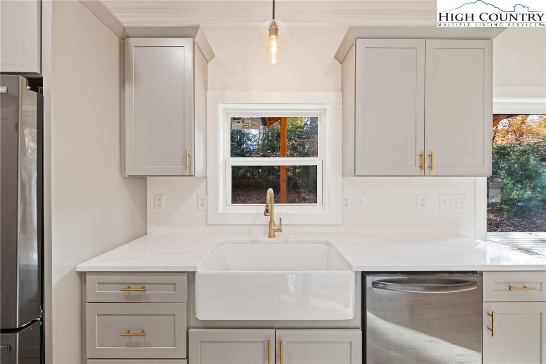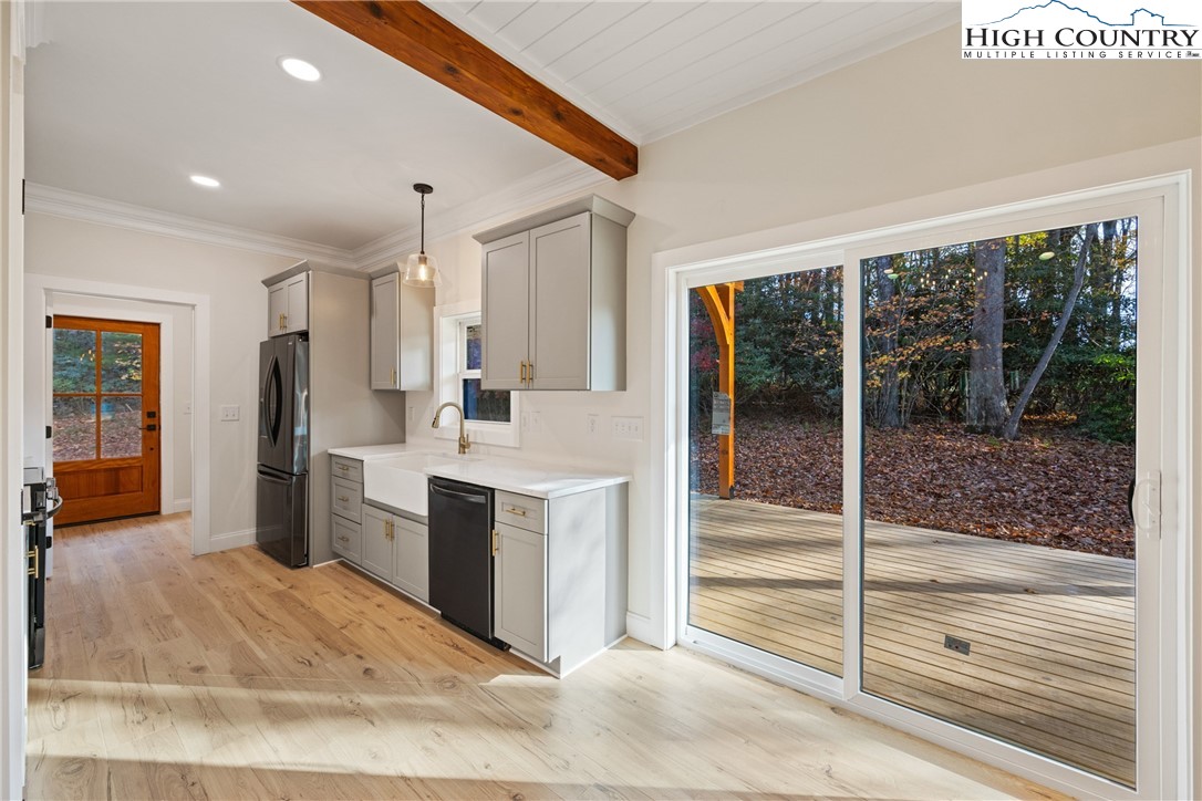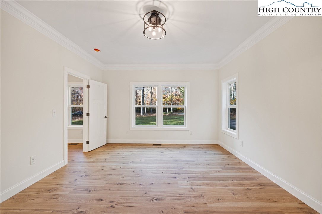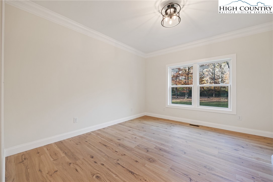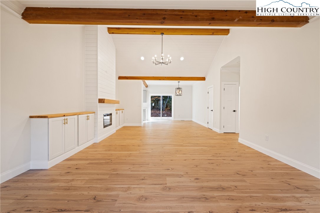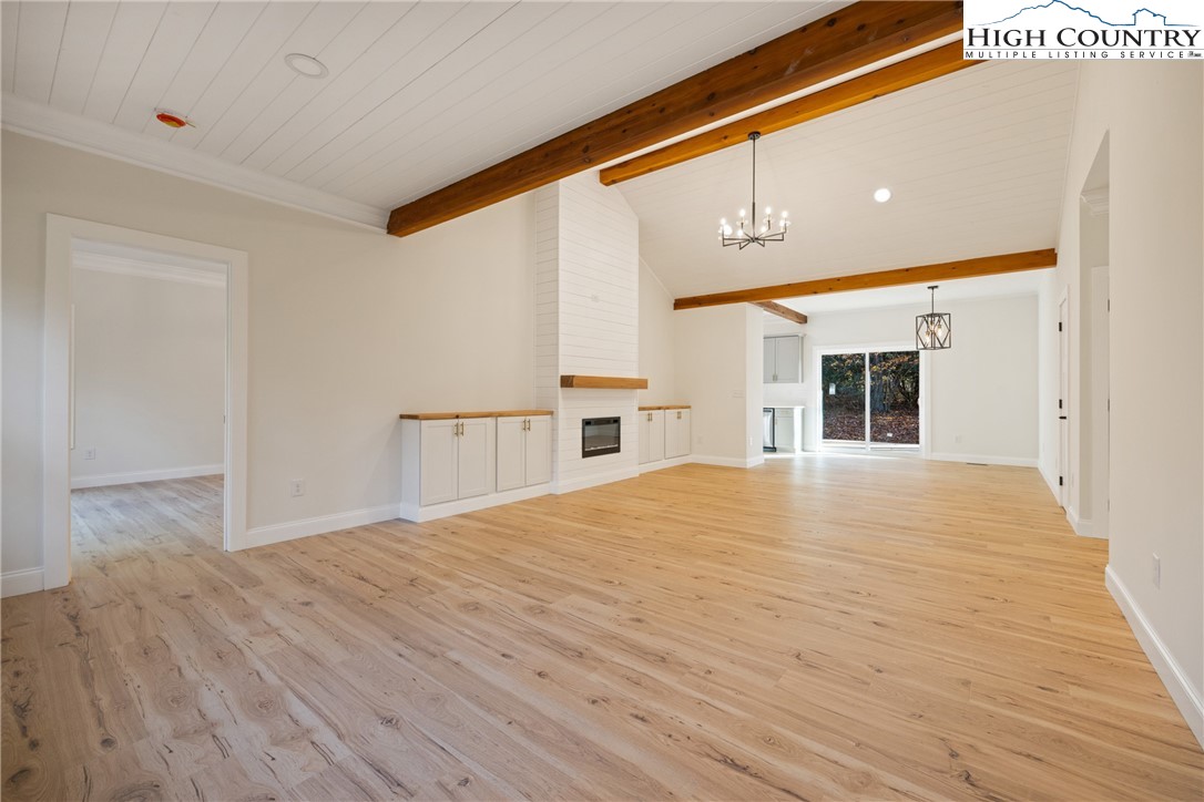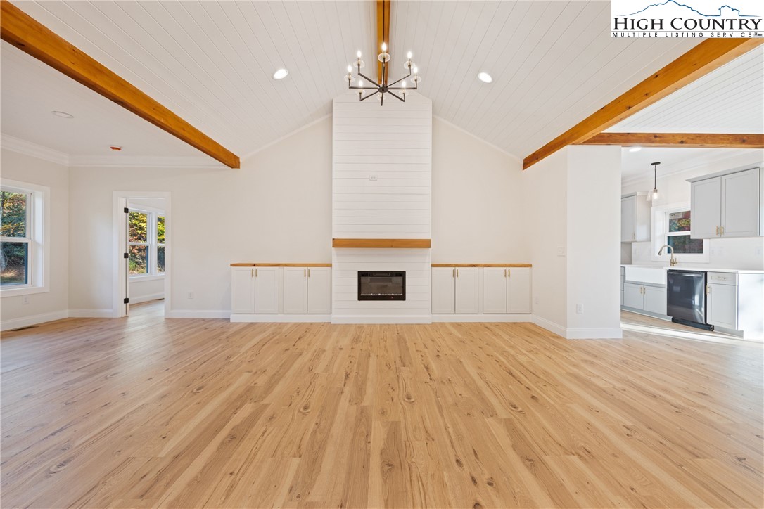 Discover this brand-new custom home, perfectly situated in a beautiful setting, with easy access to both Boone and West Jefferson. Nestled on a large, open one-acre lot, the property features a peaceful mix of open space with trees along the front and a natural buffer of trees along the side and back, offering both beauty and privacy. Inside, the home showcases a spacious open-concept floor plan that seamlessly connects the living, kitchen, and dining areas. The great room features a vaulted shiplap ceiling, wooden beams, and a fireplace with custom built-ins on each side, creating a warm and inviting focal point. The kitchen is a showstopper with quartz countertops, soft-close cabinetry, a farmhouse sink, pot filler, pantry, and stainless steel appliances. A mudroom is conveniently located off the kitchen and includes a built-in storage bench and ample storage space with a separate entrance. Throughout the home, you will find high-end light oak LVP flooring, complemented by custom tile in the bathrooms. The private master wing features a spacious bedroom with crown molding, a walk-in closet, and a luxurious bath, with a granite double vanity and large tiled shower. Two additional bedrooms on the opposite side of the home offer the same quality finishes, along with a beautiful full bath featuring a granite vanity and tub/shower combo. Outdoor living is just as impressive, with a vaulted covered front deck overlooking the manicured front yard and a large open and covered back deck ideal for entertaining or relaxing. With a private well and septic and no HOA fees, this home offers the perfect combination of luxury, comfort, and convenience in a small, quiet community. Ashe County Building Inspections to arrive this week to give CO.