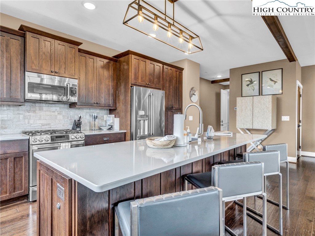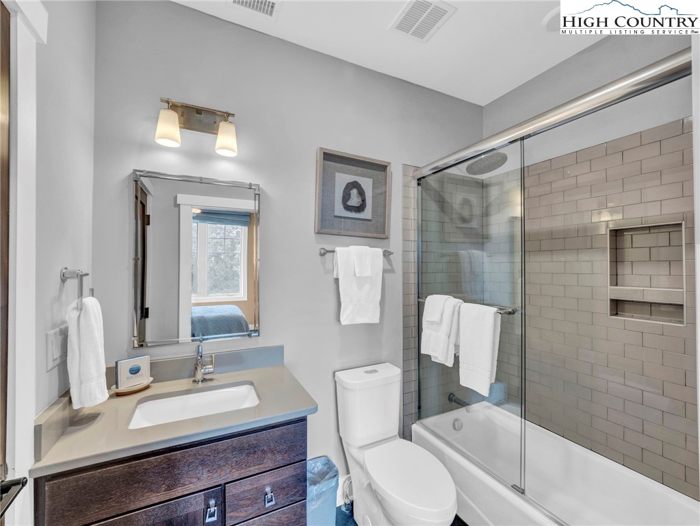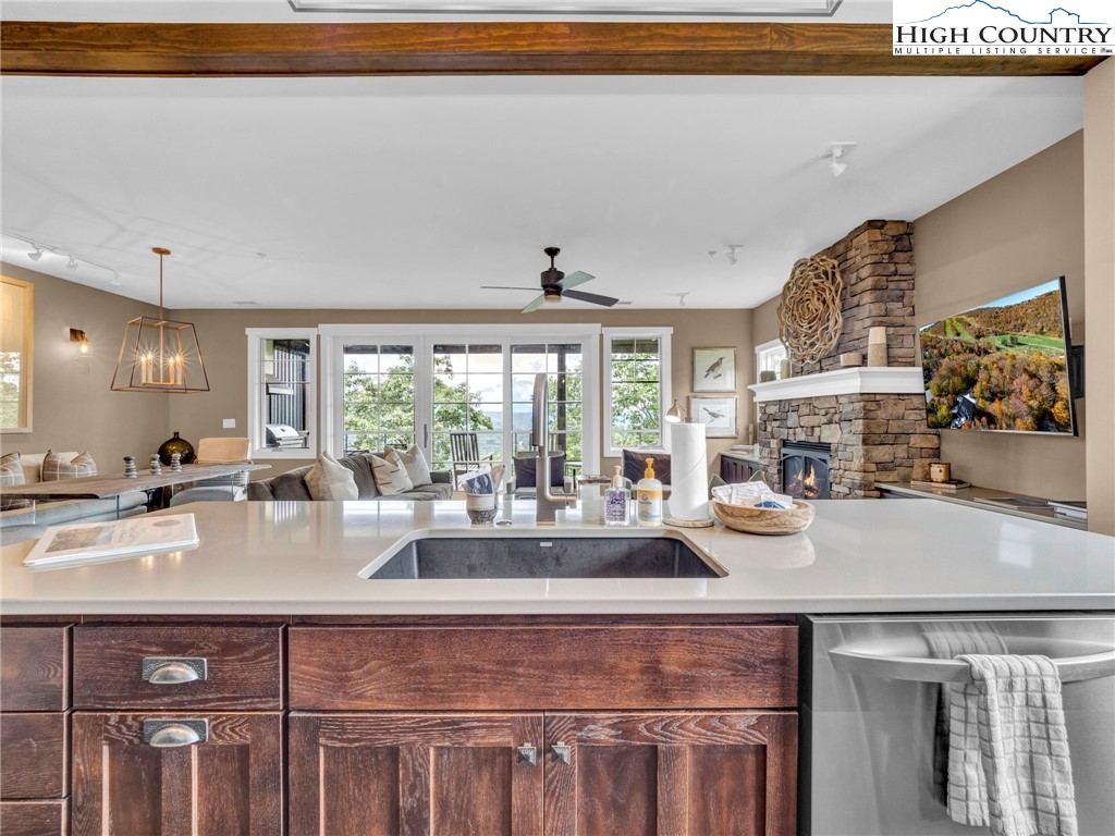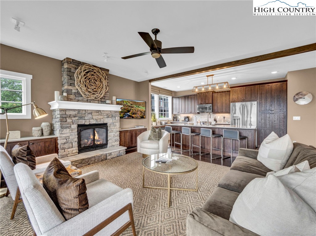 Welcome to Craig 203 — Mountain Living at It's finest! This short term rental approved condo is located at 198 Ramblestone Terrace in the heart of Watson Gap Village. Craig 203 offers a rare combination of breathtaking mountain views, smart design, and effortless access to the premier amenities and outdoor adventures of Blue Ridge Mountain Club. This thoughtfully designed floor plan showcases an open-concept kitchen, dining, and great room anchored by a stunning stone fireplace — the perfect setting for gathering with family and friends. Step onto the expansive back porch, complete with a built-in grilling kitchen, and enjoy seamless indoor/outdoor living and stunning mountain views all year long. Expertly furnished and move-in ready, this home includes modern conveniences like a lobby elevator, a stylish communal lounge, and covered parking — all designed for a low-maintenance, lock-and-leave lifestyle. This condo is offered fully furnished with a short list of exclusions. Craig 203 invites you to relax and soak in the beauty of the Blue Ridge Mountains! This condo is the perfect place to for those building in the community, to call home during the build process or those interested in receiving rental income while home is not in use.