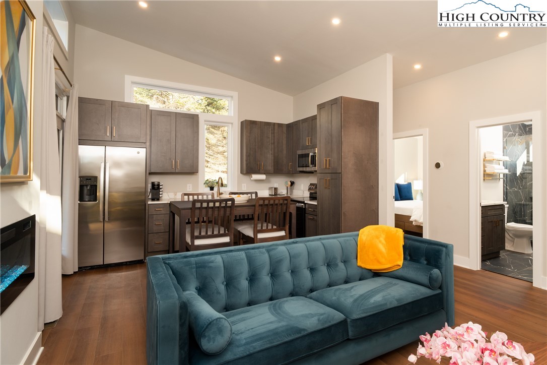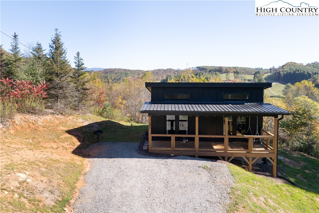 This modern mountain home delivers on maximizing light and views with large windows and vaulted ceilings throughout. Completed in 2025, the modern decor creates a sense of calm and allows you to focus on relaxation. Enjoy the views from both inside the home and outside on the 300 sq ft deck overlooking rolling mountains and long range peaks in the distance. The front porch is a great spot for sunsets and the adjacent fire pit area with Adirondack chairs is a great place for connecting with friends and family while roasting marshmallows and star gazing. The home features an open concept living room with dining and gourmet kitchen all with vaulted ceilings. The kitchen has expansive cabinet space, GE stainless appliances, and quartz countertops. The two equal sized bedrooms feature nice size closets and sliding doors to access the deck. The bathroom is sleek and modern with quartz countertops and porcelain tile floors and shower. The home is fully furnished and comes complete with a fully stocked kitchen and bed and bath linens. Short term rentals are allowed and the home is currently on AirBNB. The New River is within walking distance and is well known for its multiple recreation opportunities including kayaking, tubing, fishing, and more.