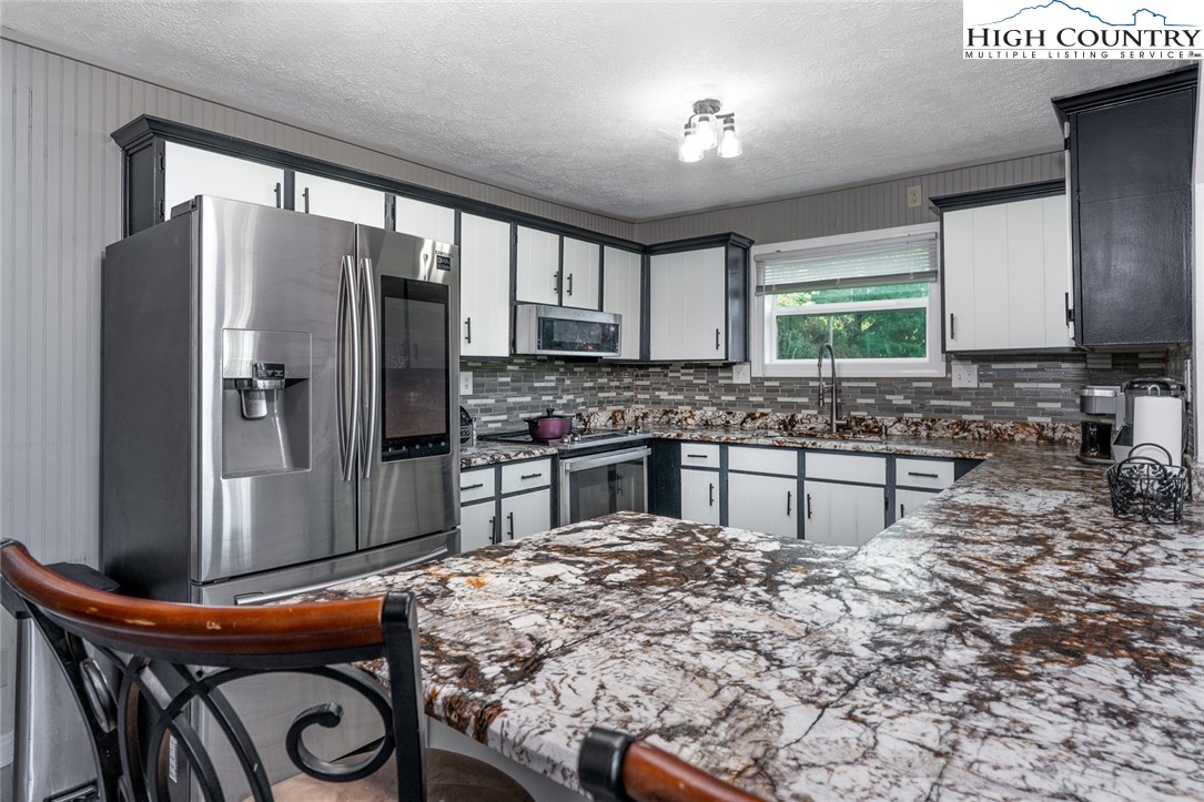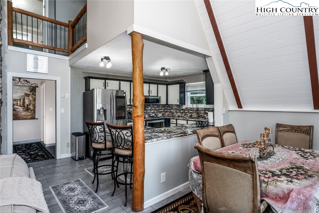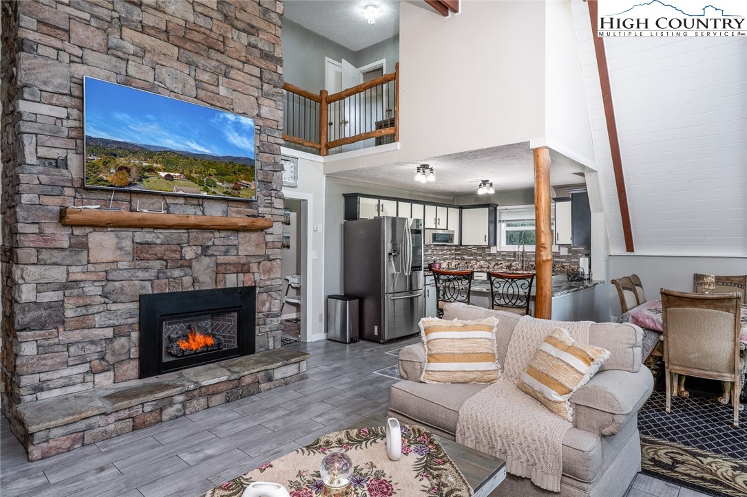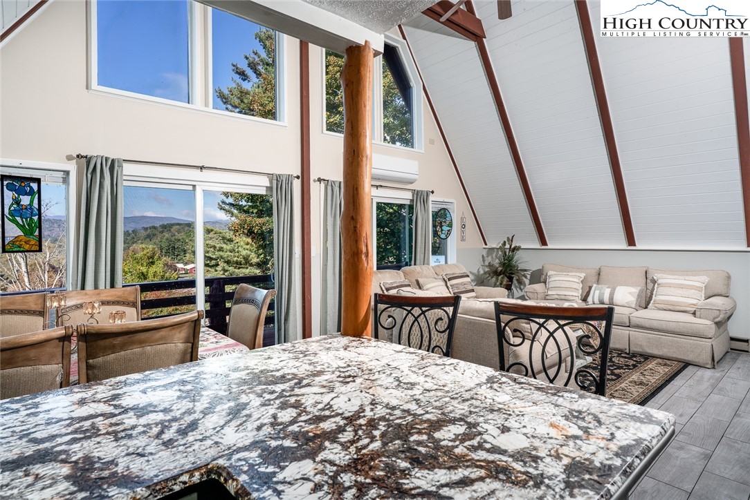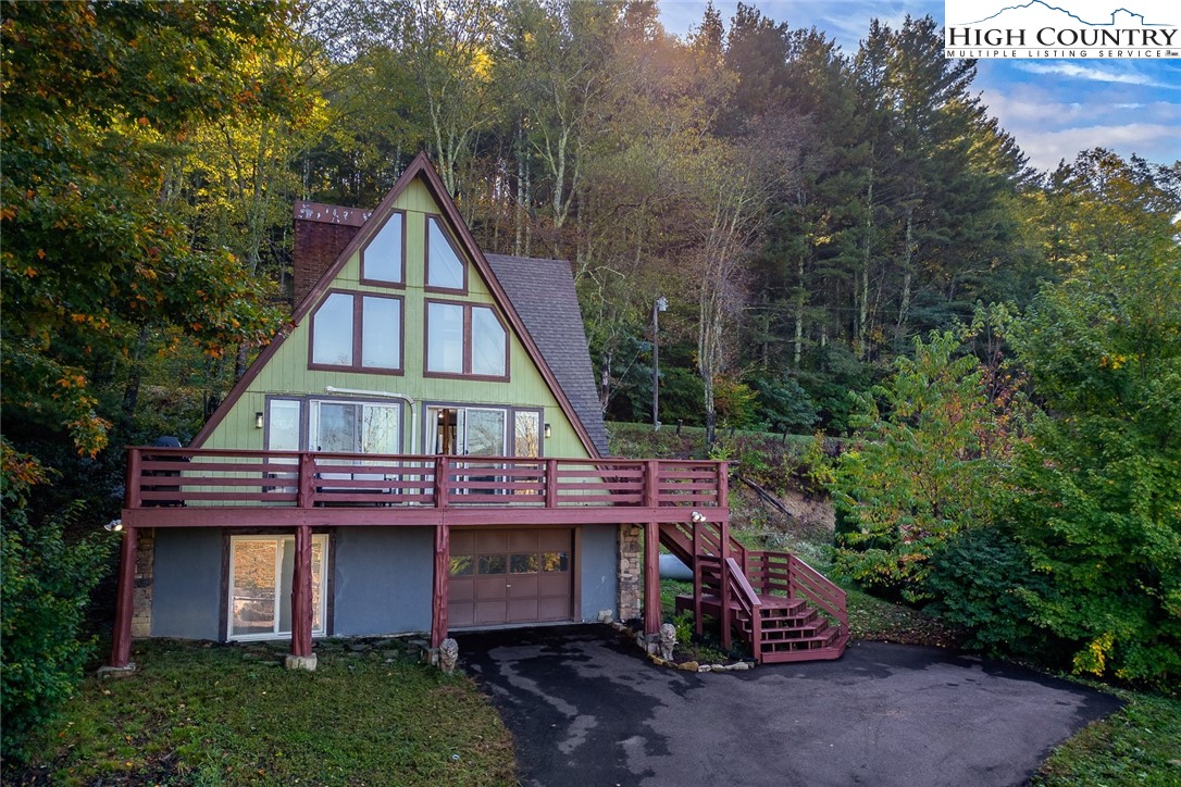 Renovated A-frame retreat with long-range mountain views. This beautifully renovated A-frame-style home blends timeless mountain charm with modern upgrades. Featuring four spacious bedrooms, this property showcases two impressive brick fireplaces, one in the soaring great room and another in the lower-level living space. A dedicated movie room offers the ideal spot for cozy nights in. A must-see! Go outside onto the large deck, where you’ll take in breathtaking long-range mountain views—a rare find within Newland city limits. The updated kitchen, open living areas, and unique architecture make this home stylish and functional. Additional features include a one-car garage for storage and convenience. Ideal as a family home, vacation retreat or investment, this A-frame gem combines scenic beauty with modern comfort in a prime location.
