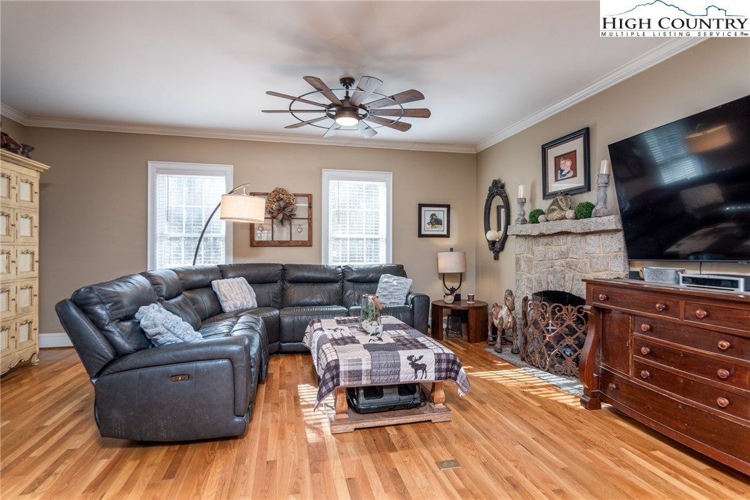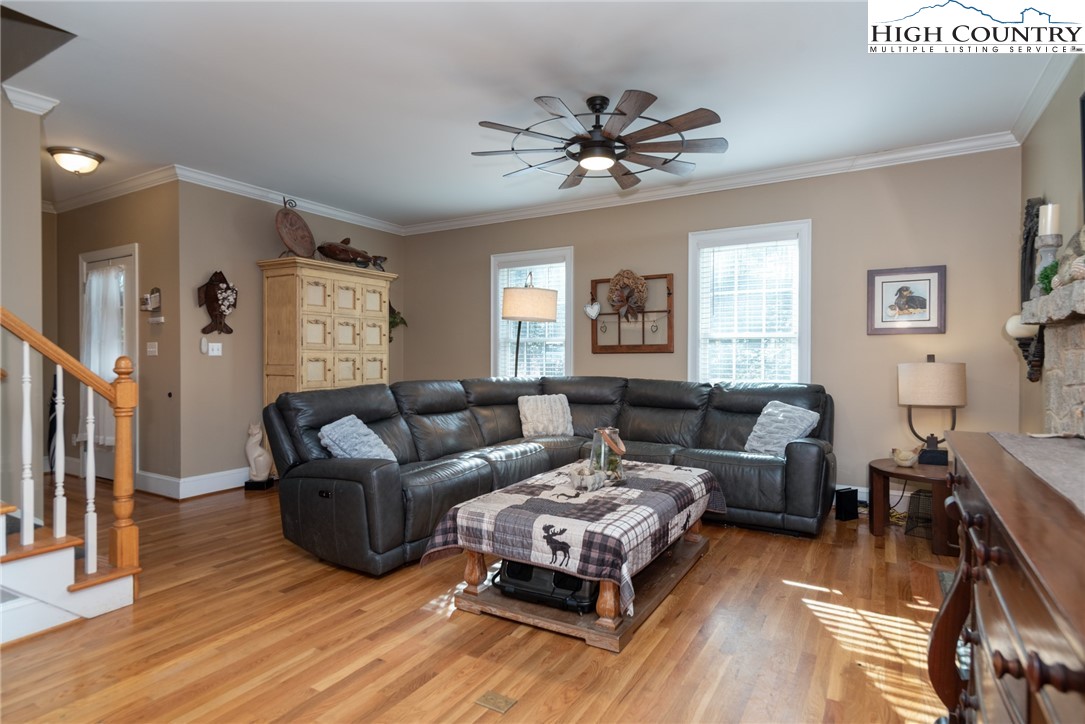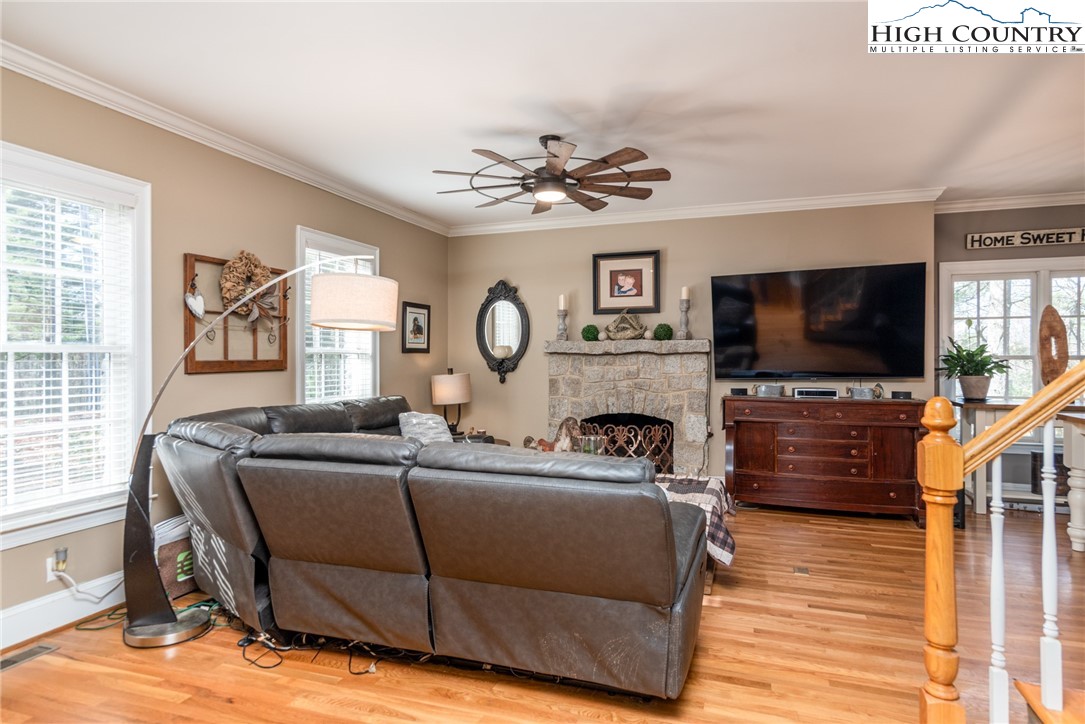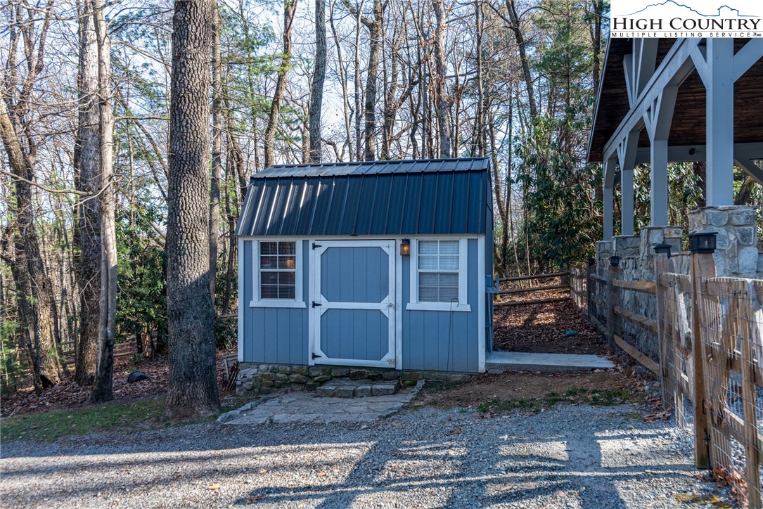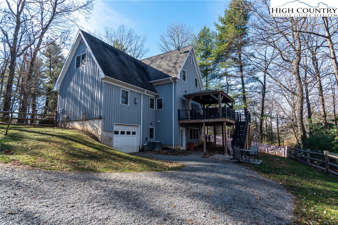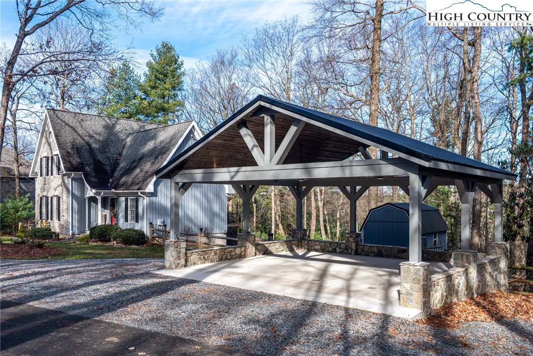 Envision residing in this well built home nestled within the High Meadows Country Club. Just a short golf cart ride to all the amenities this club offers. The exterior exudes grandeur with its stone foundation and custom hardwood siding. The expansive lot is landscaped and illuminated with lighting. A newly constructed detached carport adjoins a storage building which provides electricity. The carport provides over 600 sf of parking and/or gathering space. There is a fully fenced back yard. Upon entering the house, you will be greeted by nine-foot ceilings, crown molding, and hardwood floors. The first floor comprises a spacious primary bedroom with a walk-in closet and a full bathroom. An open living/dining area is adjacent, featuring a stone fireplace and a kitchen equipped with granite counters, custom cabinets, stainless steel appliances and access to the covered back patio. Hardwood flooring continues throughout the second floor, which includes two bedrooms, an office/media room with a closet and a full bathroom with a vaulted ceiling and skylight. The basement extends the living space, encompassing a one-car garage, a full bathroom, laundry area, a work area with walk-out access, and a spacious multi-purpose room currently utilized as a game room. Conveniently located just minutes from the Blue Ridge Parkway, this residence affords easy access to the region’s natural splendor and attractions.