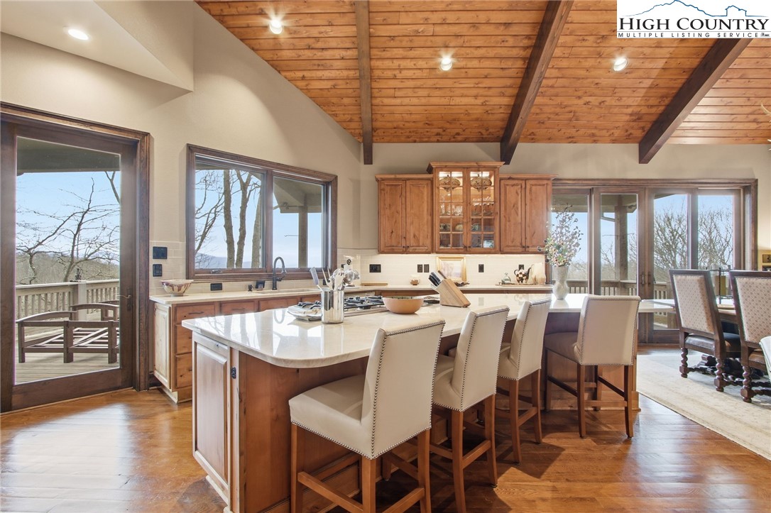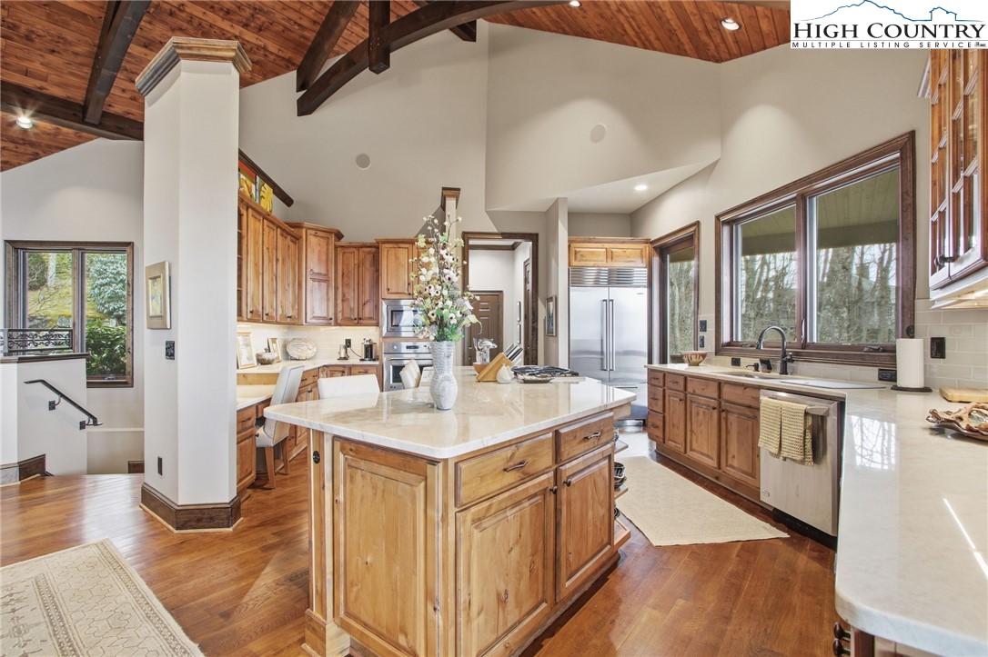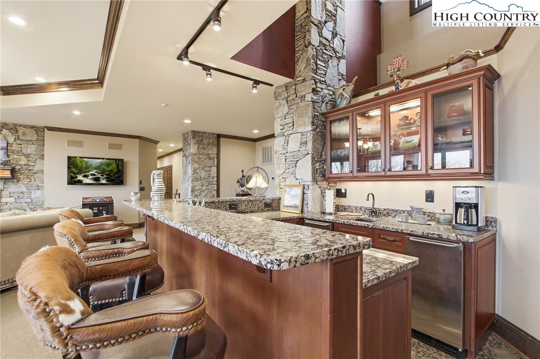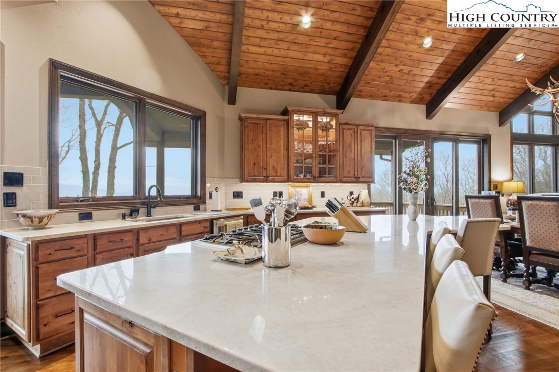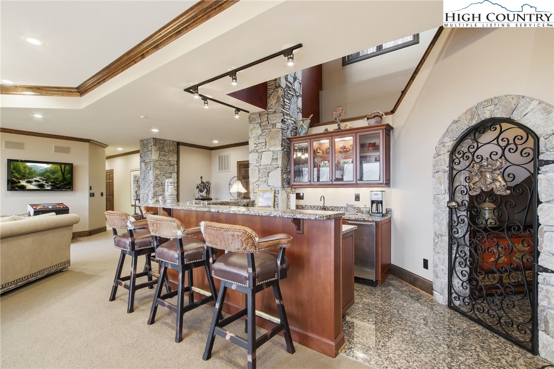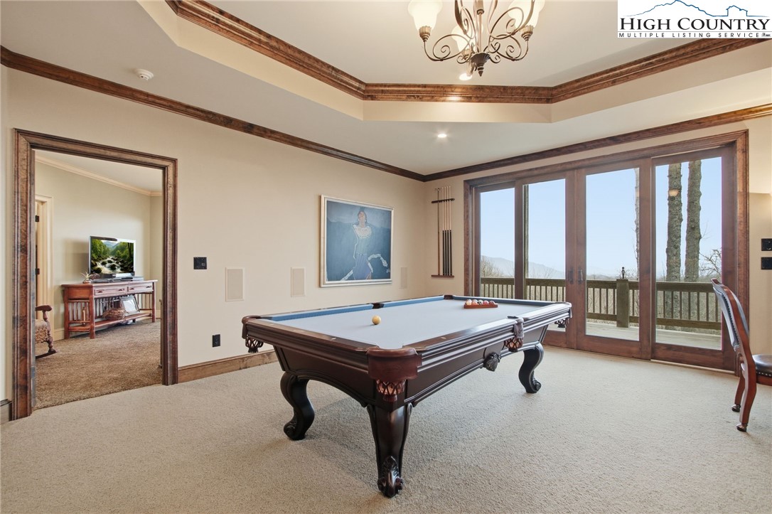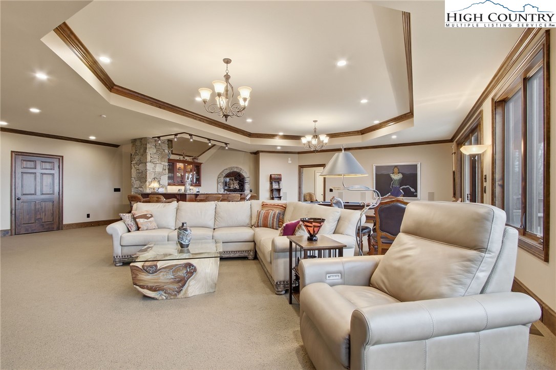 Perched at one of the premier elevations within the exclusive Elk River Club, this 4-bedroom, 3.5-bath mountain contemporary residence is a masterclass in craftsmanship. Designed to blur the line between luxury and nature, the home utilizes soaring glass walls and expansive decking to frame breathtaking, long-range vistas of the Blue Ridge Mountains stretching across North Carolina and Tennessee. The entry level is designed for both high-end entertaining and quiet retreat. The gourmet kitchen and dining area are a chef's dream, while the great room is anchored by dramatic tongue-and-groove ceilings and rich hardwood flooring. The Primary Suite serves as a private sanctuary, complete with its own fireplace. Living spaces transition seamlessly to covered and open-air outdoor areas—perfect for soaking in mountain sunsets. The versatile lower level offers a secondary hub for guests and recreation, featuring a central family room equipped with a custom bar and dedicated game area. Accommodations include a junior primary suite, plus two additional bedrooms and a shared bath. Every inch of this estate reflects meticulous attention to detail, from the intricate wood trim to the sophisticated material palette. This isn't just a home; it’s the realization of a lifestyle dream in one of the High Country’s most prestigious communities.