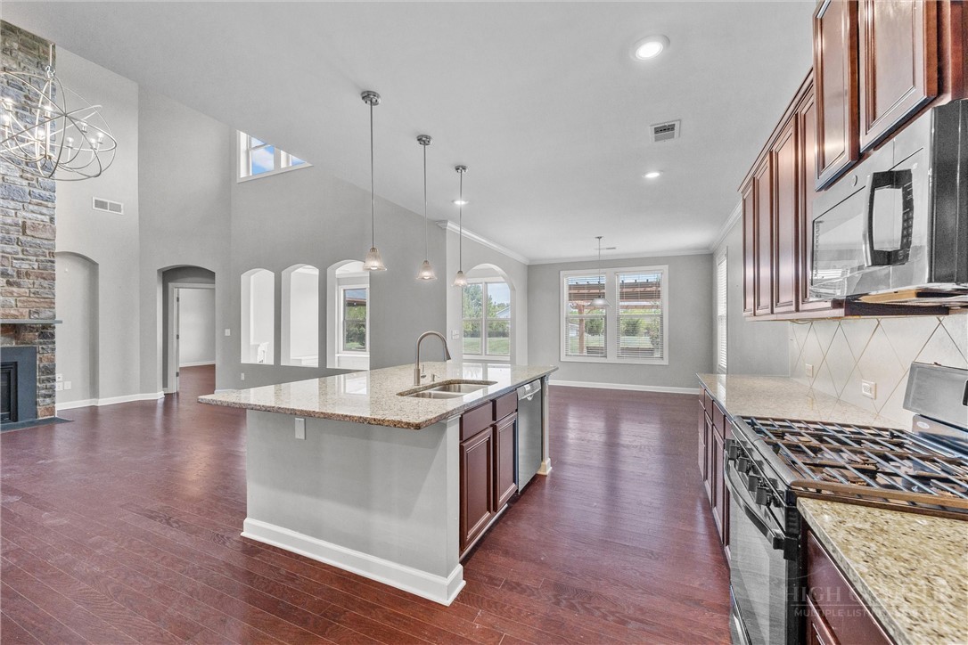 Welcome Home! Discover exceptional living in this stunning 5-bedroom, 3.5-bathroom home boasting an impressive 4,327 square feet of thoughtfully designed space. This masterfully constructed home delivers a perfect blend of elegance, comfort, and craftsmanship. The generous living areas flow seamlessly, offering versatile spaces ideal for both everyday living and entertaining. The main level has a beautiful kitchen with island and breakfast bar, as well as a gas range, dishwasher and microwave. There is a large, beautiful, primary bedroom which has an ensuite bath with garden tub, separate walk-in shower and separate water closet. The wonderful two-story living room has a gas log fireplace. There are also separate living room and dining room and a wonderful sunroom with electric fireplace that leads to the expansive rear patio and rear yard. The outdoor space truly sets this property apart. The patio features a fireplace, a nice covered area, that would be great for a hot tub, as well as an area with a pergola. The generous rear yard is fenced and is an inviting backdrop for relaxation, children, pets, gardening, and gatherings with family and friends. The home also has an irrigation system for the entire yard, as well as landscape lighting. The surrounding Matthews neighborhood delivers a wonderful lifestyle of convenience and community. Families will appreciate proximity to elementary, middle and high schools. Everyday errands are effortless with Target, Food Lion, and PetSmart just minutes away. This is more than a home — it's a lifestyle anchored by generous living space, and a neighborhood that fosters connection and convenience. Properties of this caliber in Matthews move quickly, so schedule your private showing today before this extraordinary opportunity is gone. Rooms/areas showing furniture and other items, other than washing machine and applices, have been virtually staged, and do not reflect the actual appearance of the property.