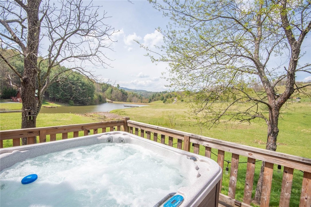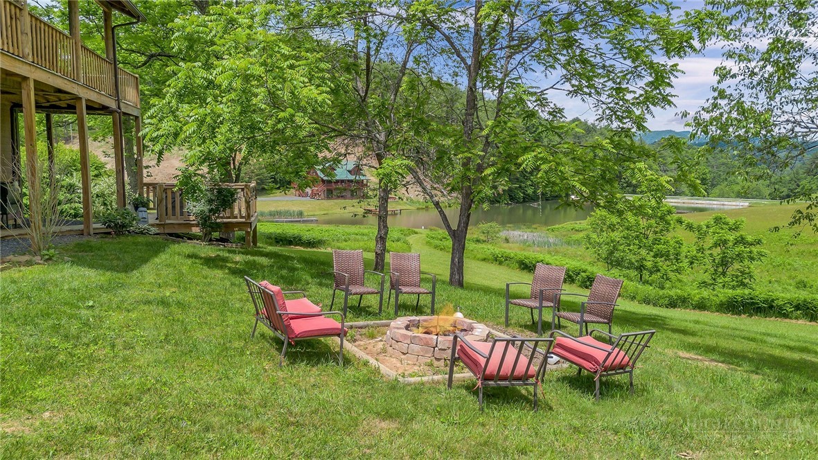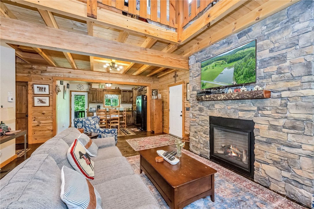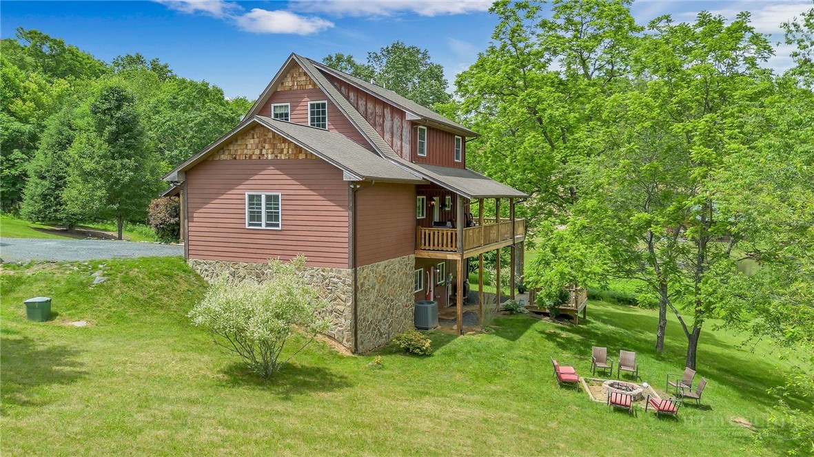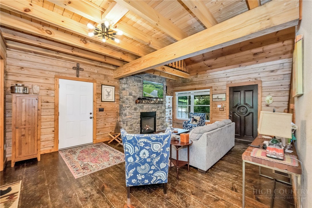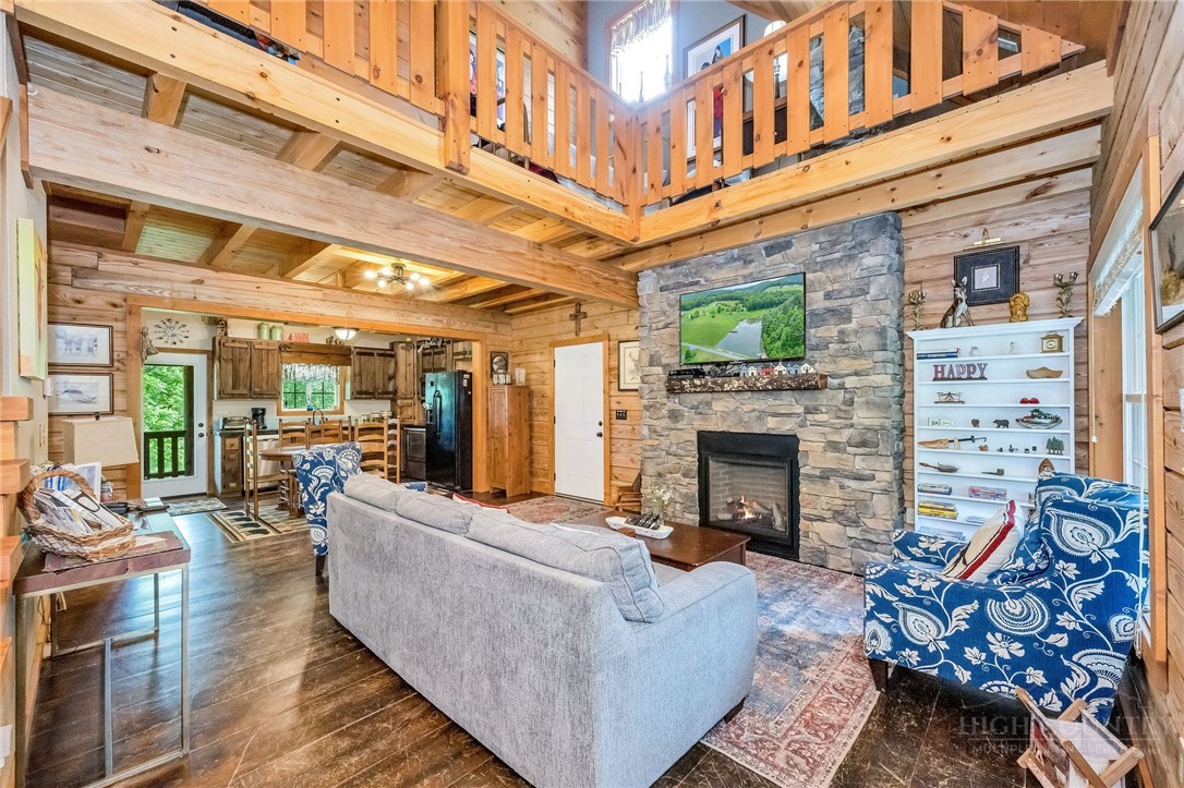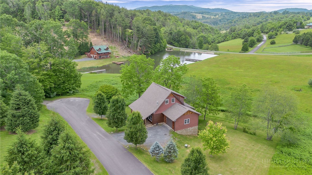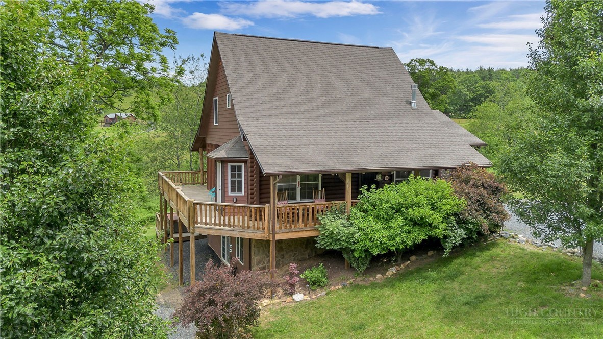 Charming Mountain Retreat with Pond Frontage in Canawhay — Set on a picturesque 2-acre lot overlooking a tranquil community pond, this beautifully crafted custom home offers the perfect blend of rustic charm and modern comfort. The inviting exterior features a mix of logs, board and batten, HardiePlank, and cedar shakes, all complemented by an expansive covered deck that spans the front and back — with an open-air section ideal for relaxing and enjoying peaceful water views. Inside, the main level welcomes you with a spacious open-concept design, where the living room and eat-in kitchen flow seamlessly together. A cozy stone fireplace anchors the space, creating a warm and inviting atmosphere for gathering. The kitchen features stainless steel appliances and distinctive concrete countertops for a unique, mountain-modern feel. Also on the main level: a guest bedroom with private en suite bath and deck access, a convenient half bath with laundry, and an attached one-car garage. Upstairs, a loft overlooks the main living area and leads to a spacious primary suite, complete with a whirlpool tub, walk-in tile shower, and thoughtful finishes throughout. The finished lower level offers excellent flexibility with a private entrance, efficiency kitchen, living area, bedroom, and full bath — ideal for guests, extended family, or additional rental potential. Offered fully furnished and with a strong short-term rental history, this home is perfectly suited as a full-time residence, mountain getaway, or income-producing investment. Located just minutes from New River State Park and a short drive to downtown West Jefferson, you’ll enjoy easy access to hiking, river activities, and all the charm of the High Country.