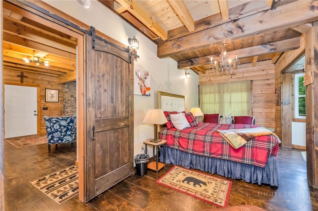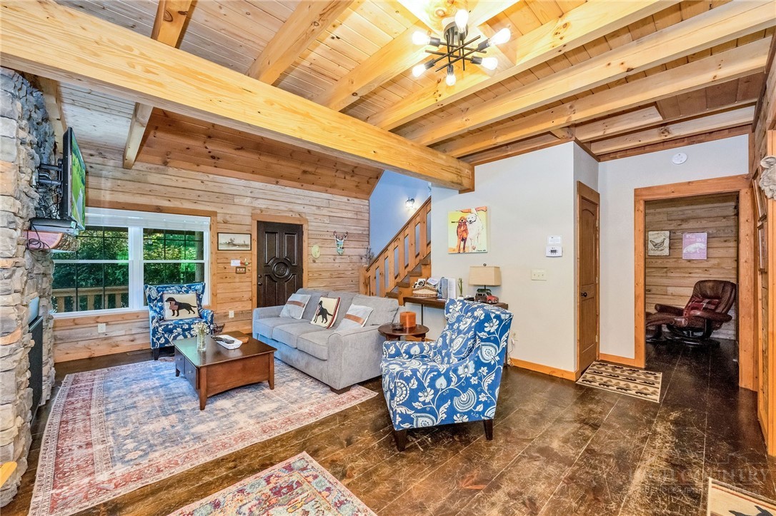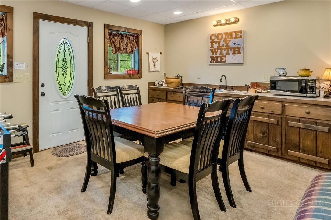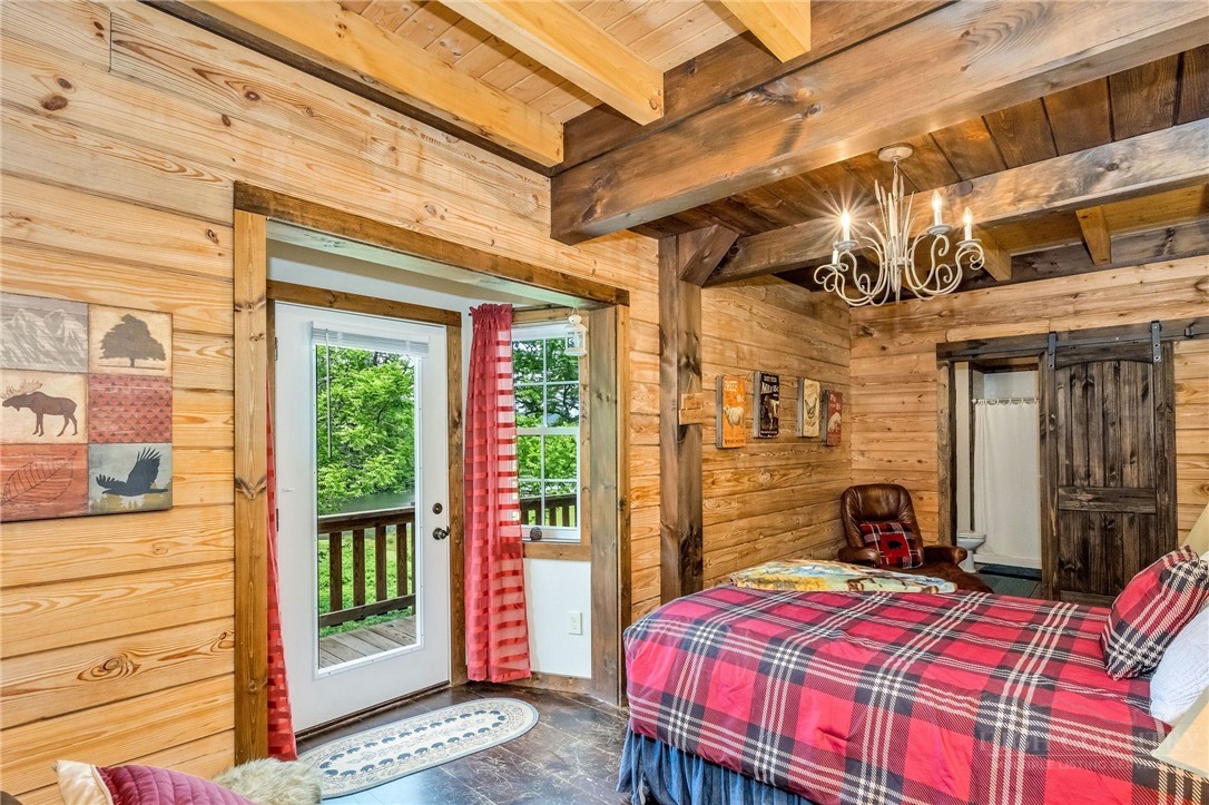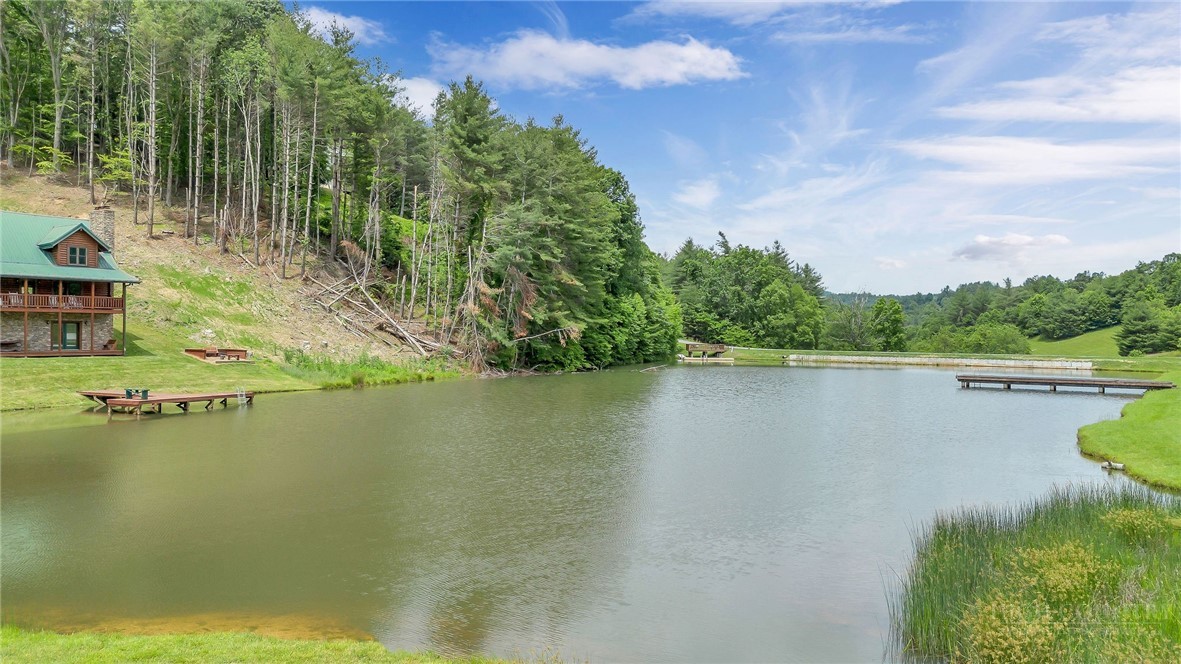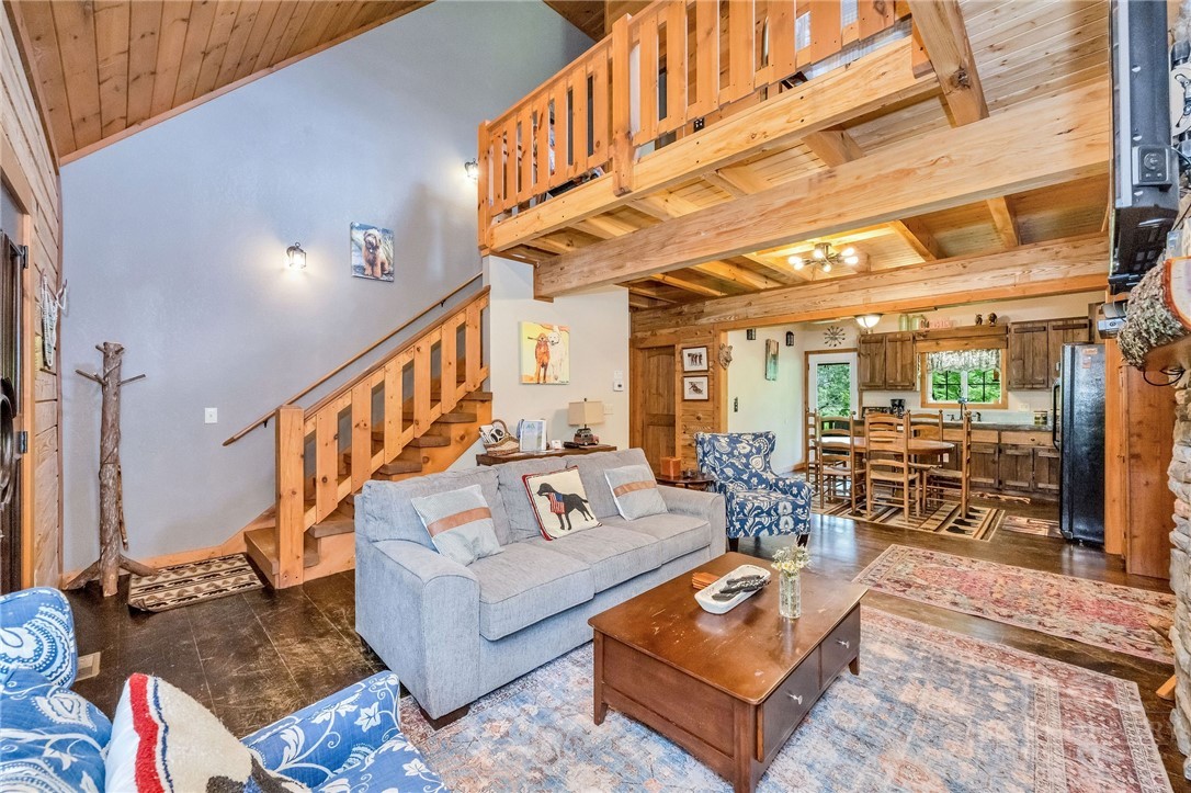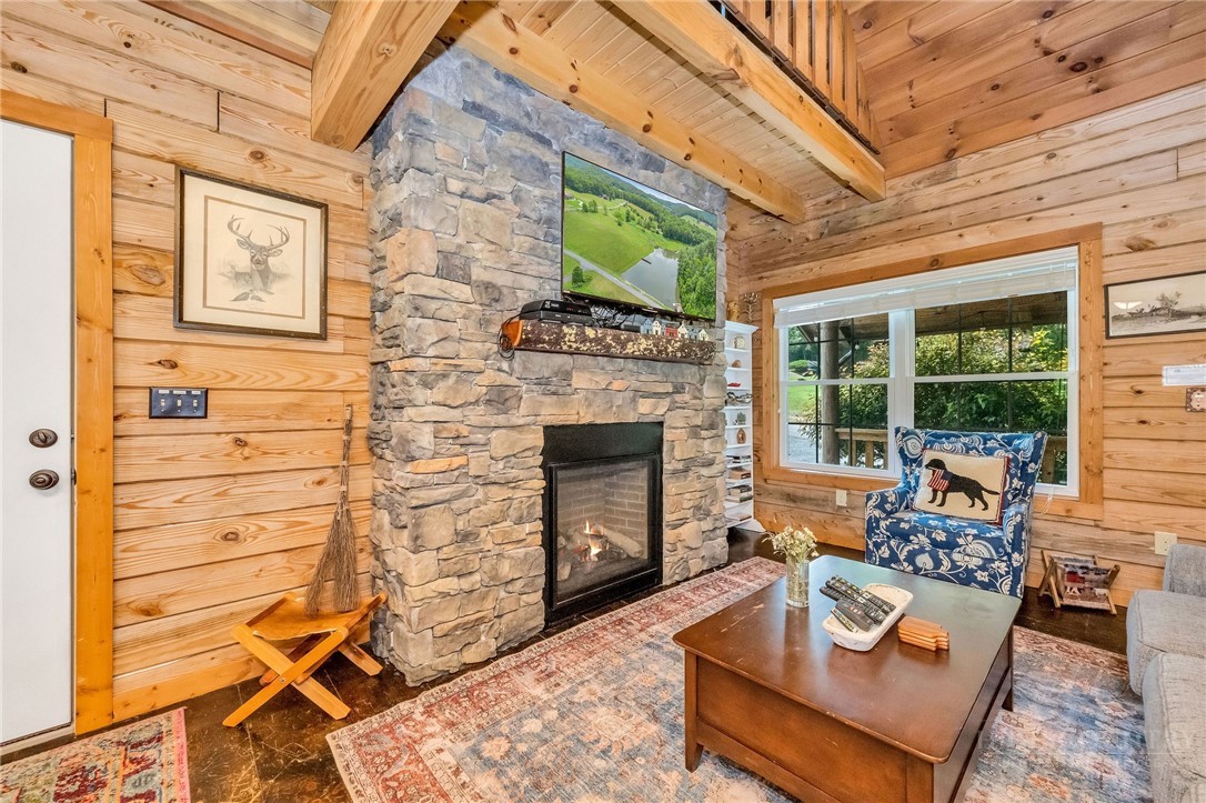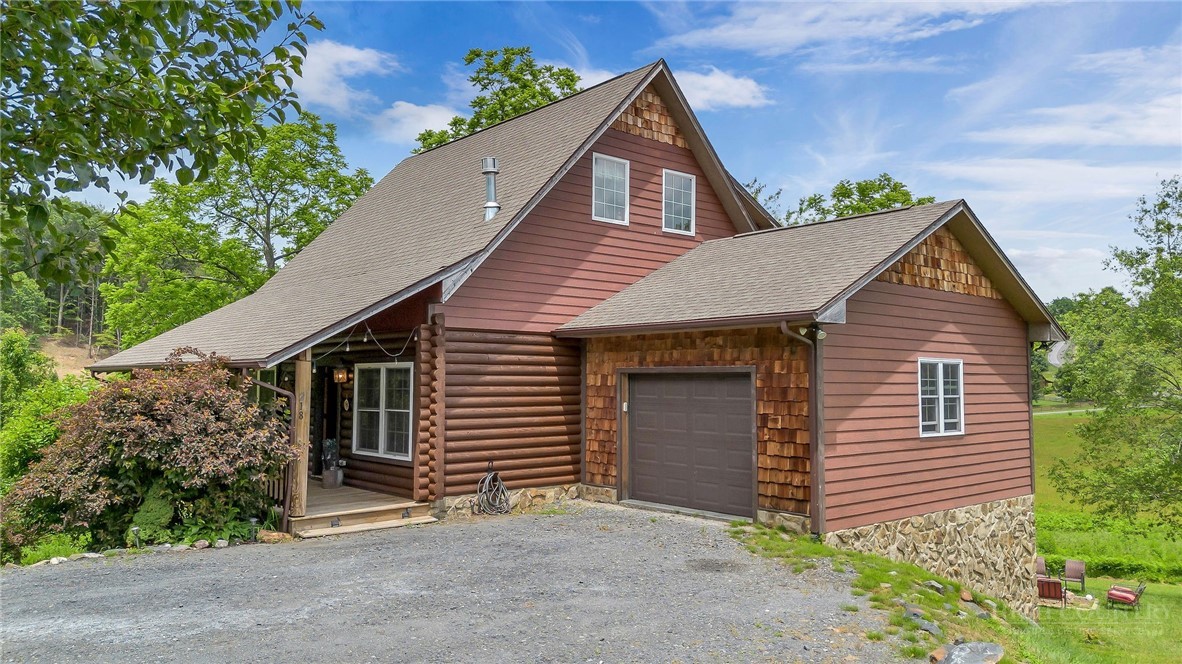 Charming Mountain Retreat with Pond Frontage in Canawhay — Set on a picturesque 2-acre lot overlooking a tranquil community pond, this beautifully crafted custom home offers the perfect blend of rustic charm and modern comfort. The inviting exterior features a mix of logs, board and batten, HardiePlank, and cedar shakes, all complemented by an expansive covered deck that spans the front and back — with an open-air section ideal for relaxing and enjoying peaceful water views. Inside, the main level welcomes you with a spacious open-concept design, where the living room and eat-in kitchen flow seamlessly together. A cozy stone fireplace anchors the space, creating a warm and inviting atmosphere for gathering. The kitchen features stainless steel appliances and distinctive concrete countertops for a unique, mountain-modern feel. Also on the main level: a guest bedroom with private en suite bath and deck access, a convenient half bath with laundry, and an attached one-car garage. Upstairs, a loft overlooks the main living area and leads to a spacious primary suite, complete with a whirlpool tub, walk-in tile shower, and thoughtful finishes throughout. The finished lower level offers excellent flexibility with a private entrance, efficiency kitchen, living area, bedroom, and full bath — ideal for guests, extended family, or additional rental potential. Offered fully furnished and with a strong short-term rental history, this home is perfectly suited as a full-time residence, mountain getaway, or income-producing investment. Located just minutes from New River State Park and a short drive to downtown West Jefferson, you’ll enjoy easy access to hiking, river activities, and all the charm of the High Country.